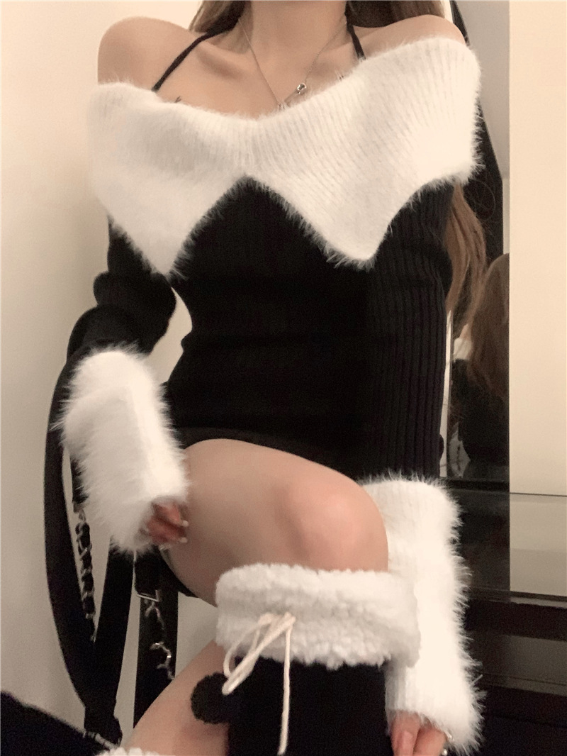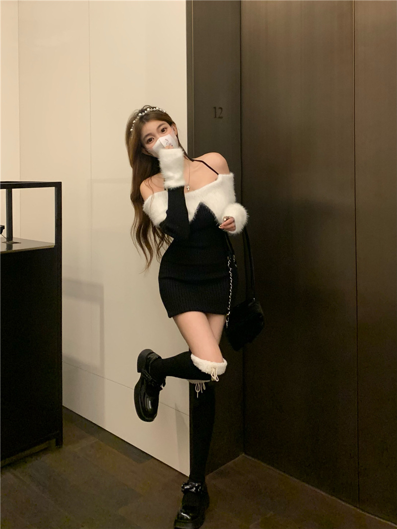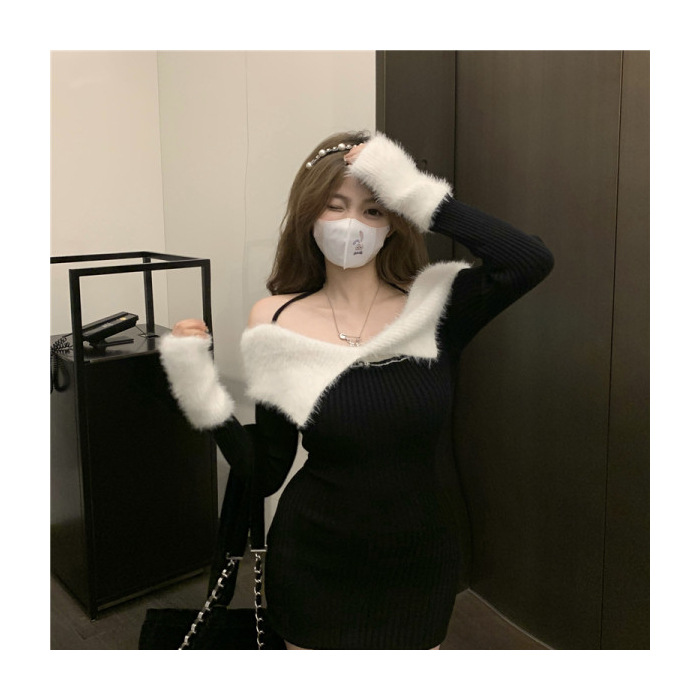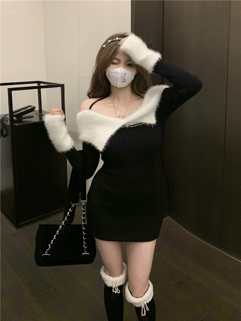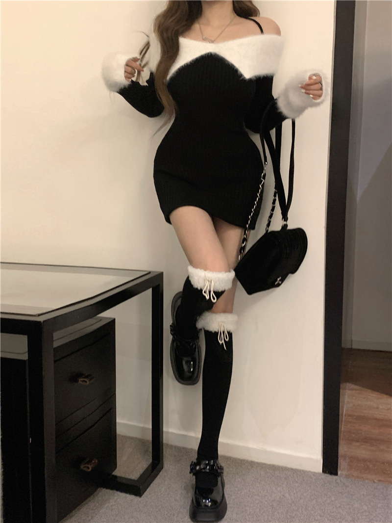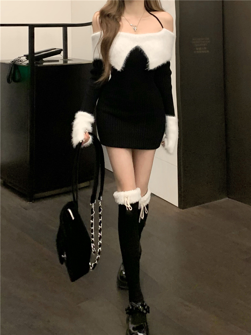 가을과 겨울 새로운 빨간 크리스마스 분위기 섹시한 엉덩이 스커트 여성 어깨 니트 스웨터 원피스 여성 의류스토어 가기