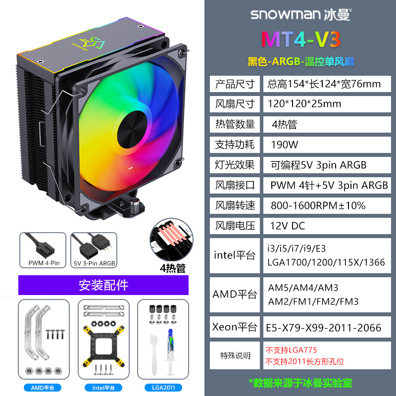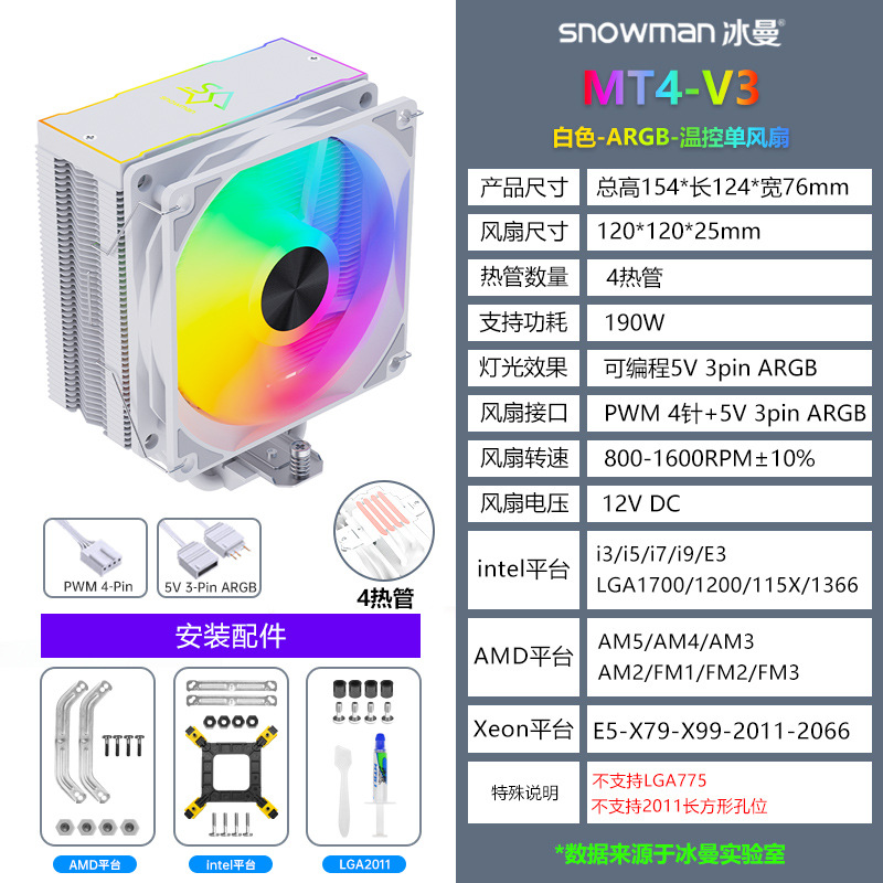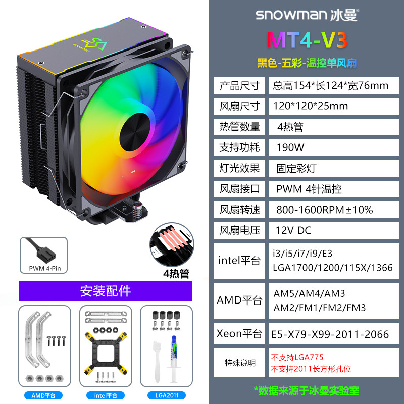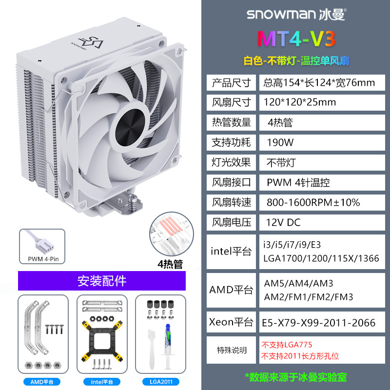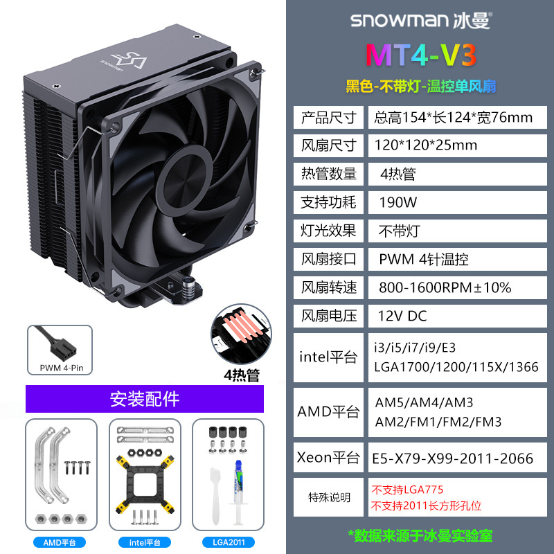 SNOWMAN Bingman MT4-V3 공랭식 4 히트 파이프 CPU 라디에이터 1700 컴퓨터 X99 팬 2011AM4AM5