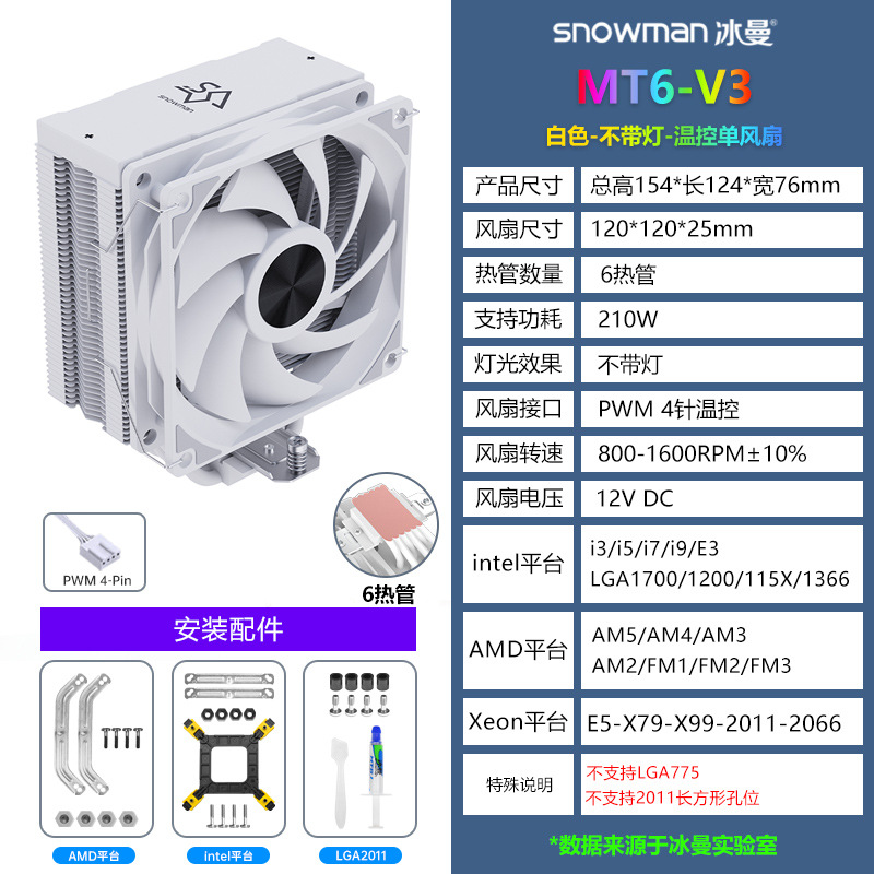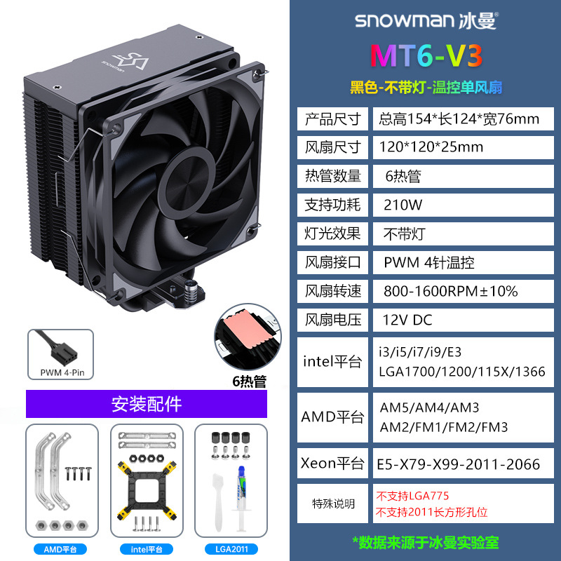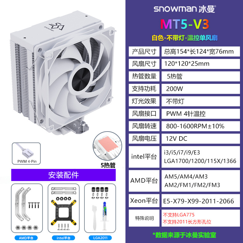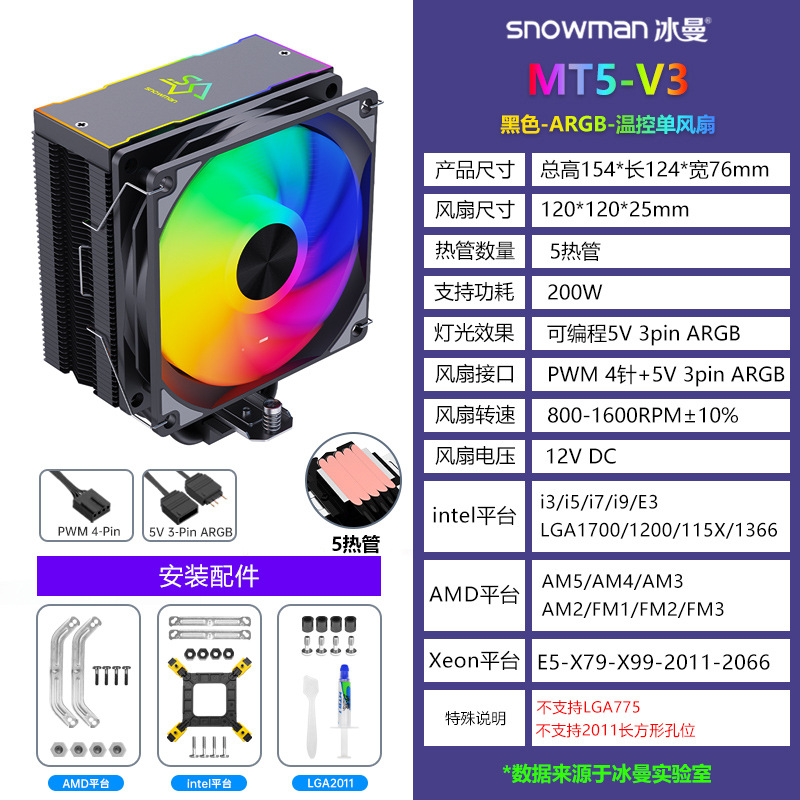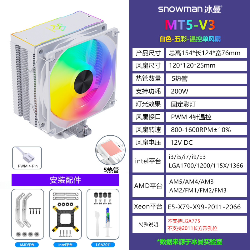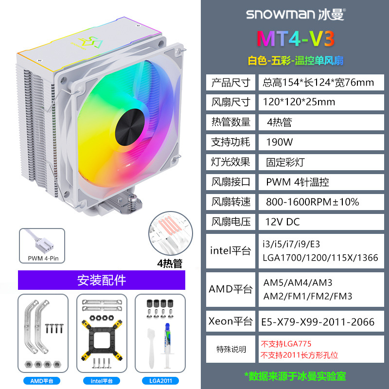SNOWMAN Bingman MT4-V3 공랭식 4 히트 파이프 CPU 라디에이터 1700 컴퓨터 X99 팬 2011AM4AM5