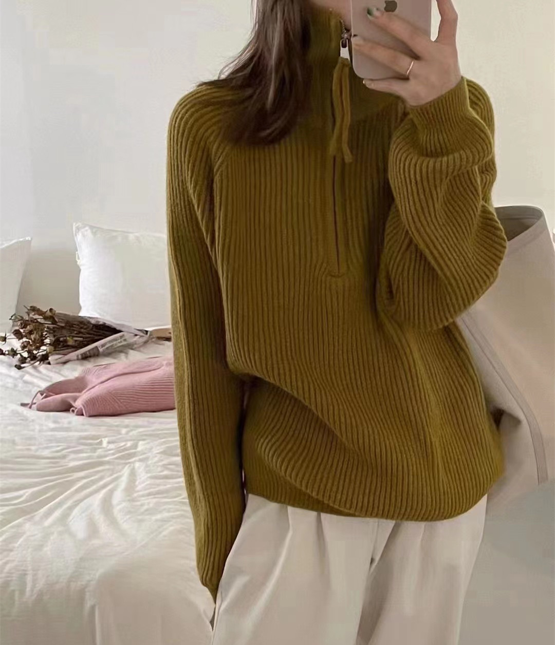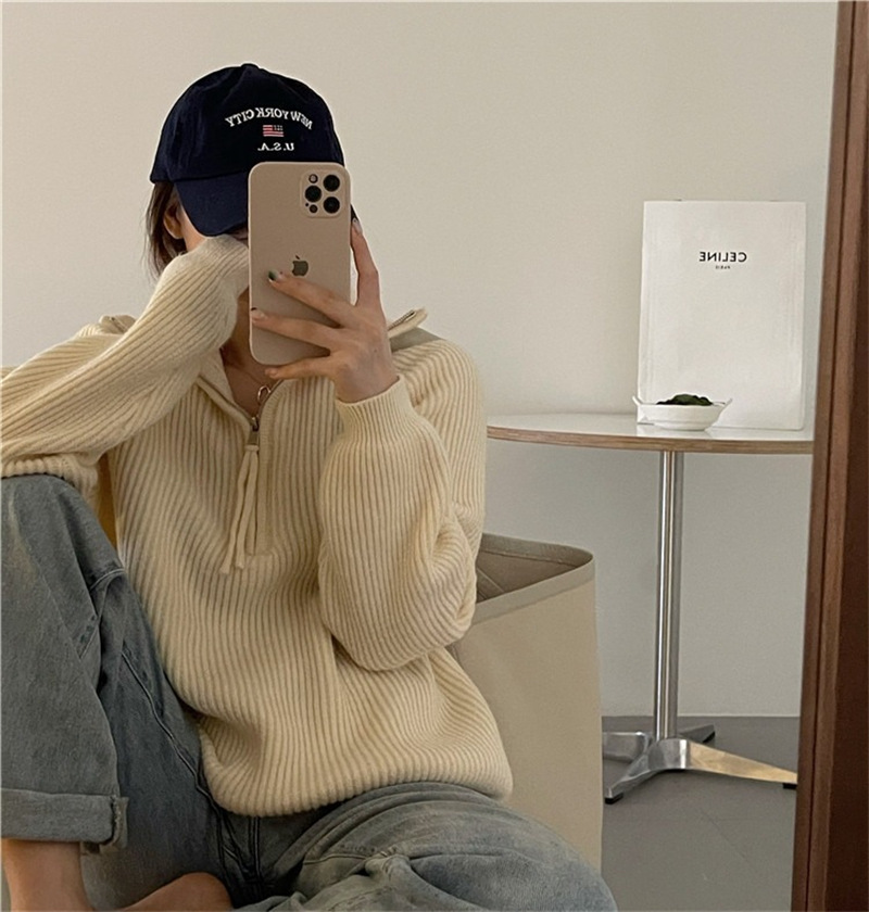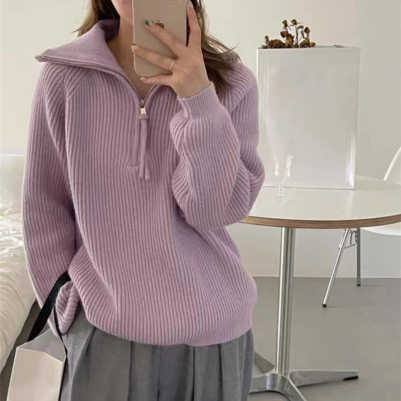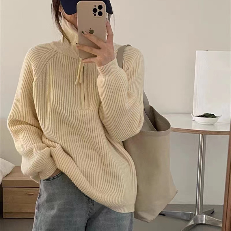 가을과 겨울 새로운 한국 하이 엔드 센스 하프 지퍼 수직 칼라 핏 스트립 느슨한 스웨터 코트 여성용 긴팔 스웨터 탑스토어 가기