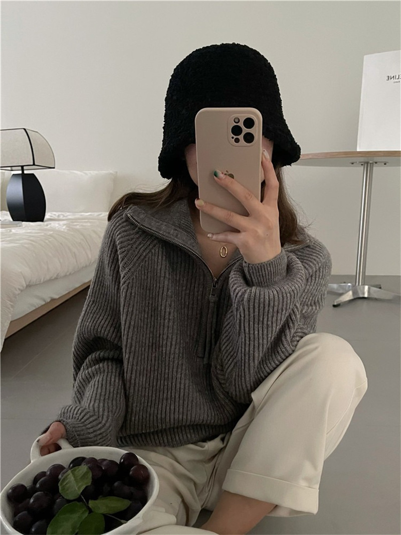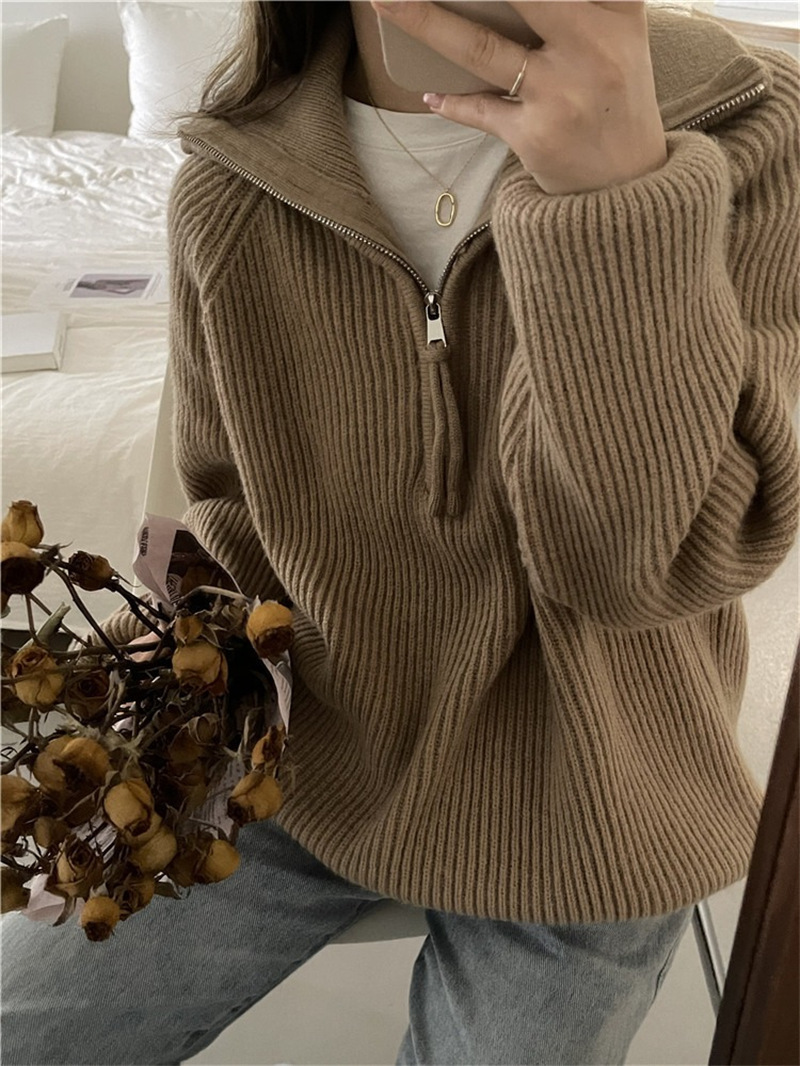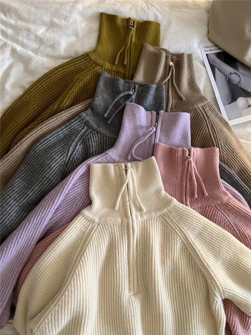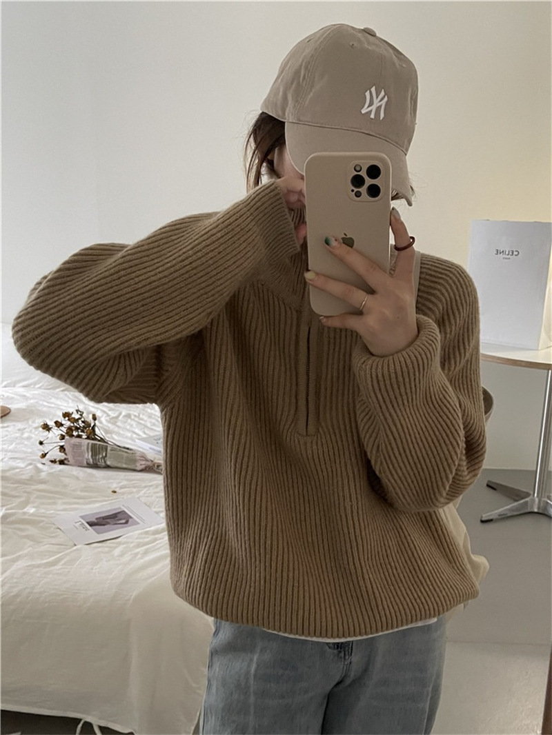 가을과 겨울 새로운 한국 하이 엔드 센스 하프 지퍼 수직 칼라 핏 스트립 느슨한 스웨터 코트 여성용 긴팔 스웨터 탑