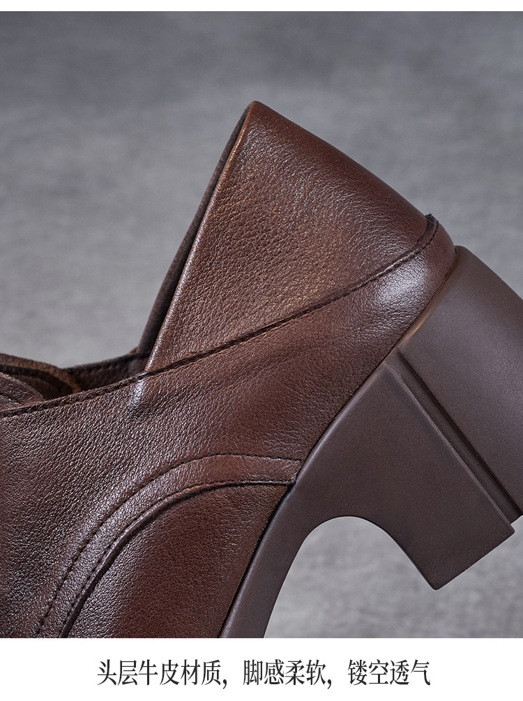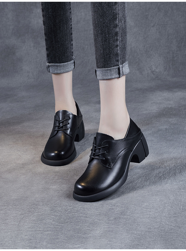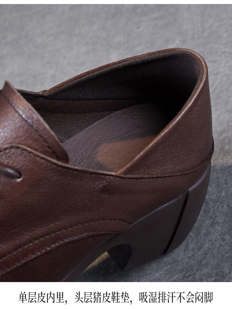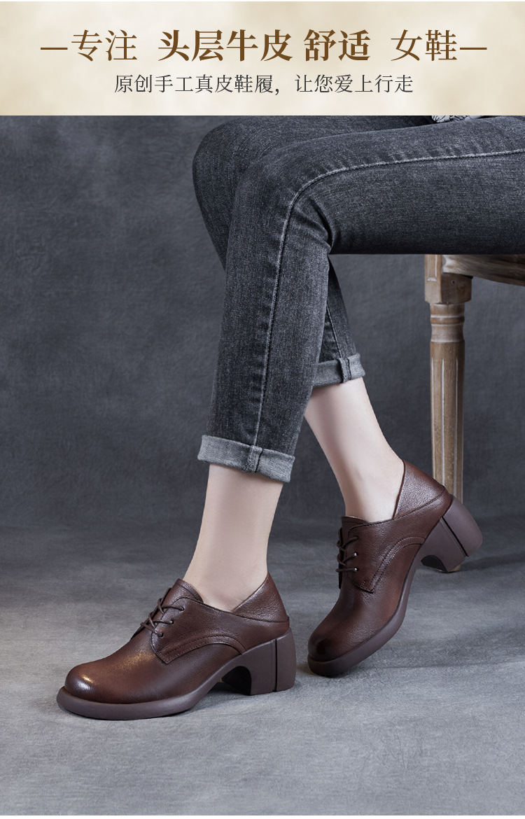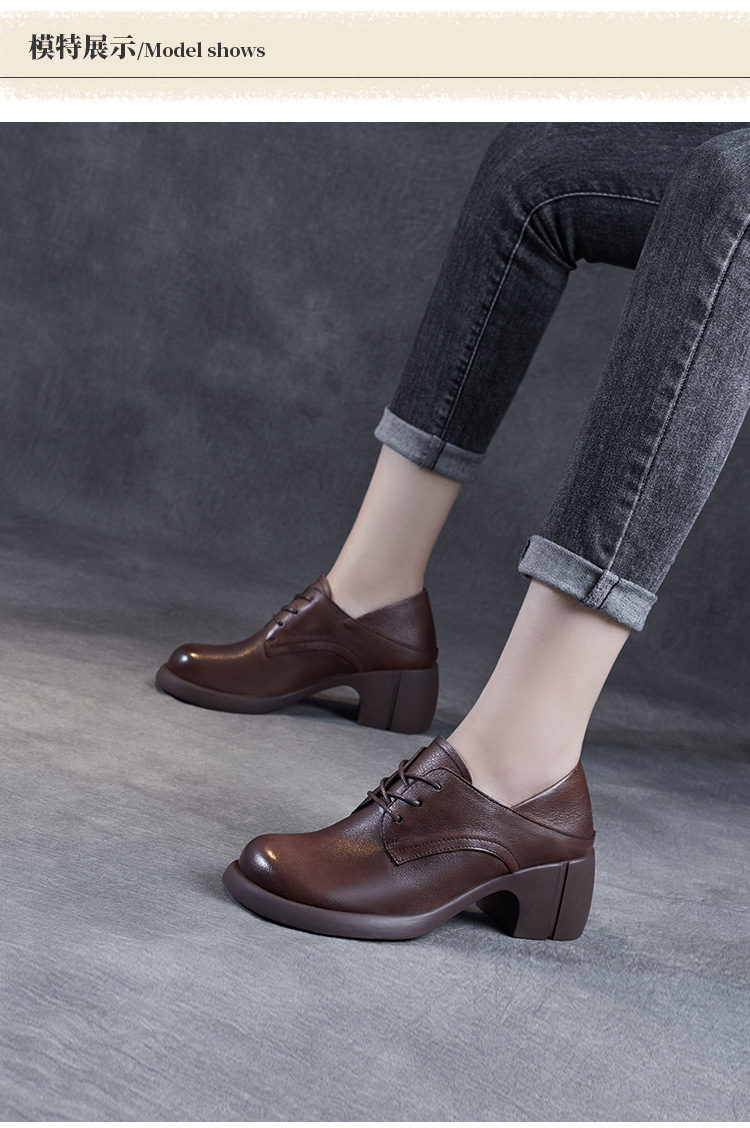 정품 가죽 여성 신발 깊은 입 레이스 업 청키 힐 싱글 레이어 신발 여성의 2024 봄/가을 새로운 간단한 미드 힐 로퍼 전문 신발스토어 가기