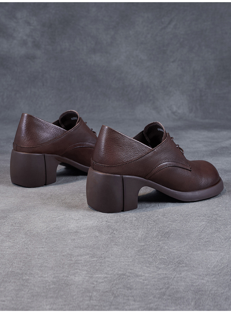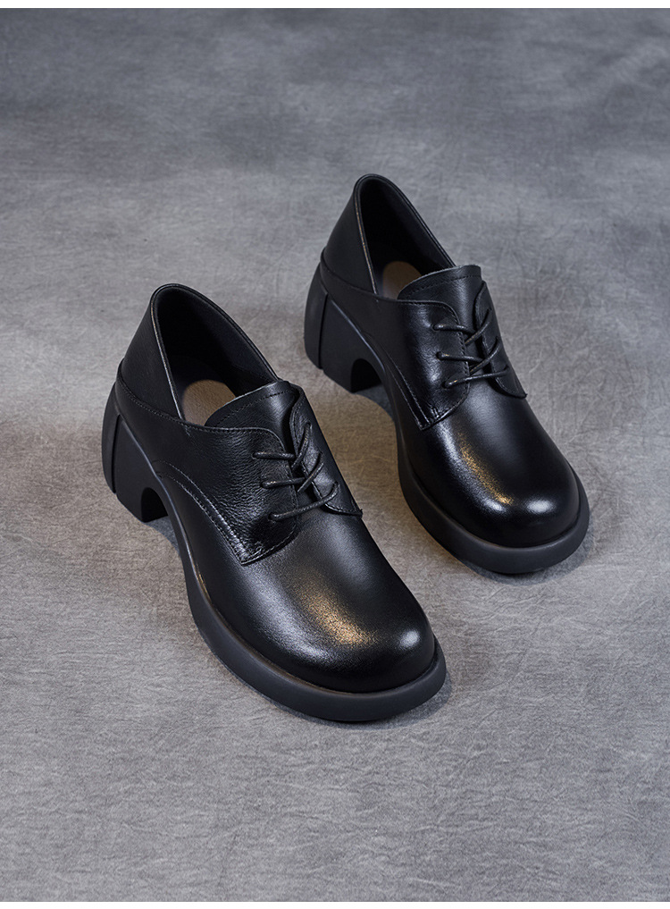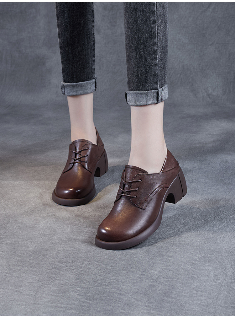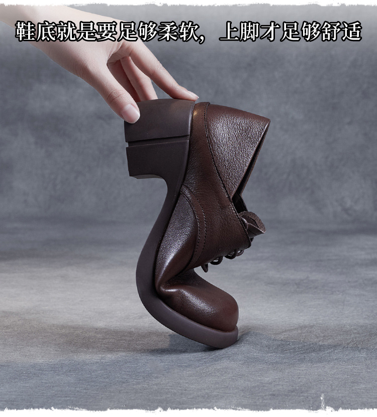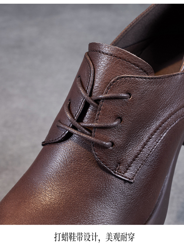 정품 가죽 여성 신발 깊은 입 레이스 업 청키 힐 싱글 레이어 신발 여성의 2024 봄/가을 새로운 간단한 미드 힐 로퍼 전문 신발스토어 가기