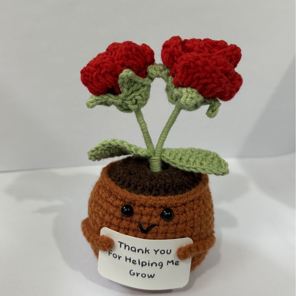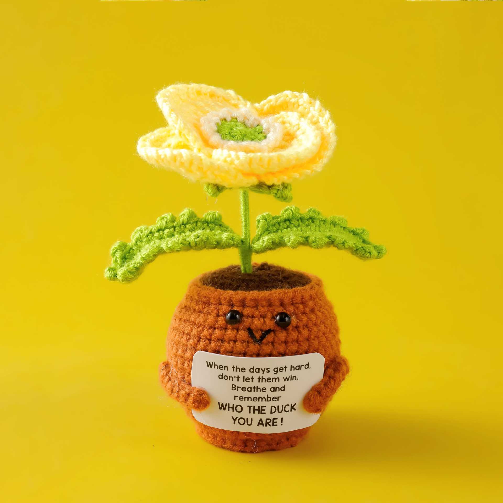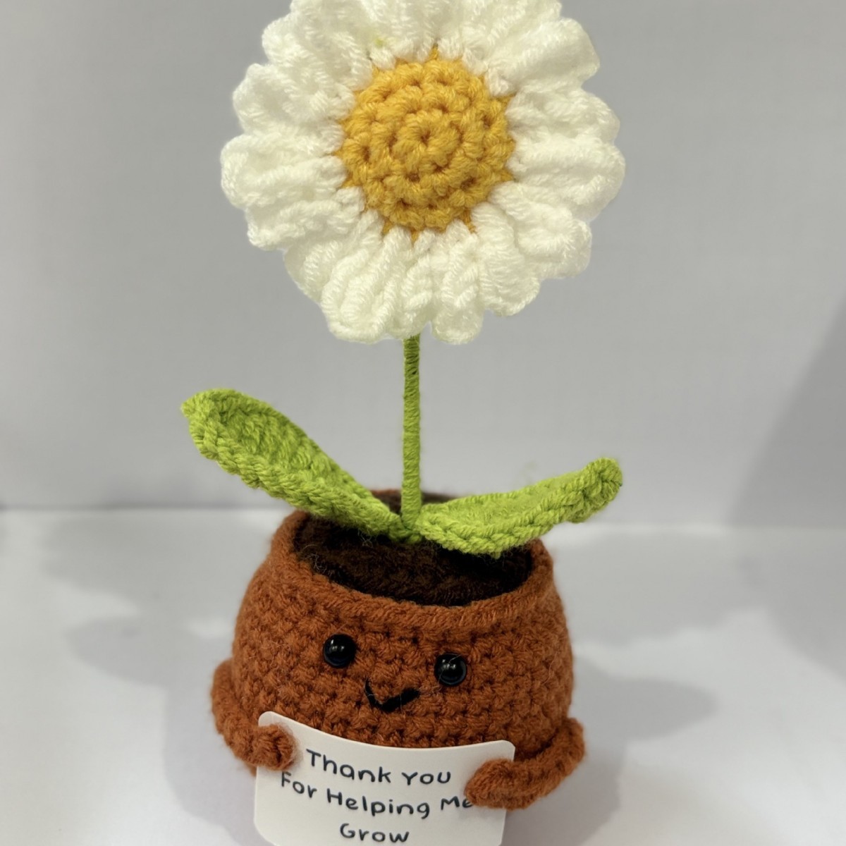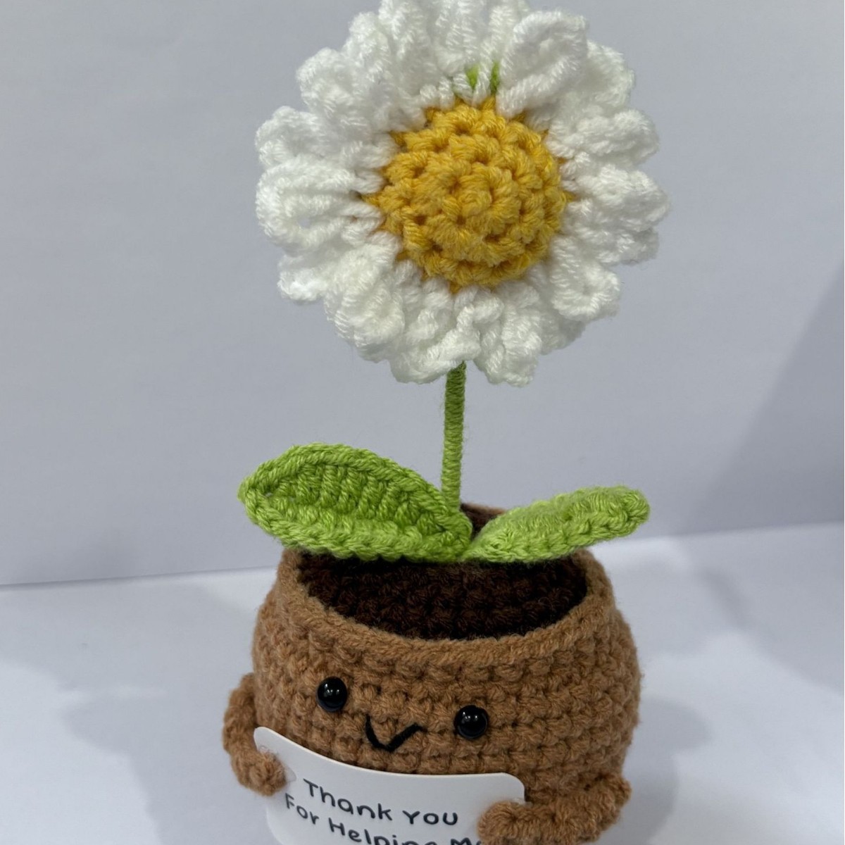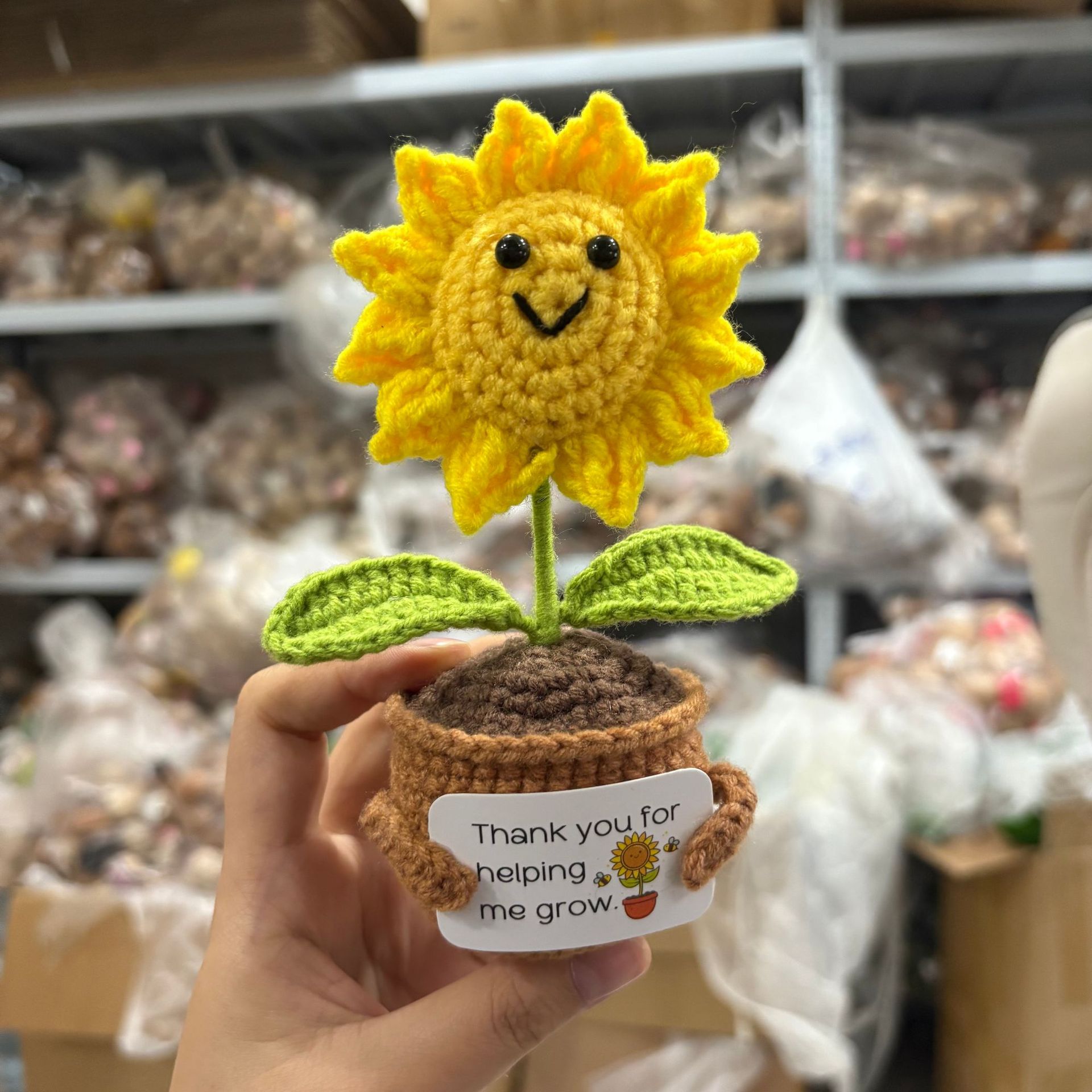 완성 된 양모 손으로 짠 긍정적 인 감자 인형 짠 화분 장식 뜨개질 긍정적 인 에너지 인공 꽃과 녹색 식물