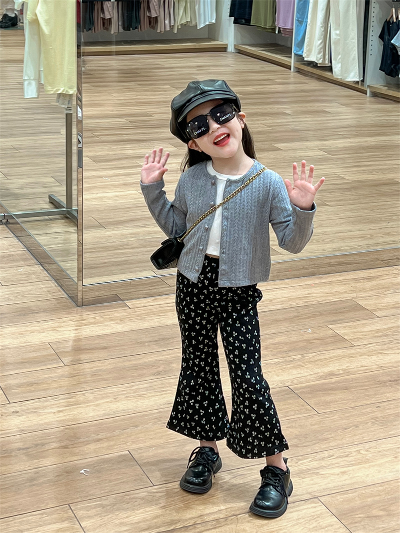 가을 2024 새로운 한국 스타일 아동복 소녀 영국 스타일 니트 카디건 재킷 체리 자카드 플래 바지