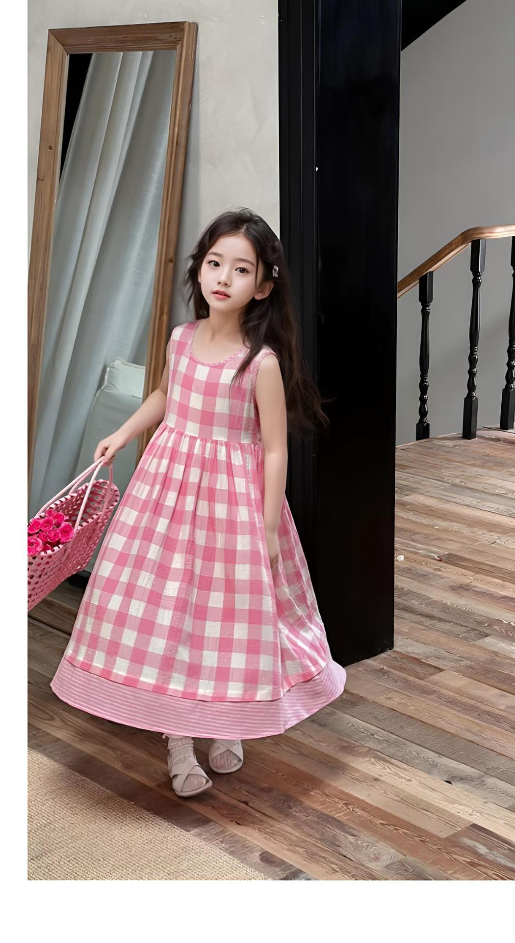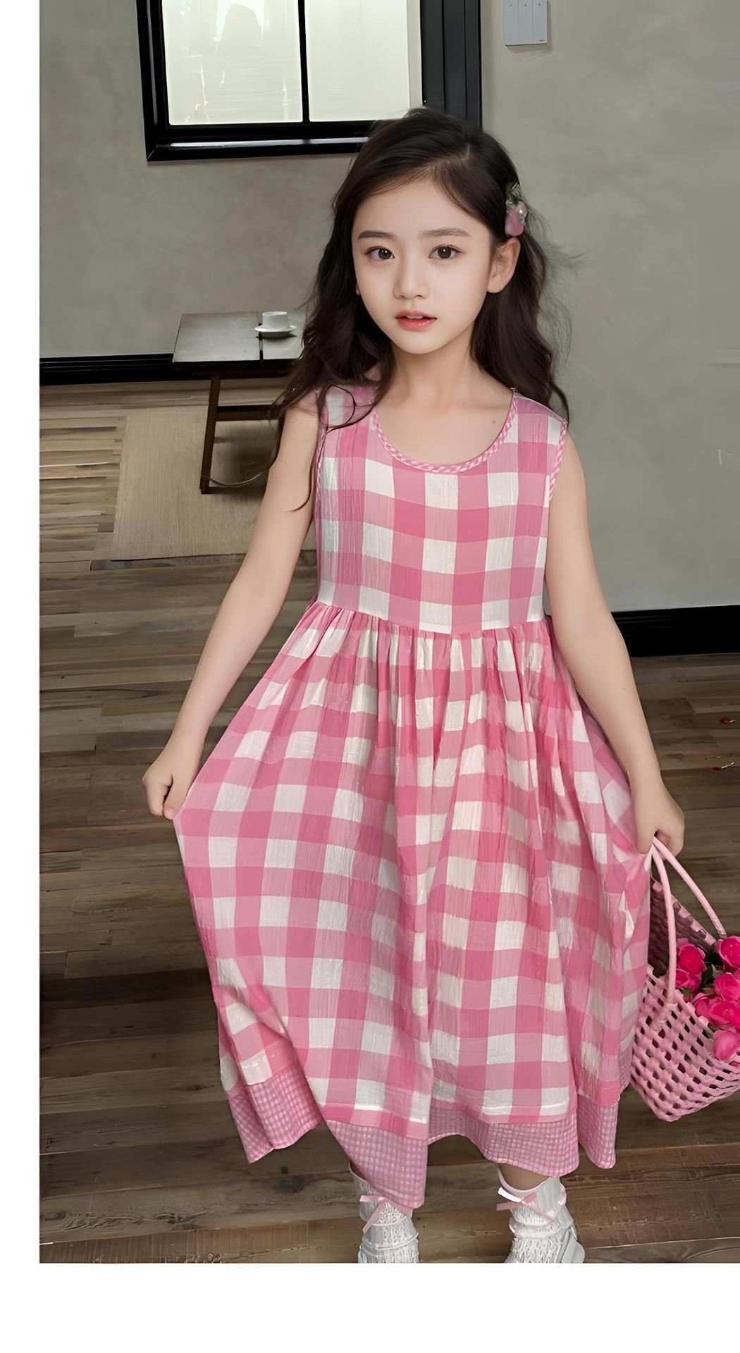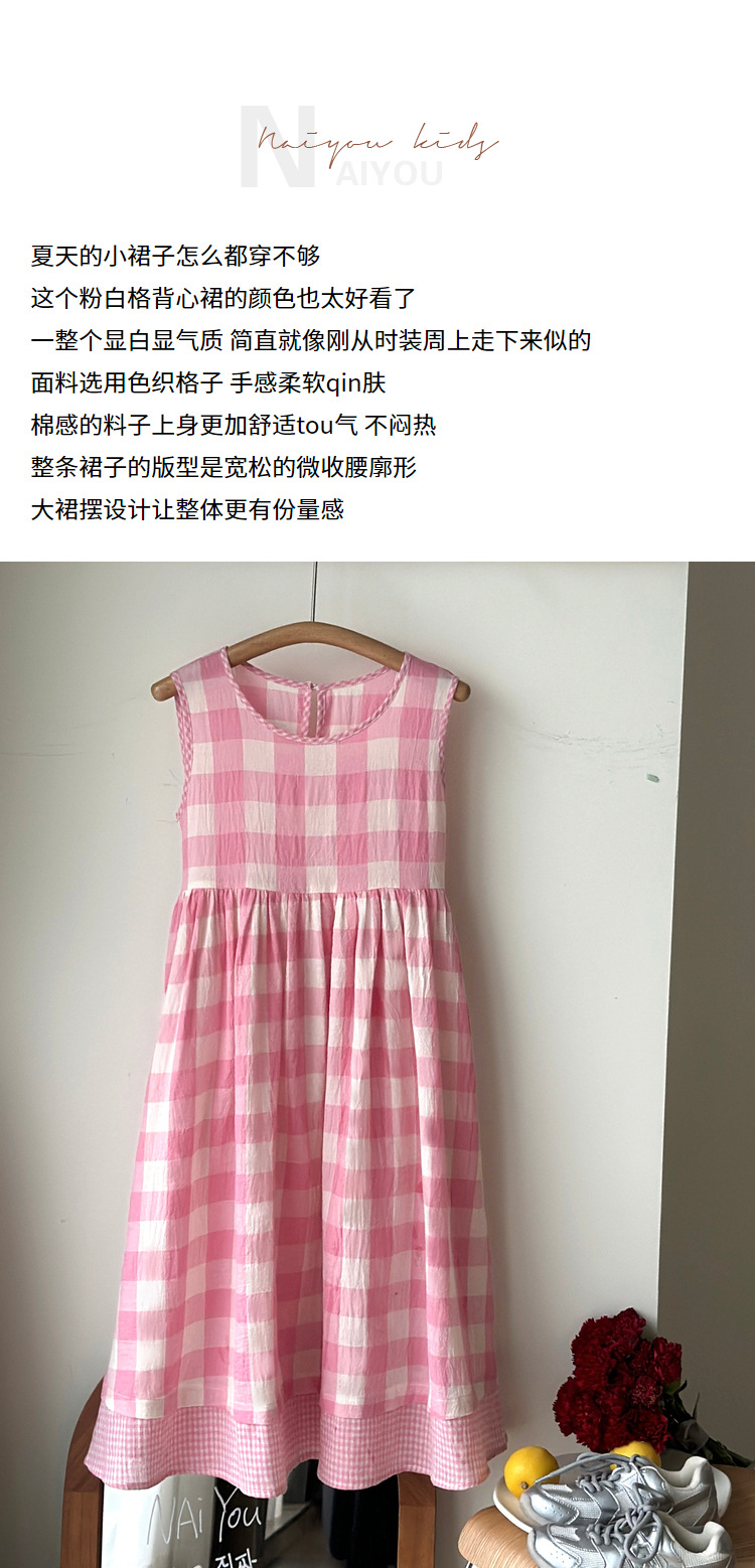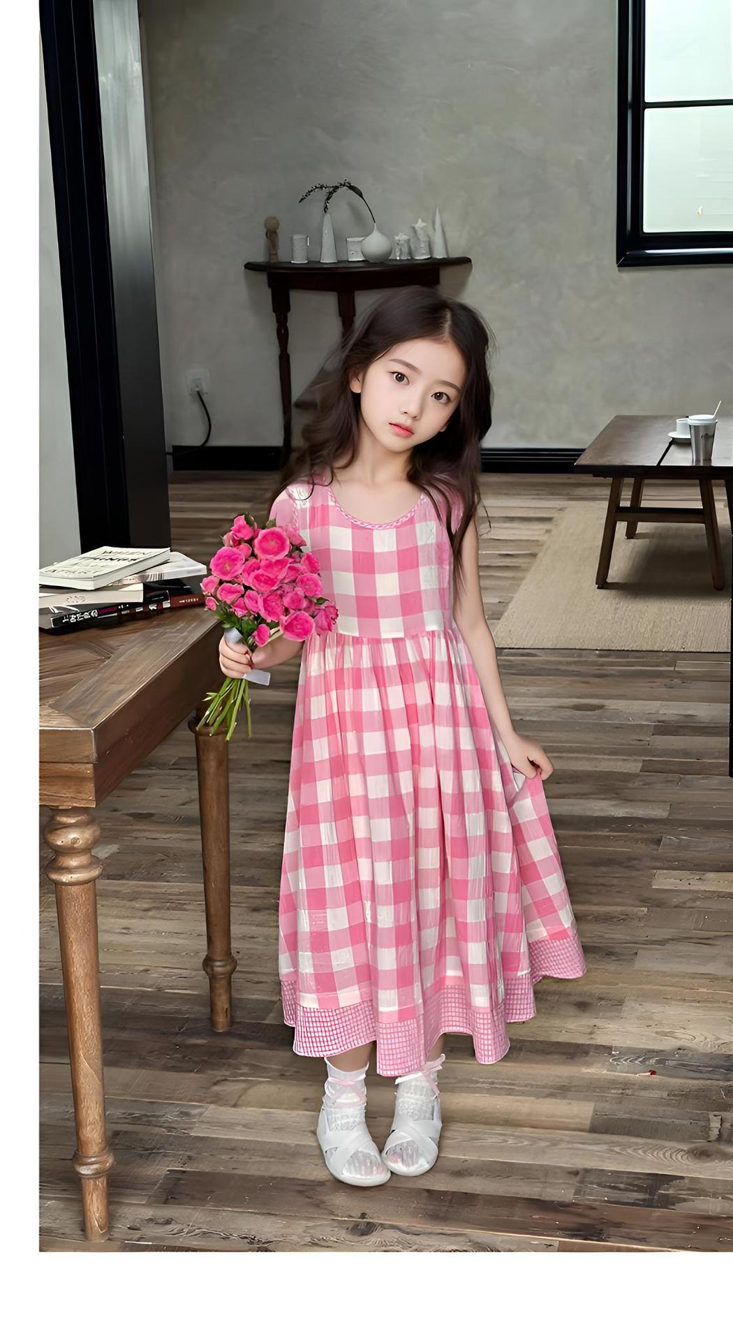 격자 무늬 긴 원피스 소녀 원피스 핑크 여름 해변 어린이 치마 민소매 면 소녀 공주 치마스토어 가기