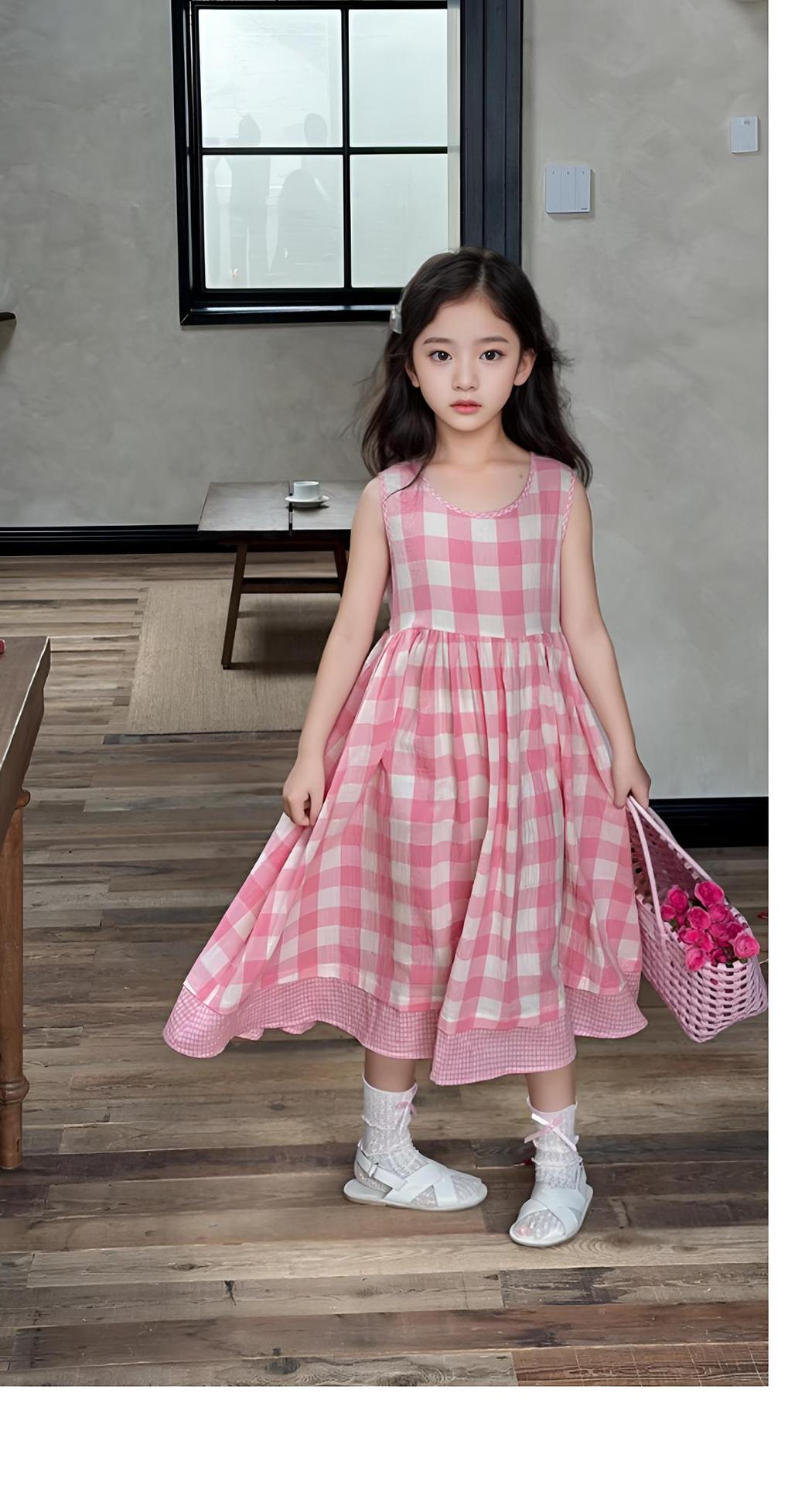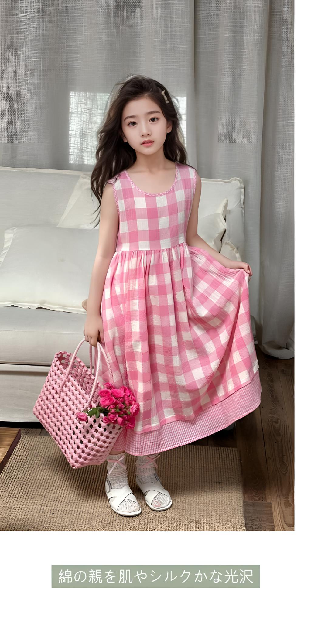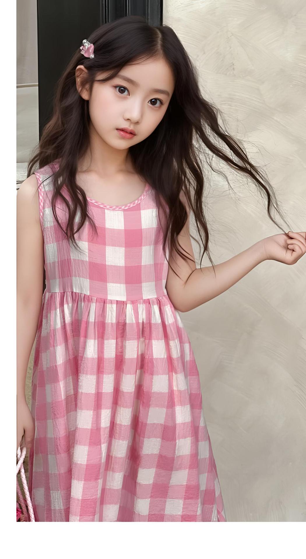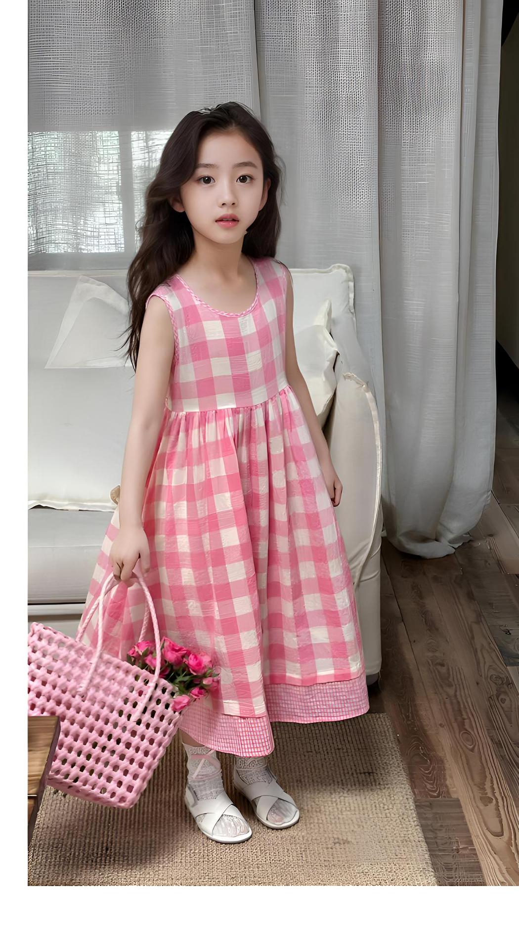 격자 무늬 긴 원피스 소녀 원피스 핑크 여름 해변 어린이 치마 민소매 면 소녀 공주 치마스토어 가기