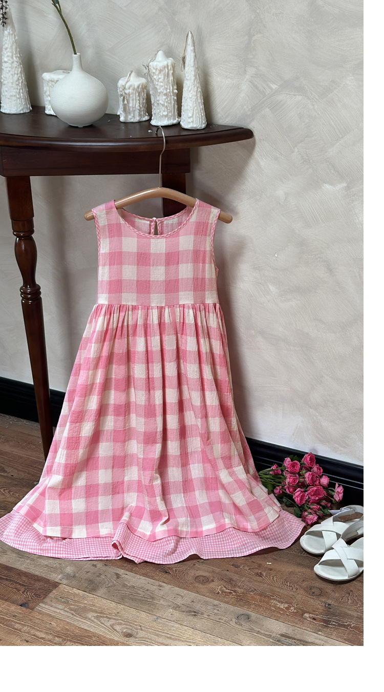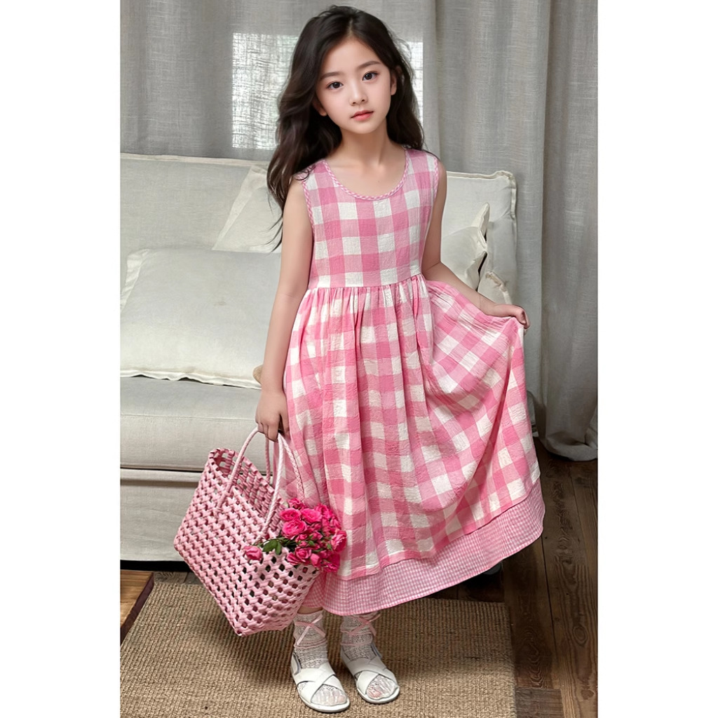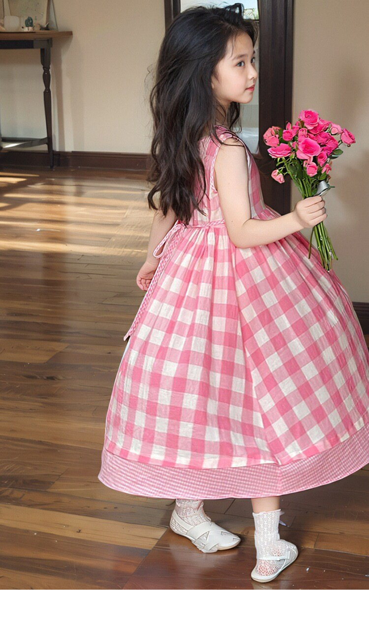 격자 무늬 긴 원피스 소녀 원피스 핑크 여름 해변 어린이 치마 민소매 면 소녀 공주 치마