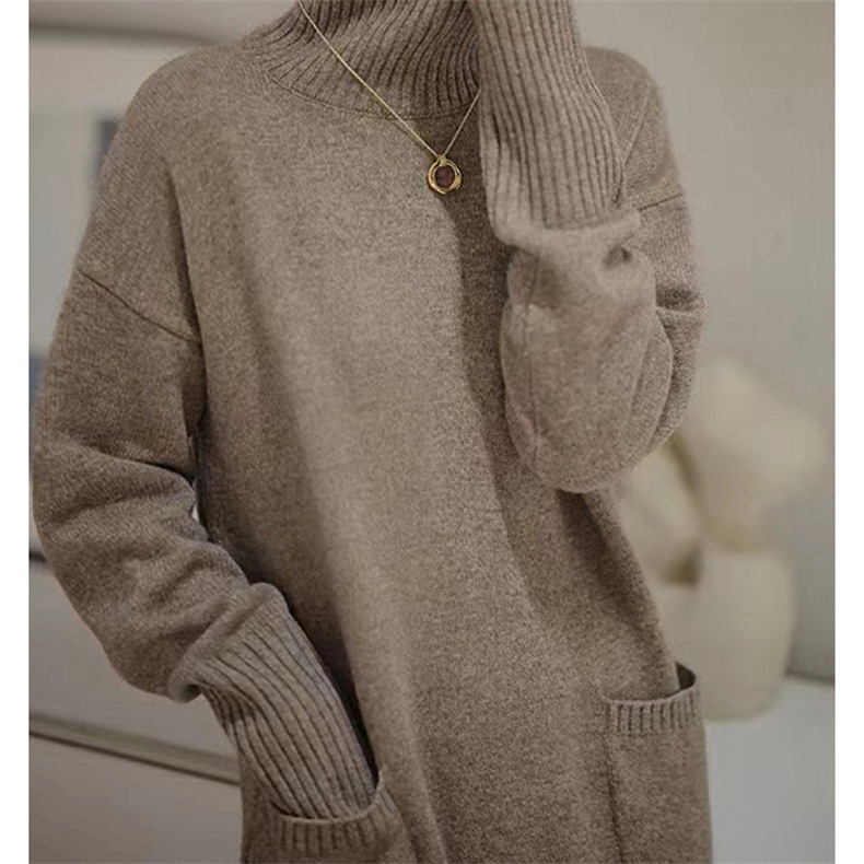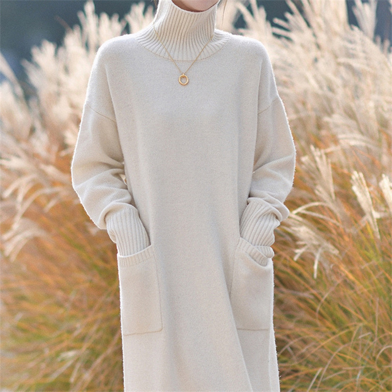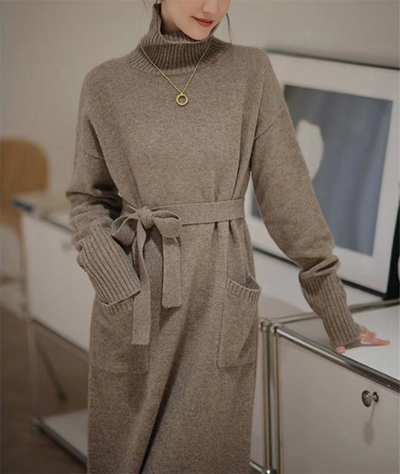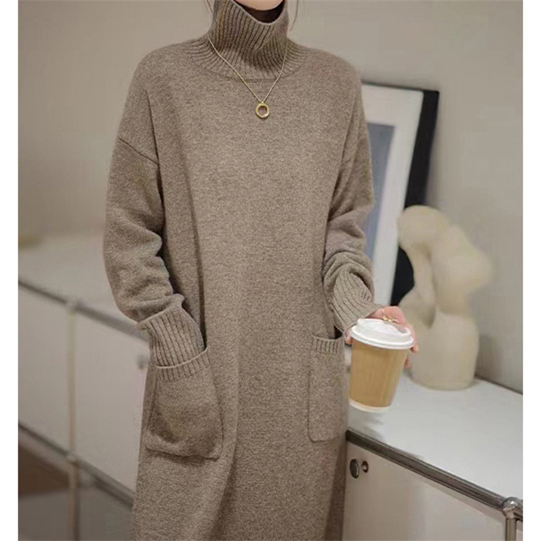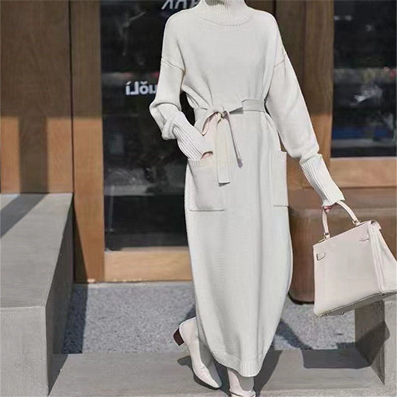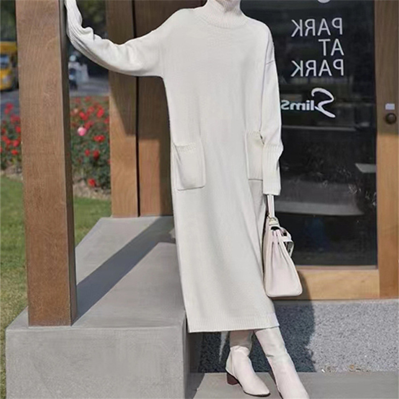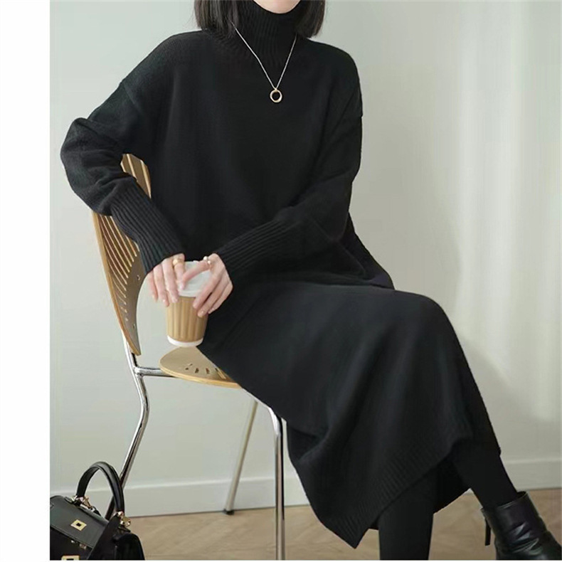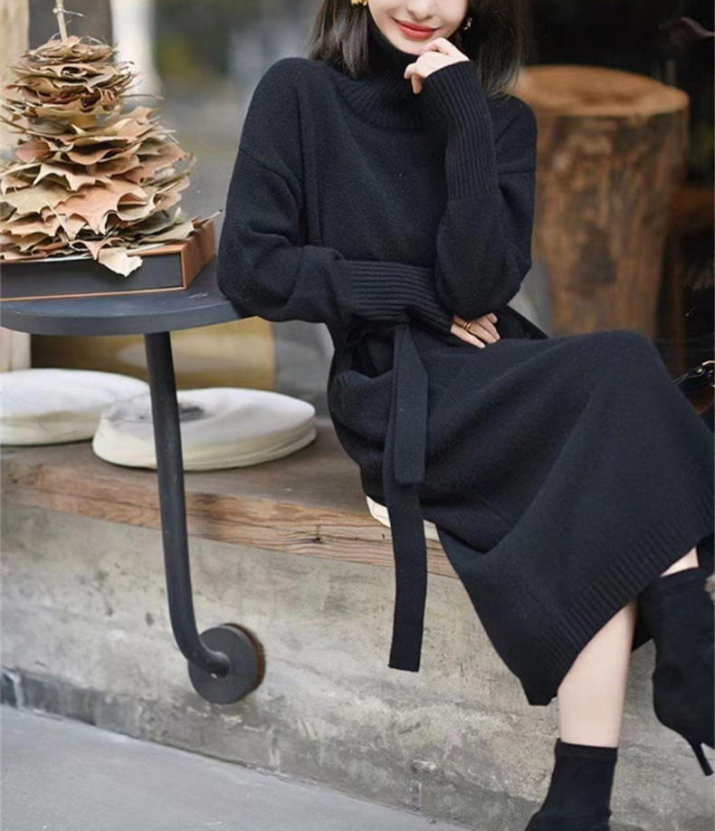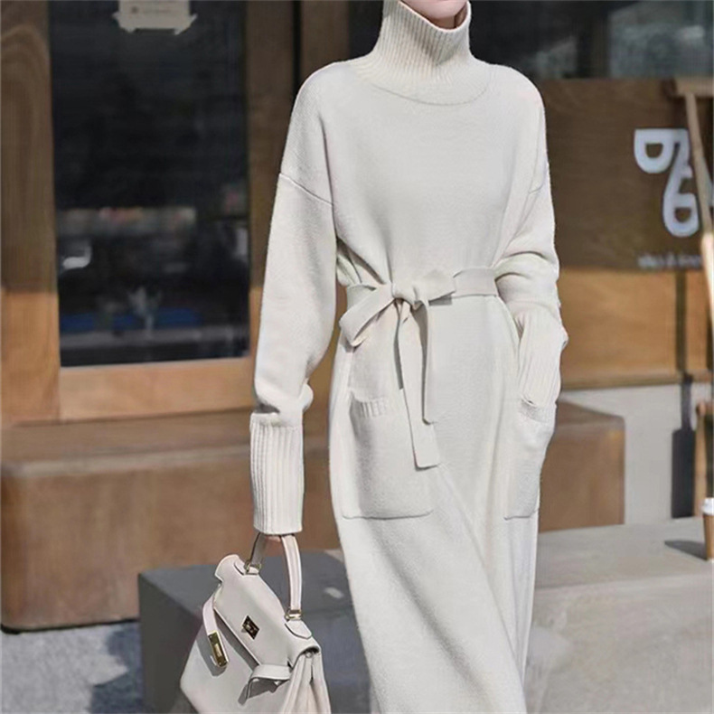 가을 겨울용 중간 길이의 하이넥 니트 스웨터 드레스, 레이지 스타일의 루즈한 허리 드레스스토어 가기