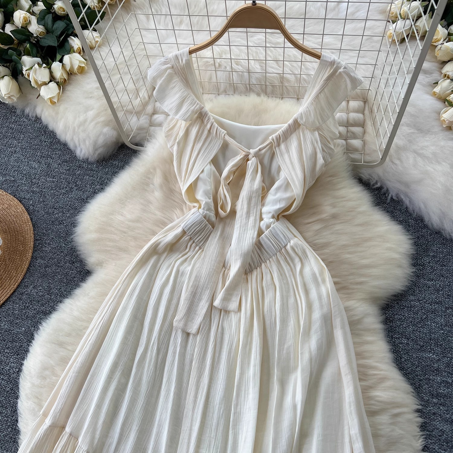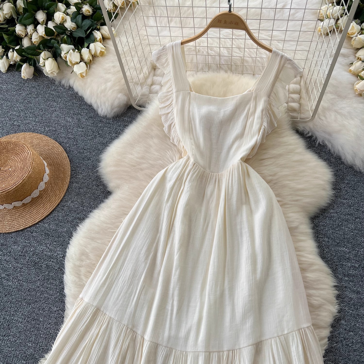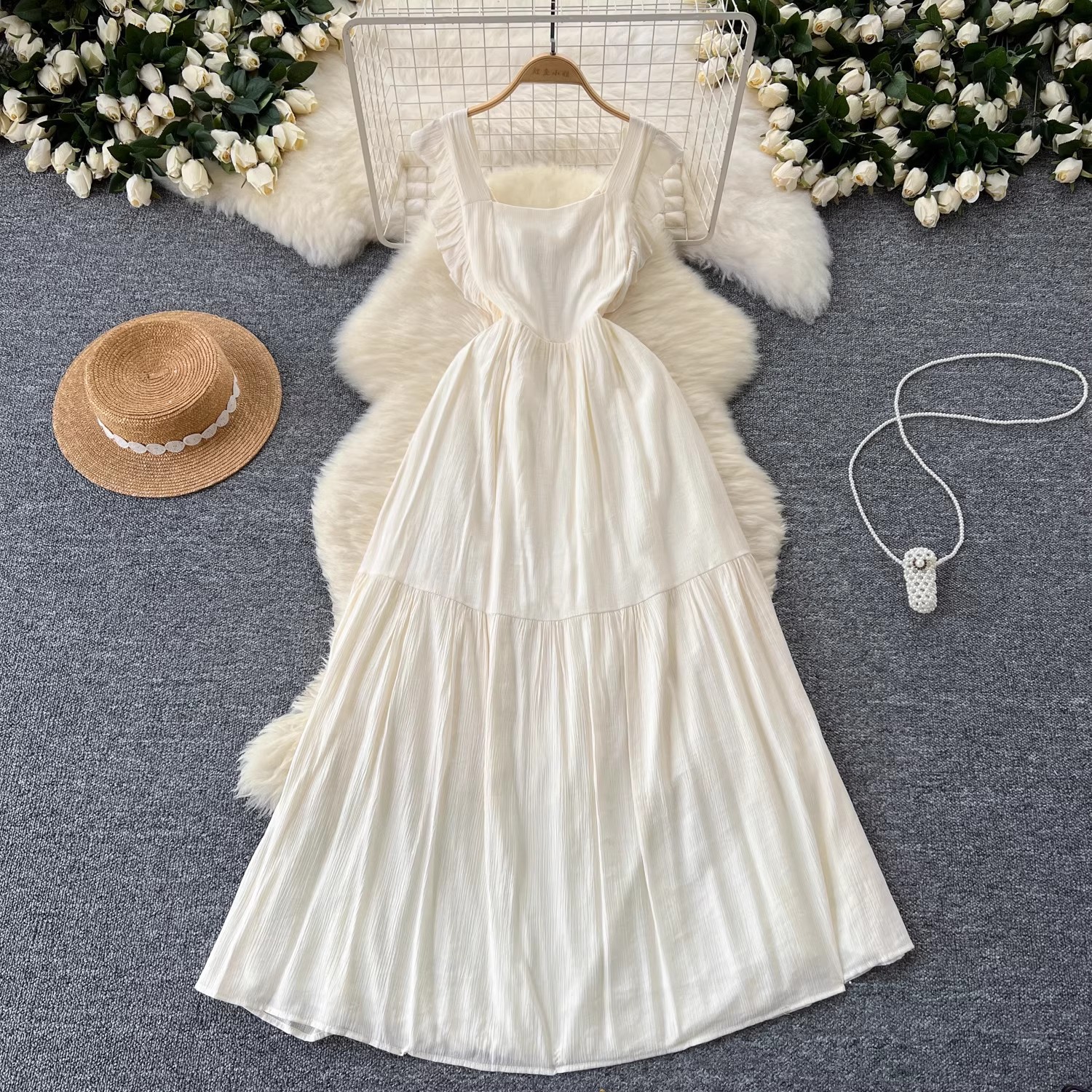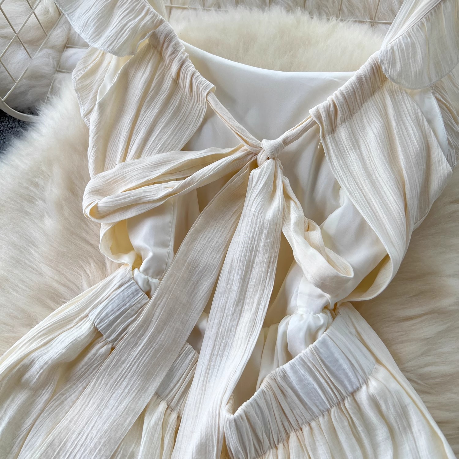 유럽과 미국의 슈퍼 페어리 휴가 원피스 여성 여름 프랑스 달콤한 작은 비행 슬리브 스트랩 높은 허리 대형 스윙 쉬폰 긴 원피스
