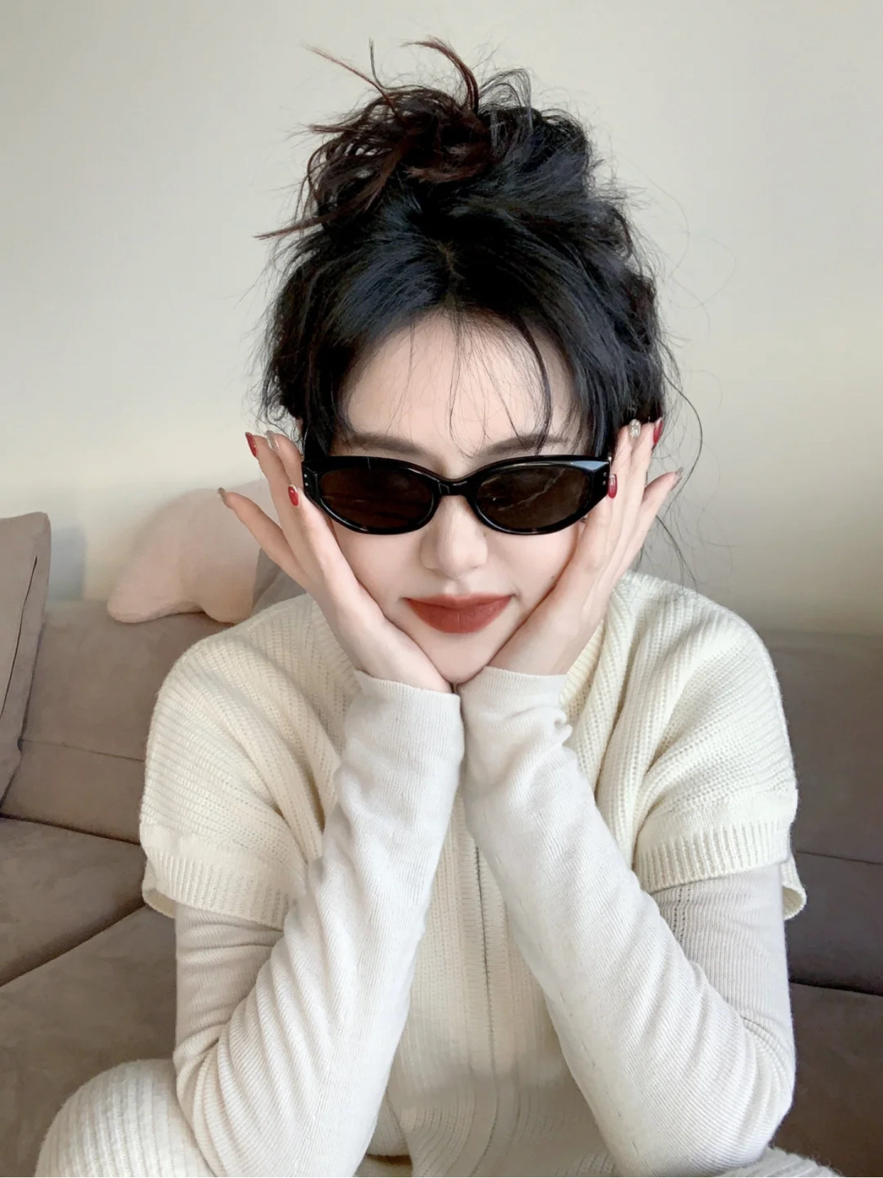 새로운 레트로 작은 프레임 고양이 눈 선글라스 작은 선글라스를 보여주는 여성의 하이 엔드 얼굴 작은 빨간 책 블로거 같은 스타일 안경 트렌디