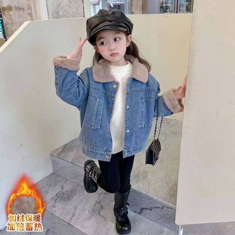 소녀 가을 겨울 기모 데님 코트 따뜻한 새 어린이 가을 코트 두꺼운 서양식 아기 소녀 겨울 코트 트렌디