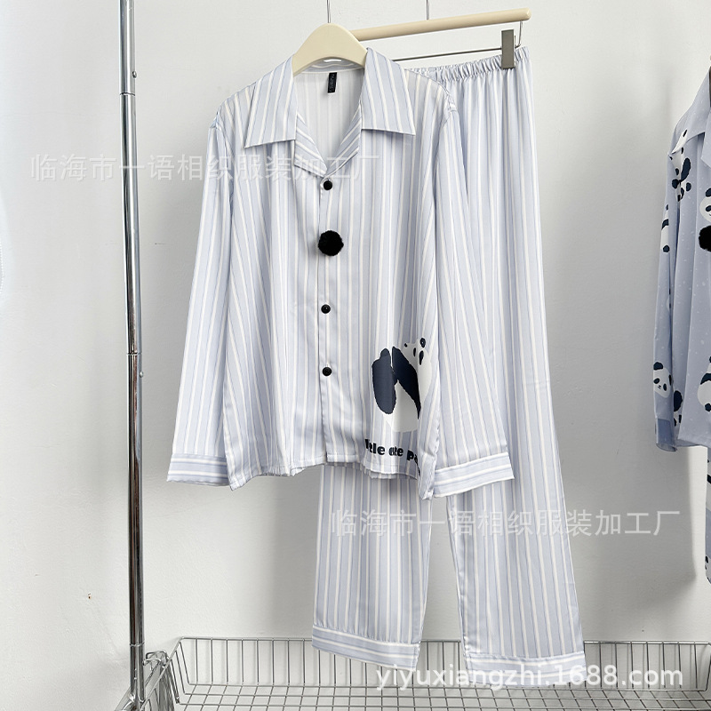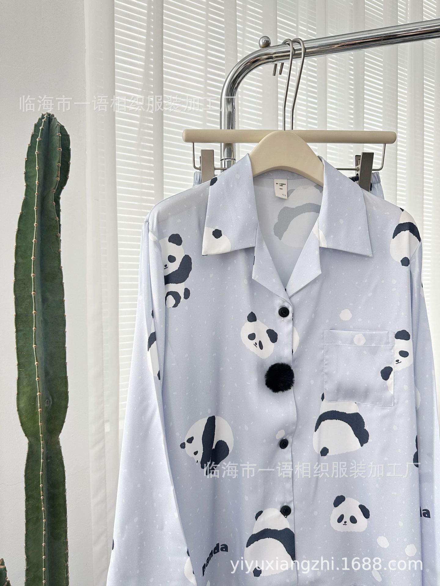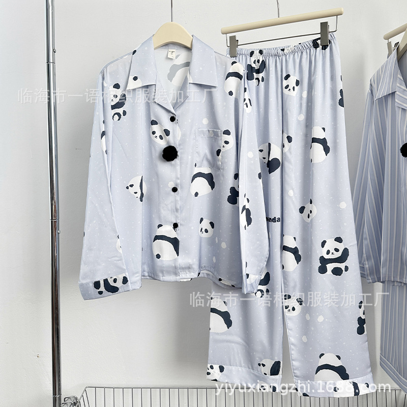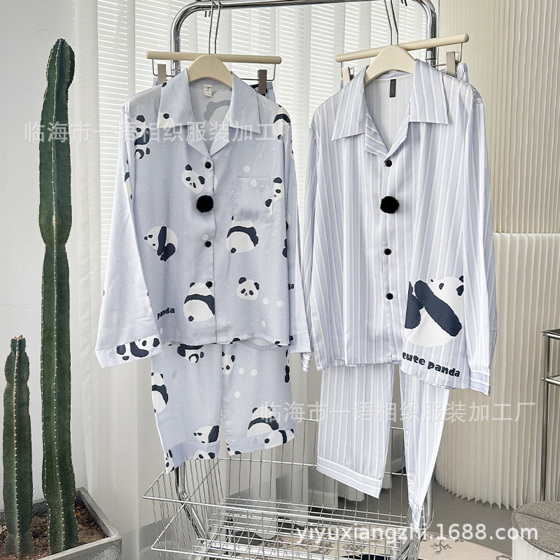 가을 신상 커플 팬더 실크 느낌 잠옷 여성용 초박형 폴로 칼라 외출 가능 여성 홈웨어 세트스토어 가기
