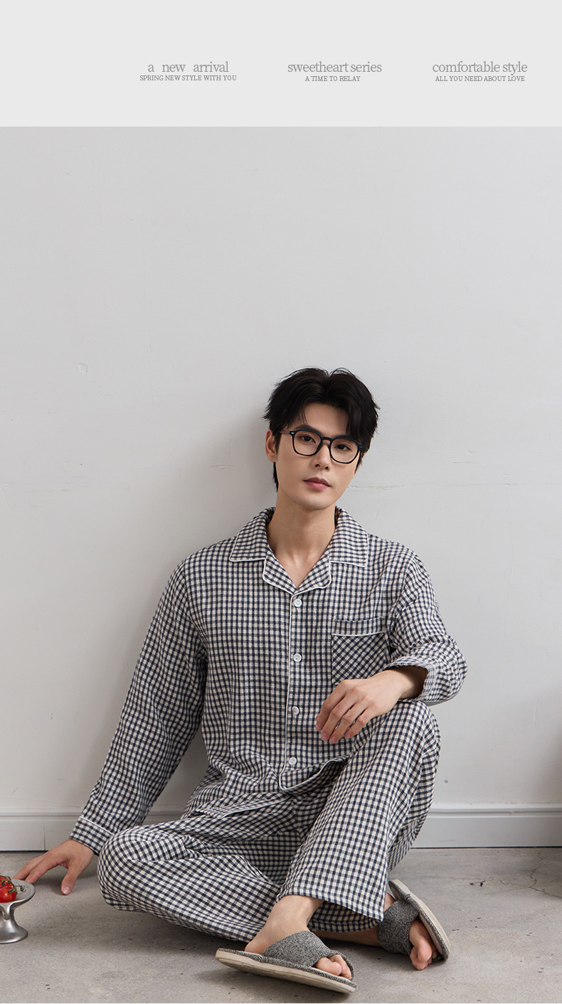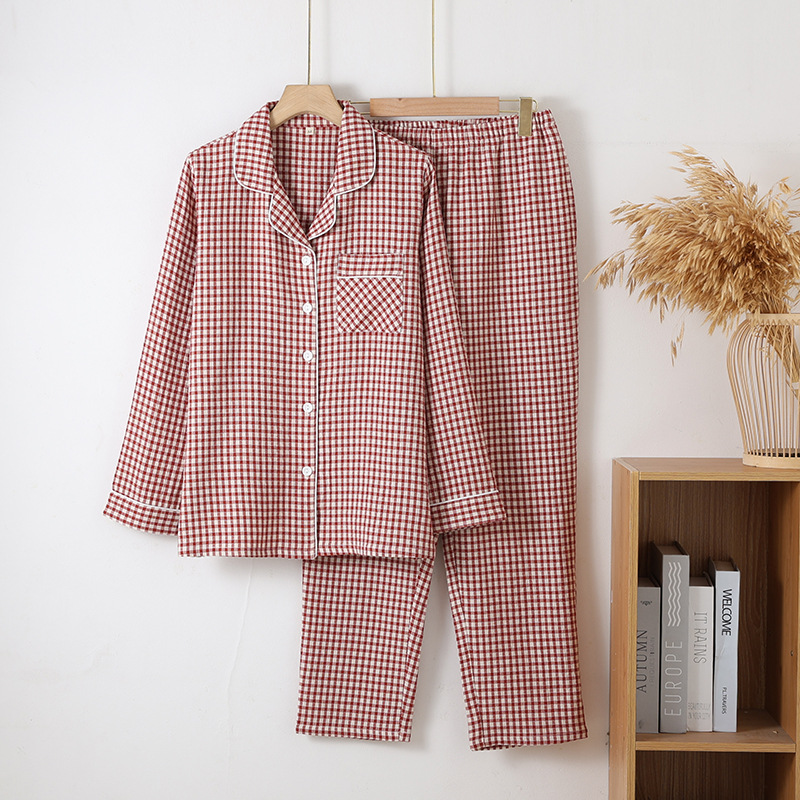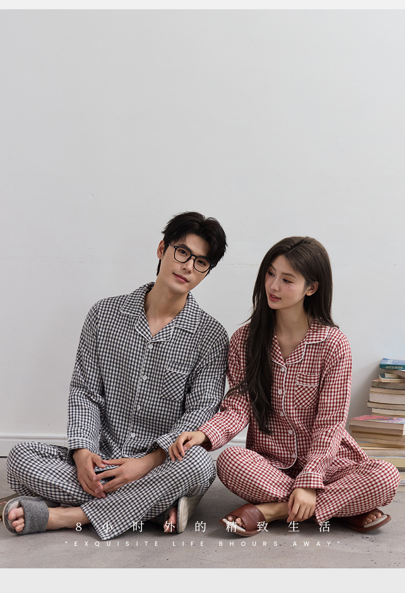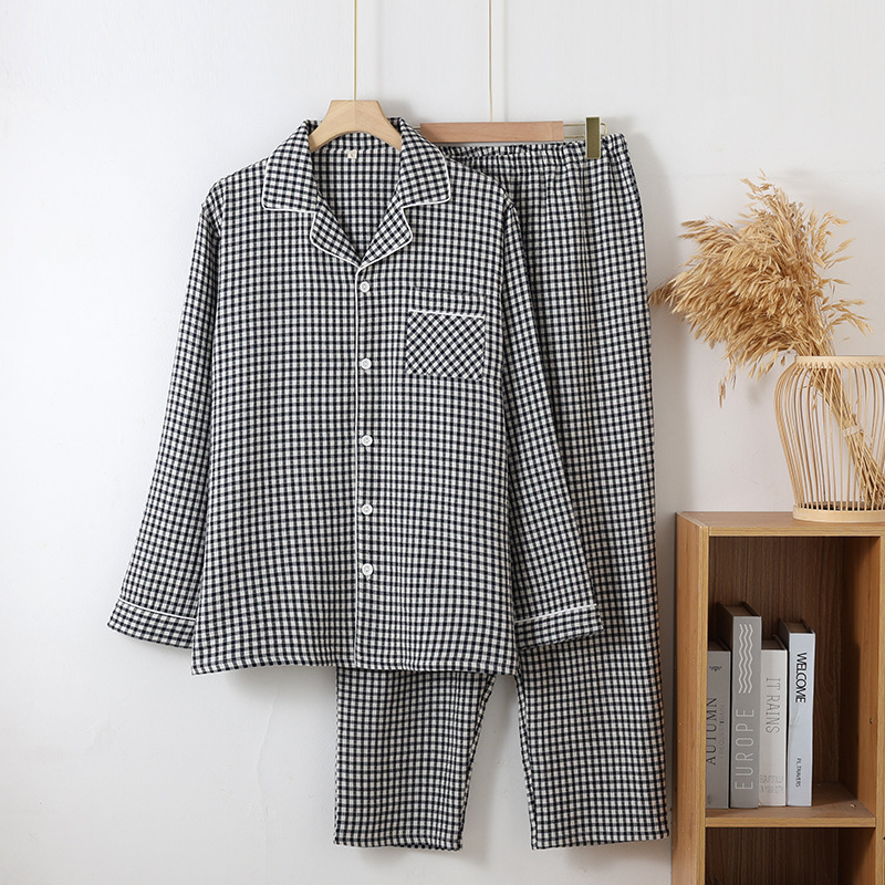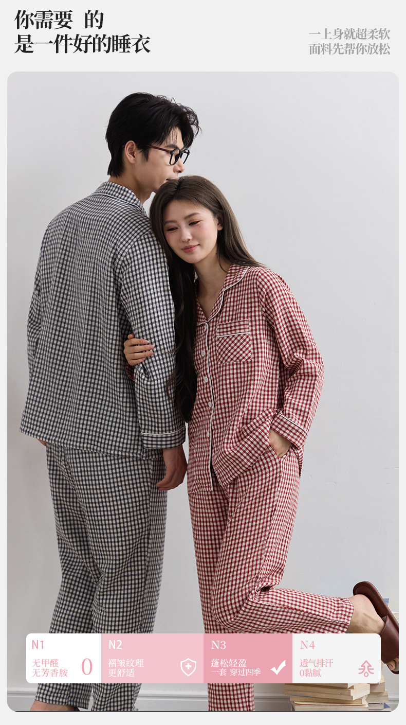 일본식 인쇄되지 않은 퓨어 코튼 더블 레이어 거즈 커플 잠옷 봄과 가을 간단한 격자 무늬 남녀 면 긴팔 홈 의류스토어 가기