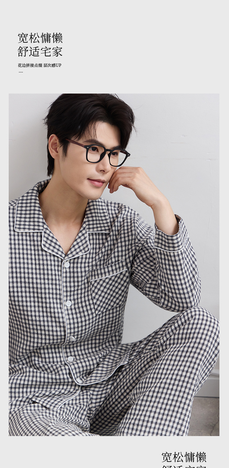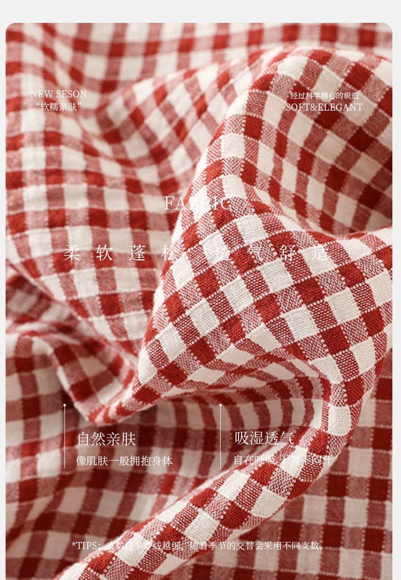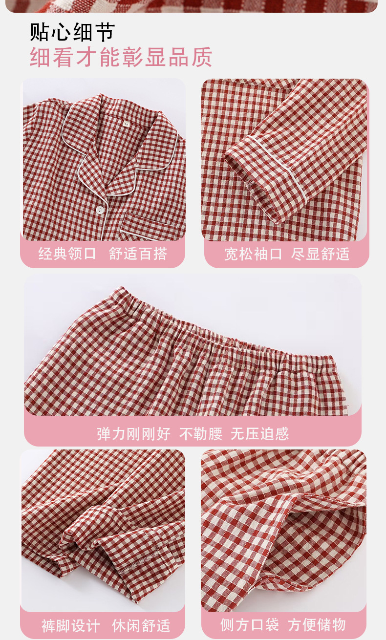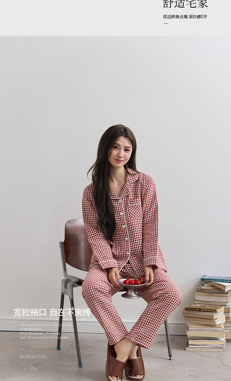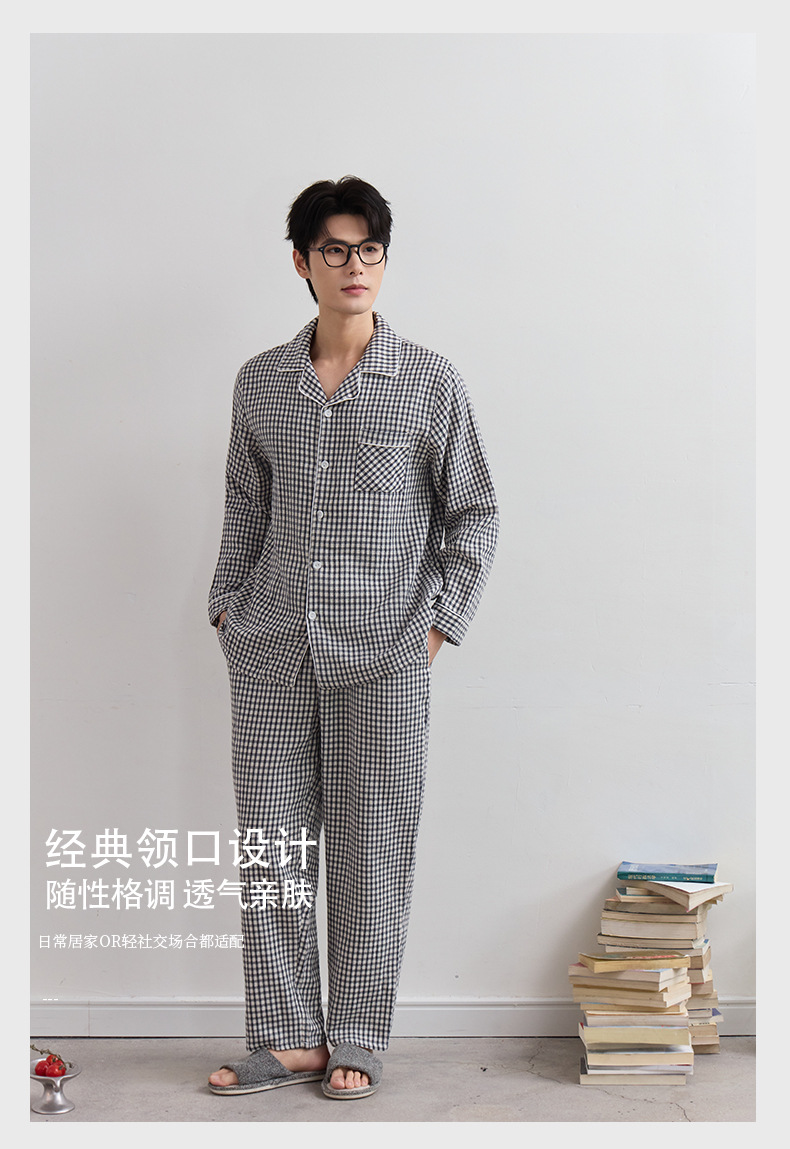 일본식 인쇄되지 않은 퓨어 코튼 더블 레이어 거즈 커플 잠옷 봄과 가을 간단한 격자 무늬 남녀 면 긴팔 홈 의류스토어 가기