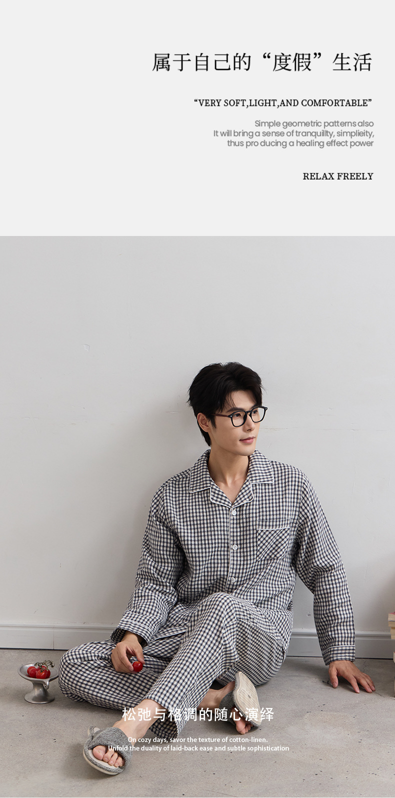 일본식 인쇄되지 않은 퓨어 코튼 더블 레이어 거즈 커플 잠옷 봄과 가을 간단한 격자 무늬 남녀 면 긴팔 홈 의류