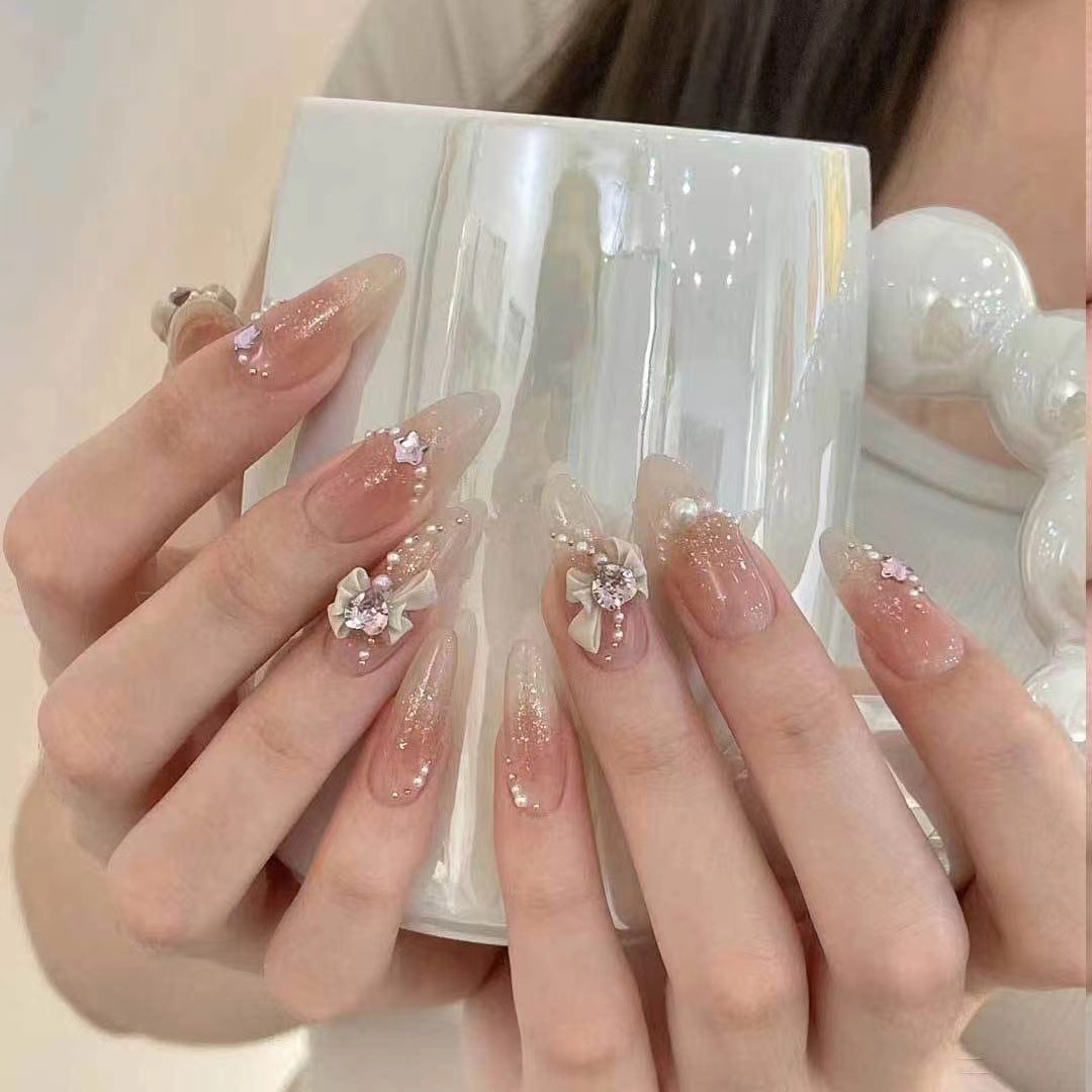 새로운 인터넷 연예인 핫 로즈 파우더 드래곤 하트 보우 네일 아트 쥬얼리 스위트 플래시 다이아몬드 소녀 하트 네일 장식