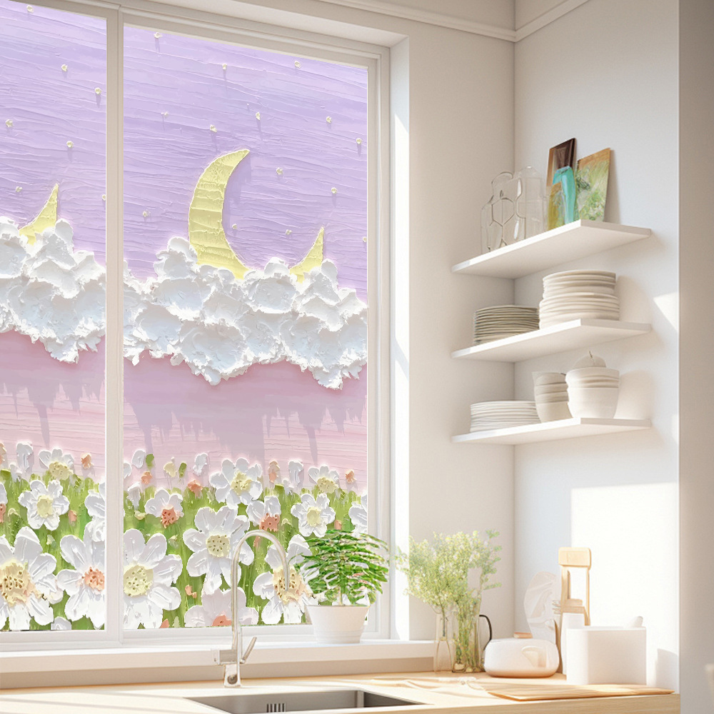 Yiyao BLT5119 만화 유화 스타일 달 꽃 정원 유리 스티커 화장실 욕실 유리 도어 접착제-무료 정전기 스티커