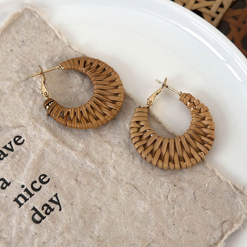 Ins 홀리데이 스타일 수제 밀짚 등나무 반지 귀걸이 여성용 해변 사진 어울리는 귀걸이 빈티지 패션 귀걸이스토어 가기