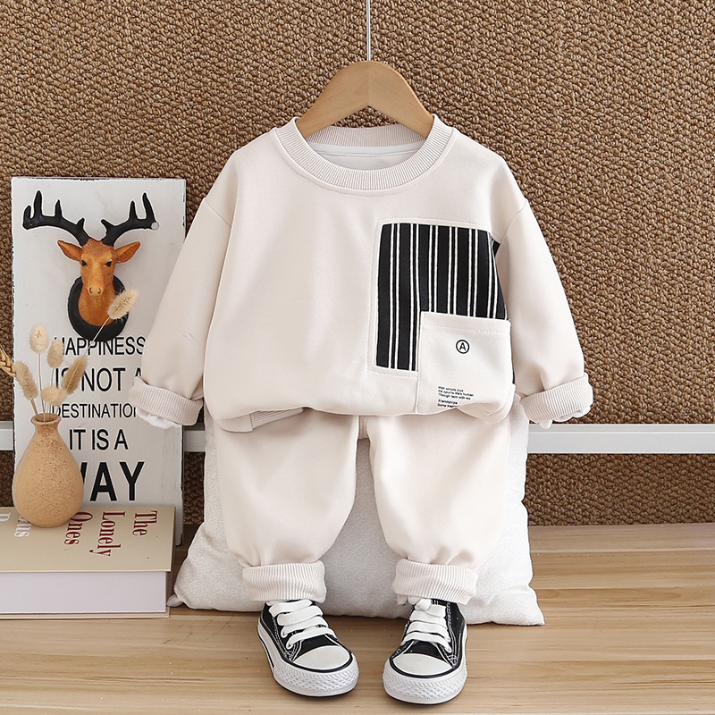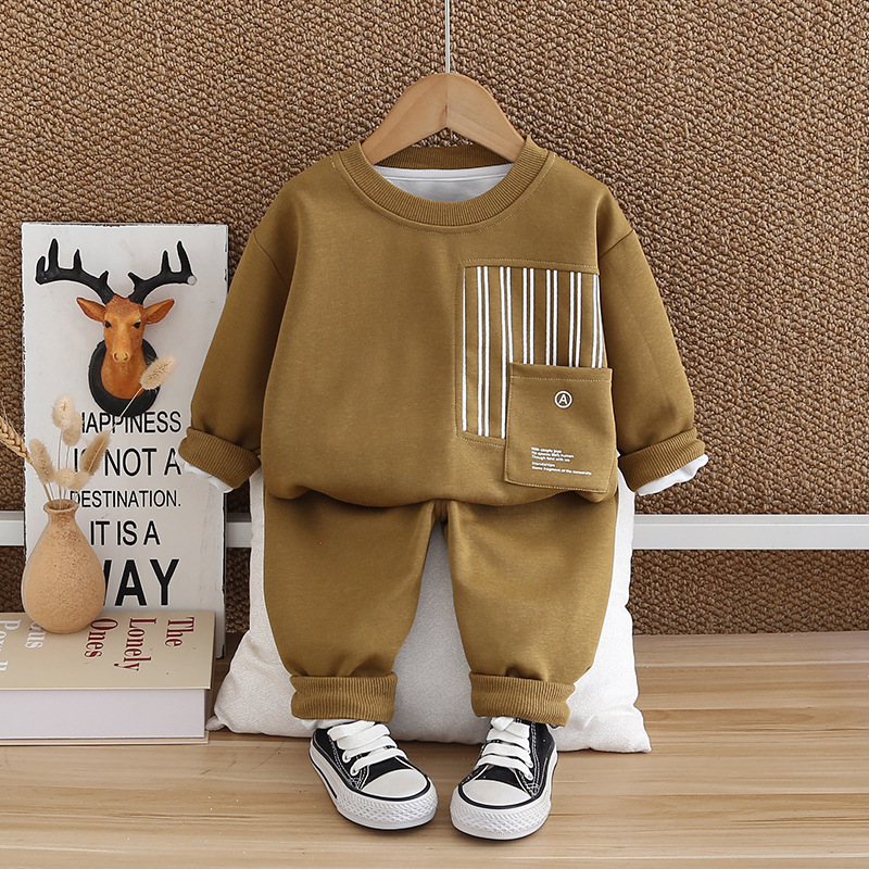 가을 2024 년 새 소년 접합 포켓 크루 넥 긴 소매 세트 소년과 아기의 캐주얼 바지 2 피스 세트스토어 가기