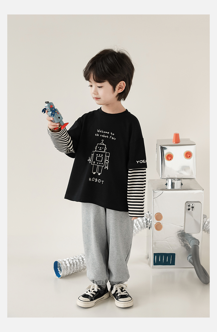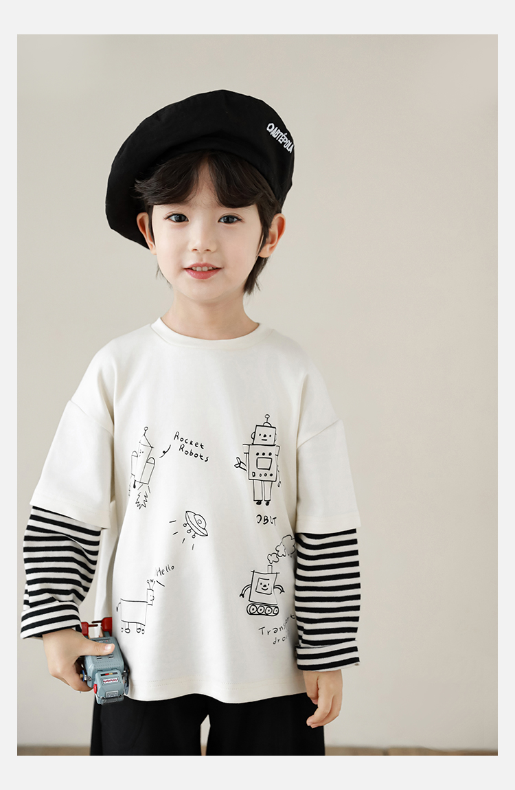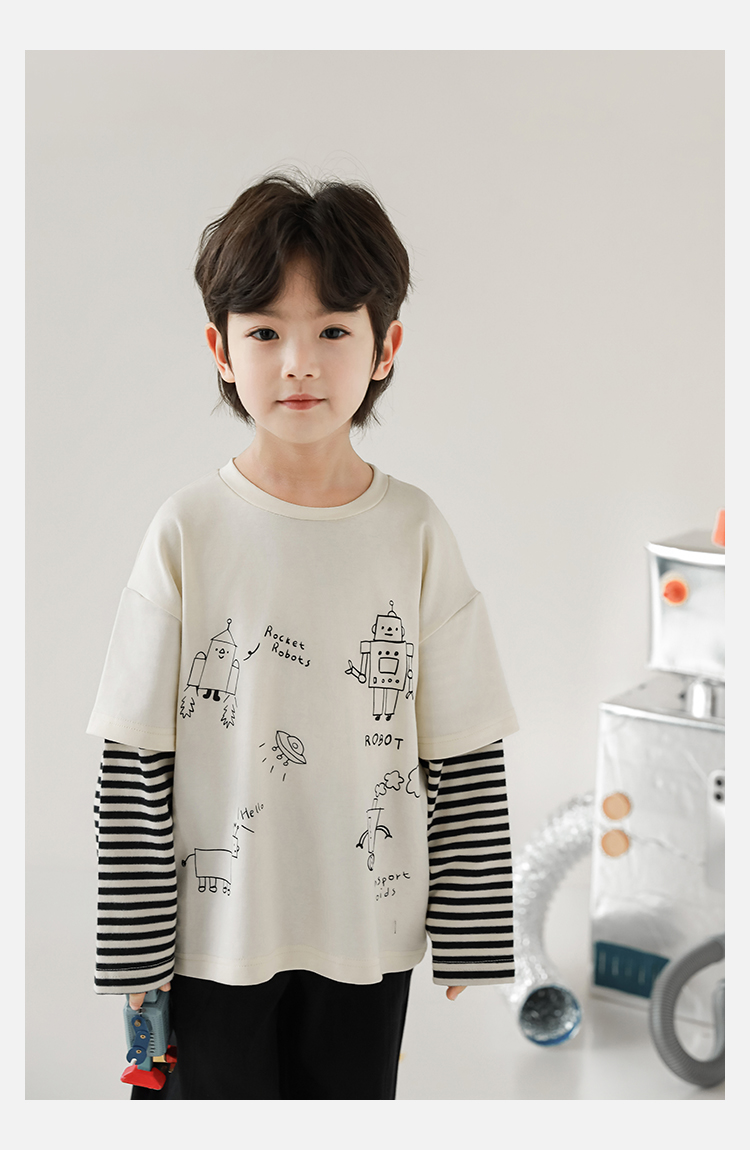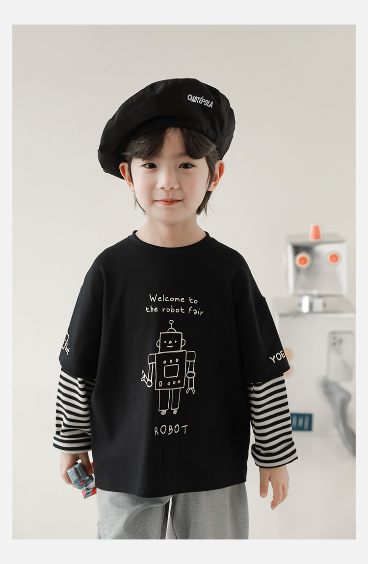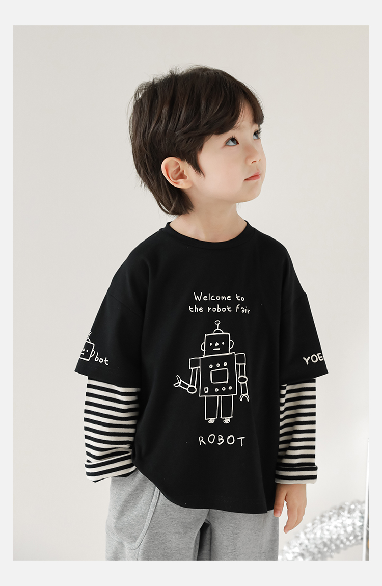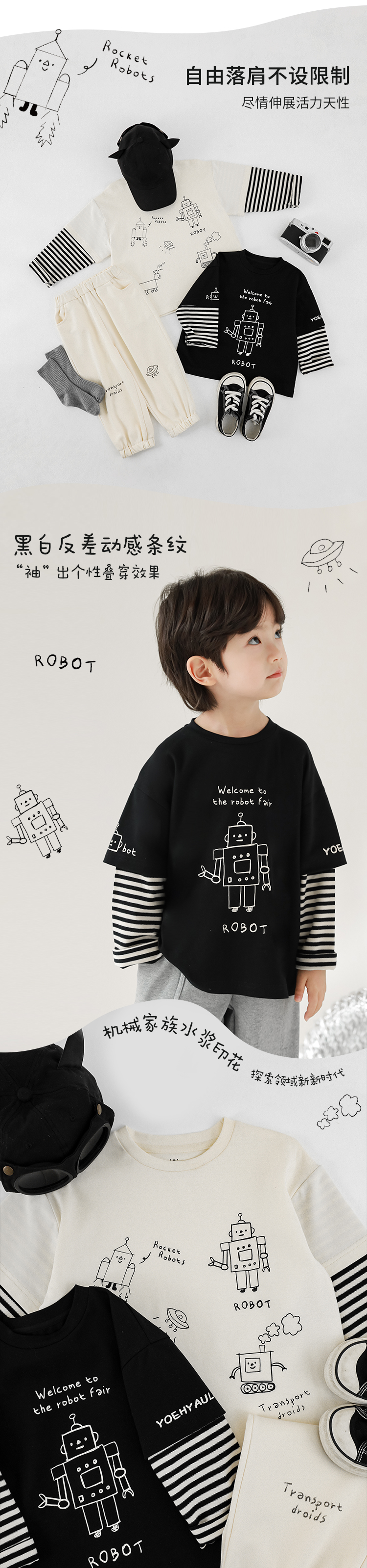 Wurib 소년 로봇 인쇄 대비 줄무늬 무료 어깨 가짜 두 티셔츠 가을 캐주얼 탑