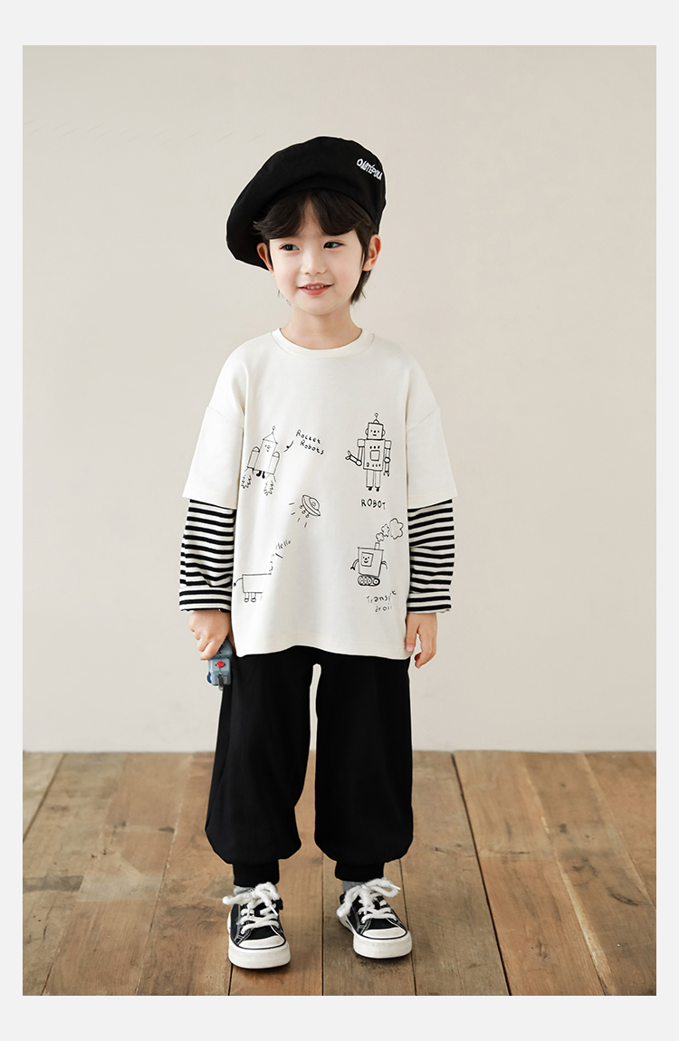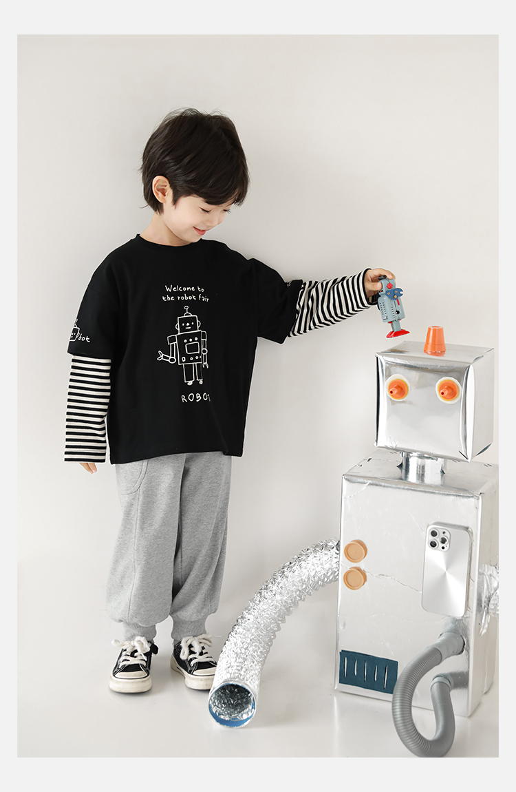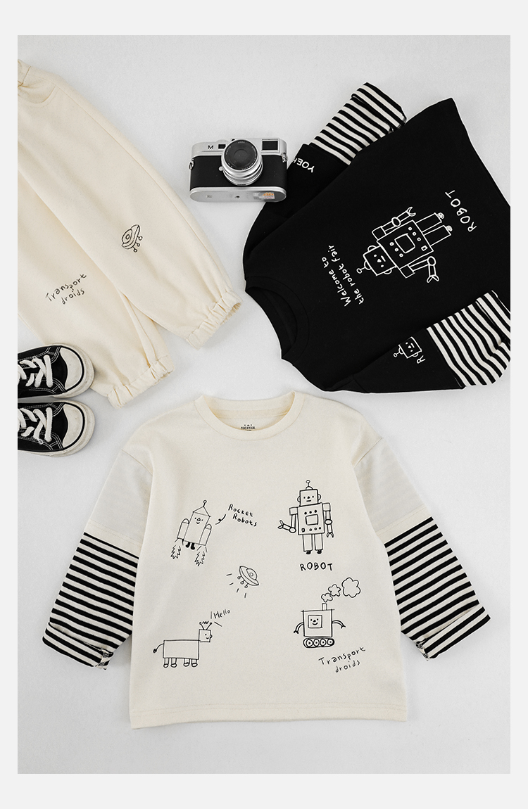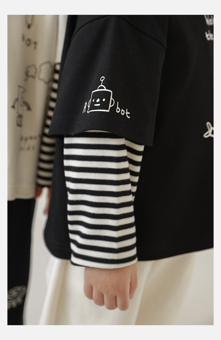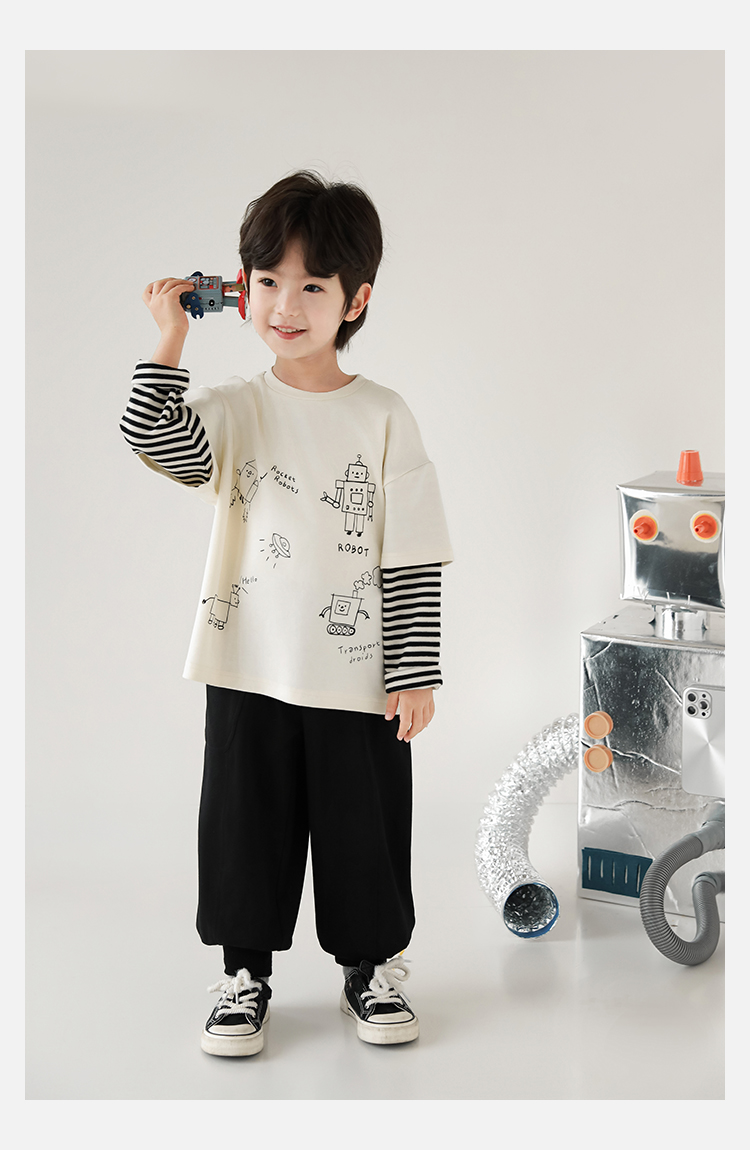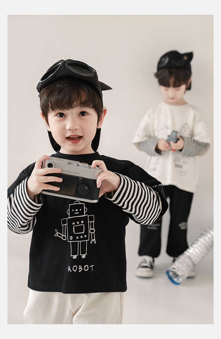 Wurib 소년 로봇 인쇄 대비 줄무늬 무료 어깨 가짜 두 티셔츠 가을 캐주얼 탑