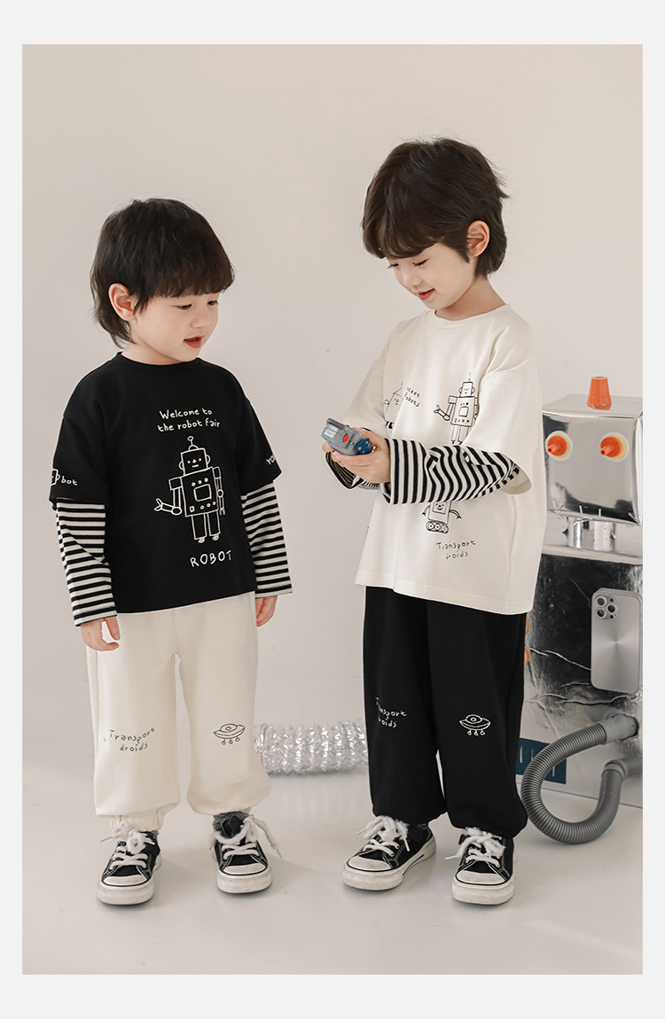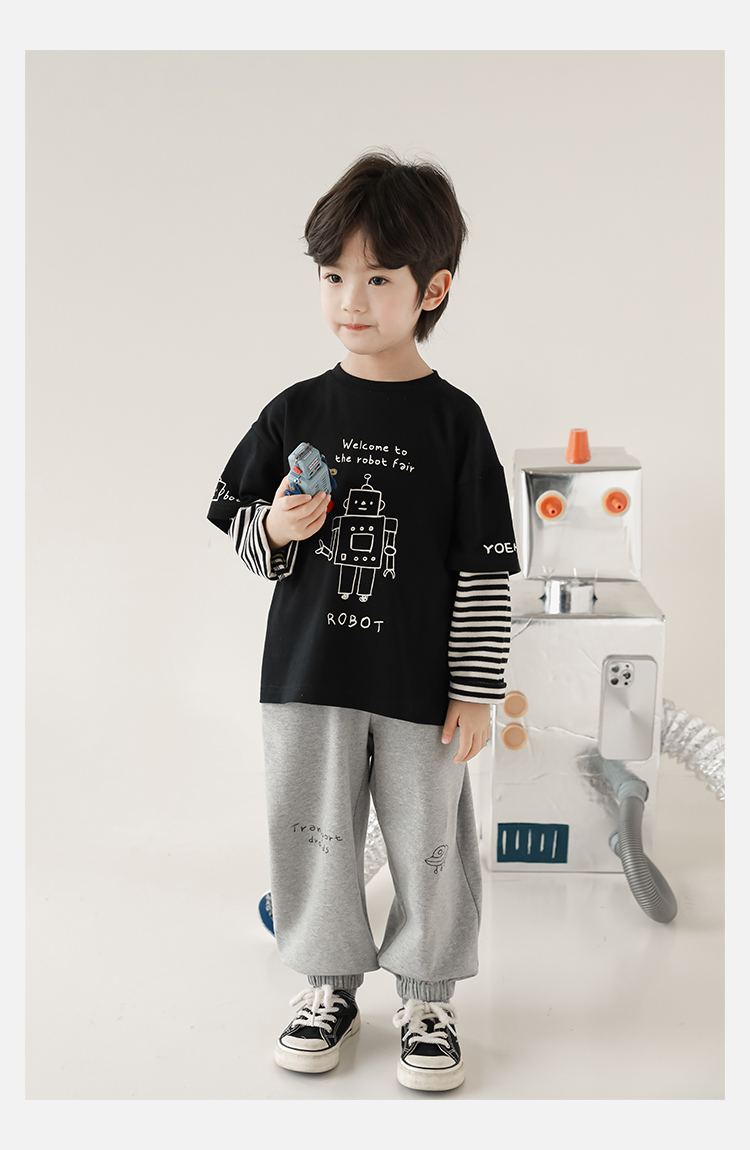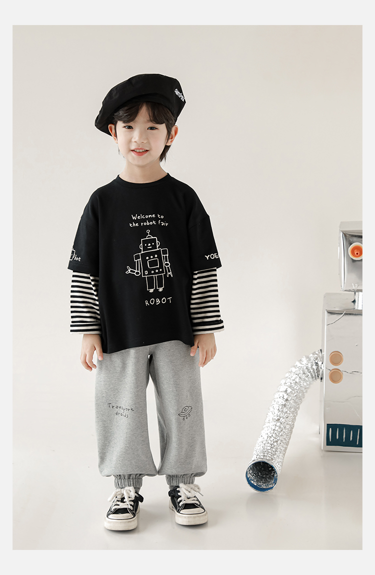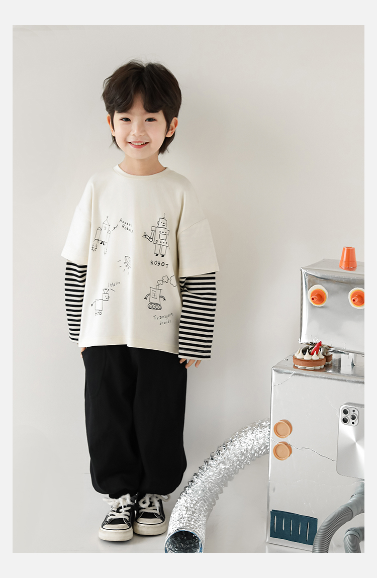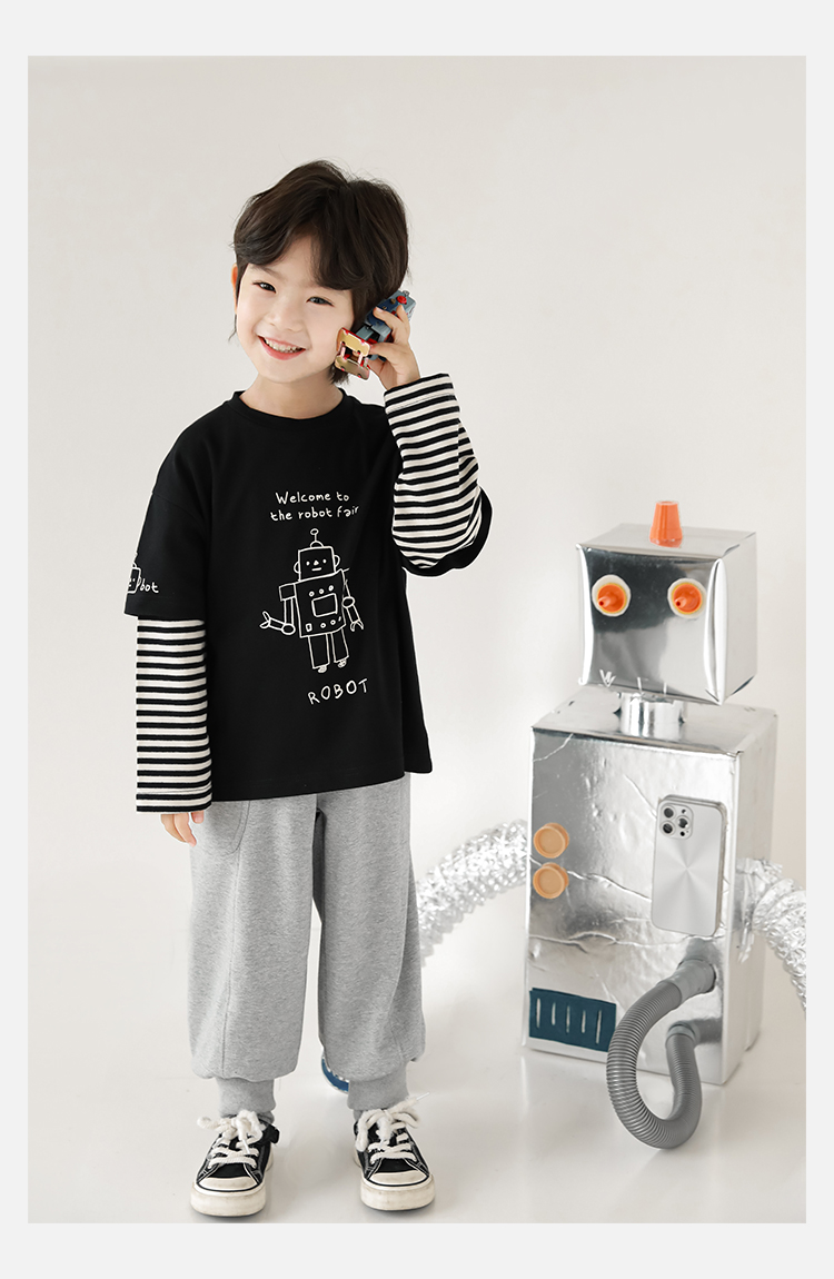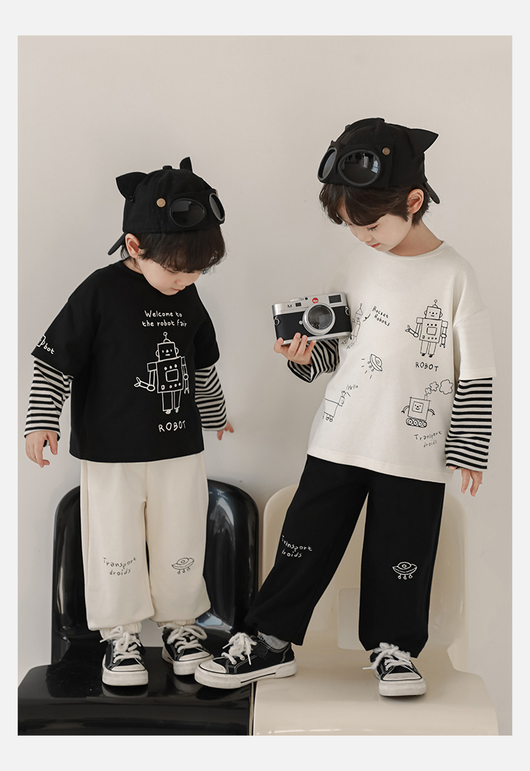 Wurib 소년 로봇 인쇄 대비 줄무늬 무료 어깨 가짜 두 티셔츠 가을 캐주얼 탑