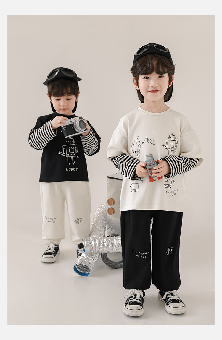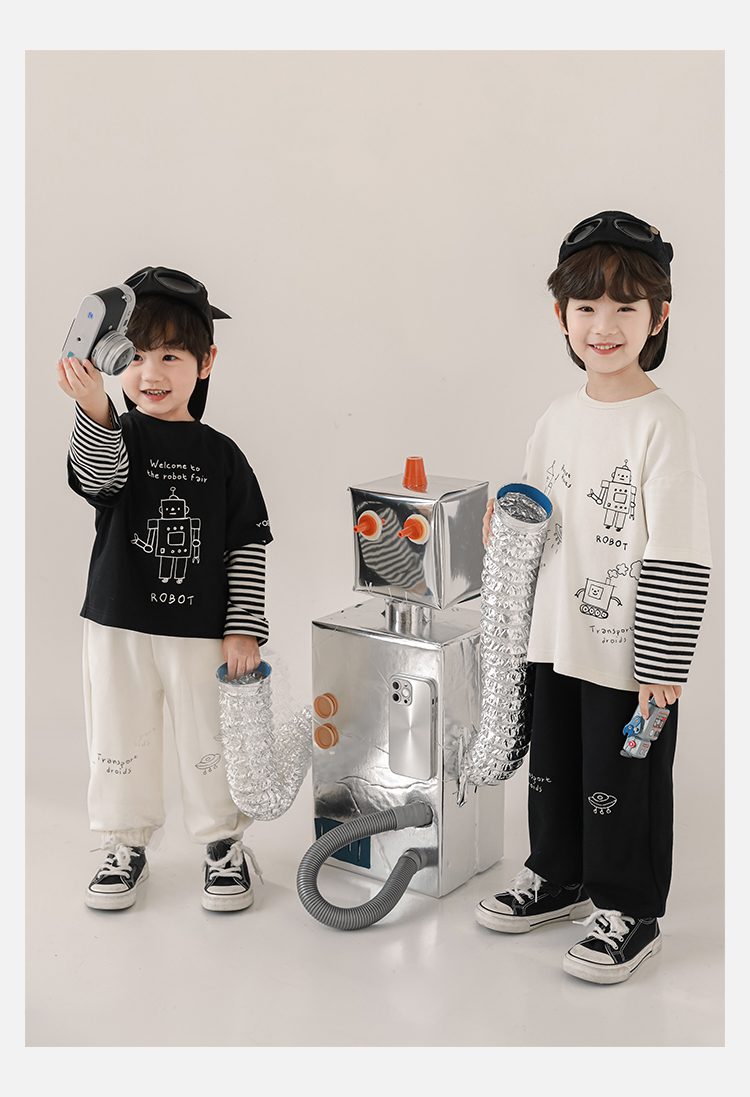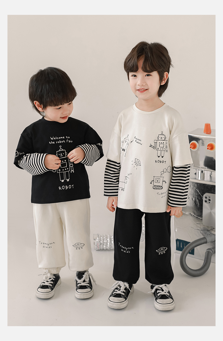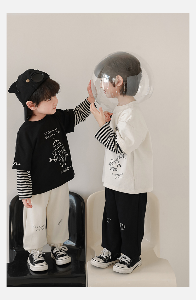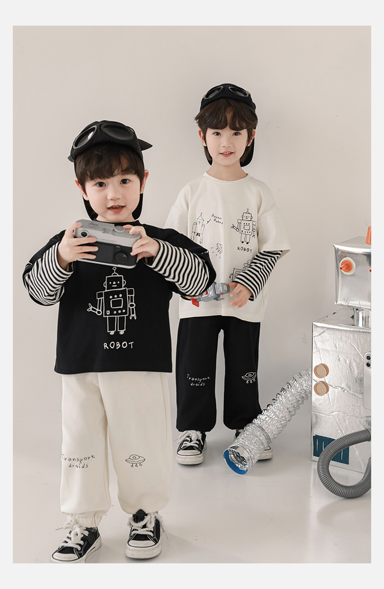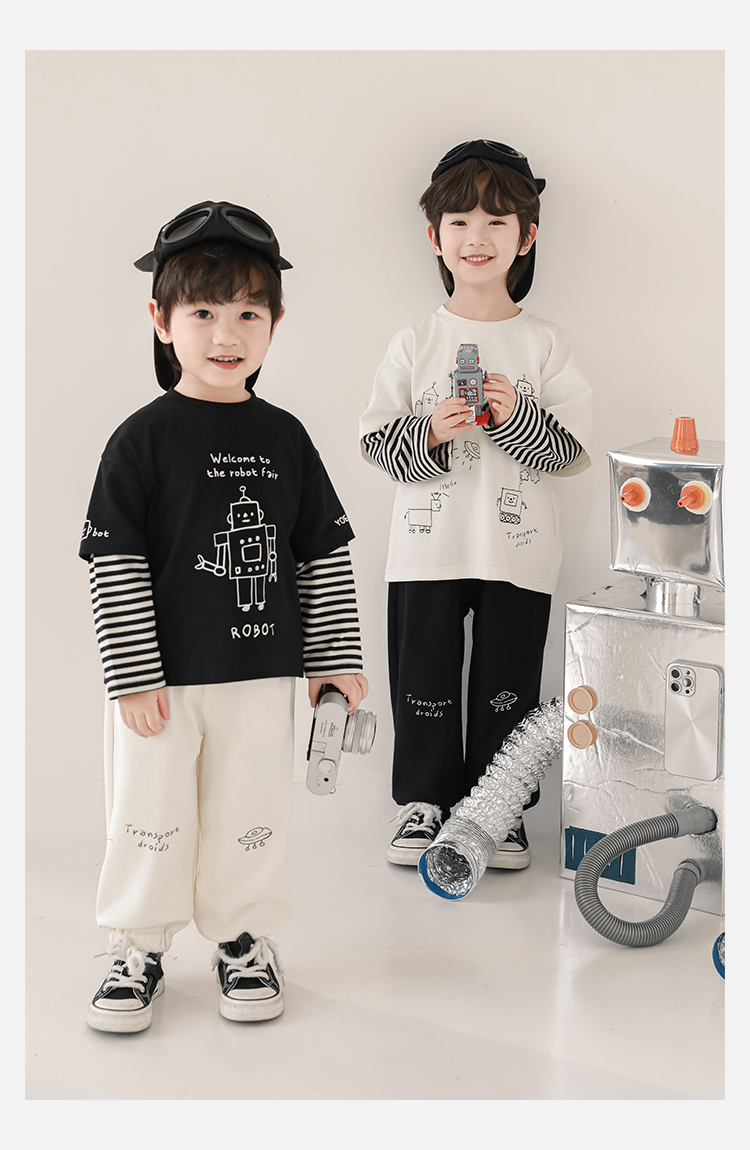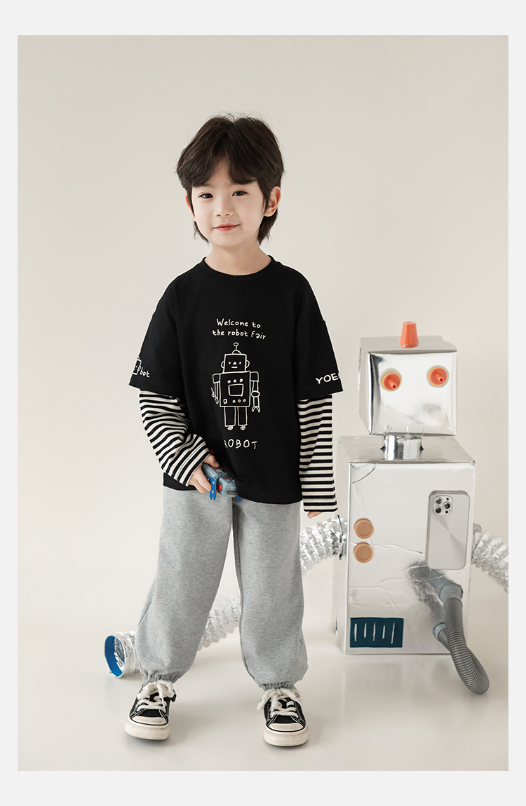Wurib 소년 로봇 인쇄 대비 줄무늬 무료 어깨 가짜 두 티셔츠 가을 캐주얼 탑