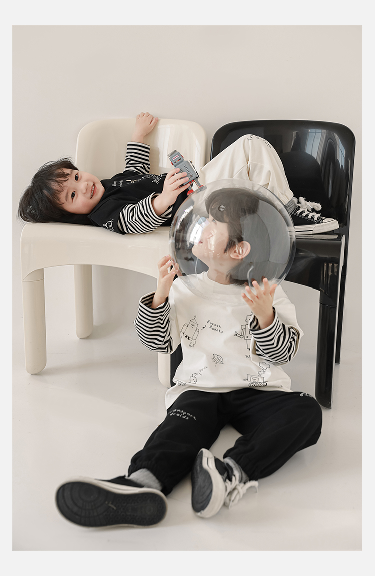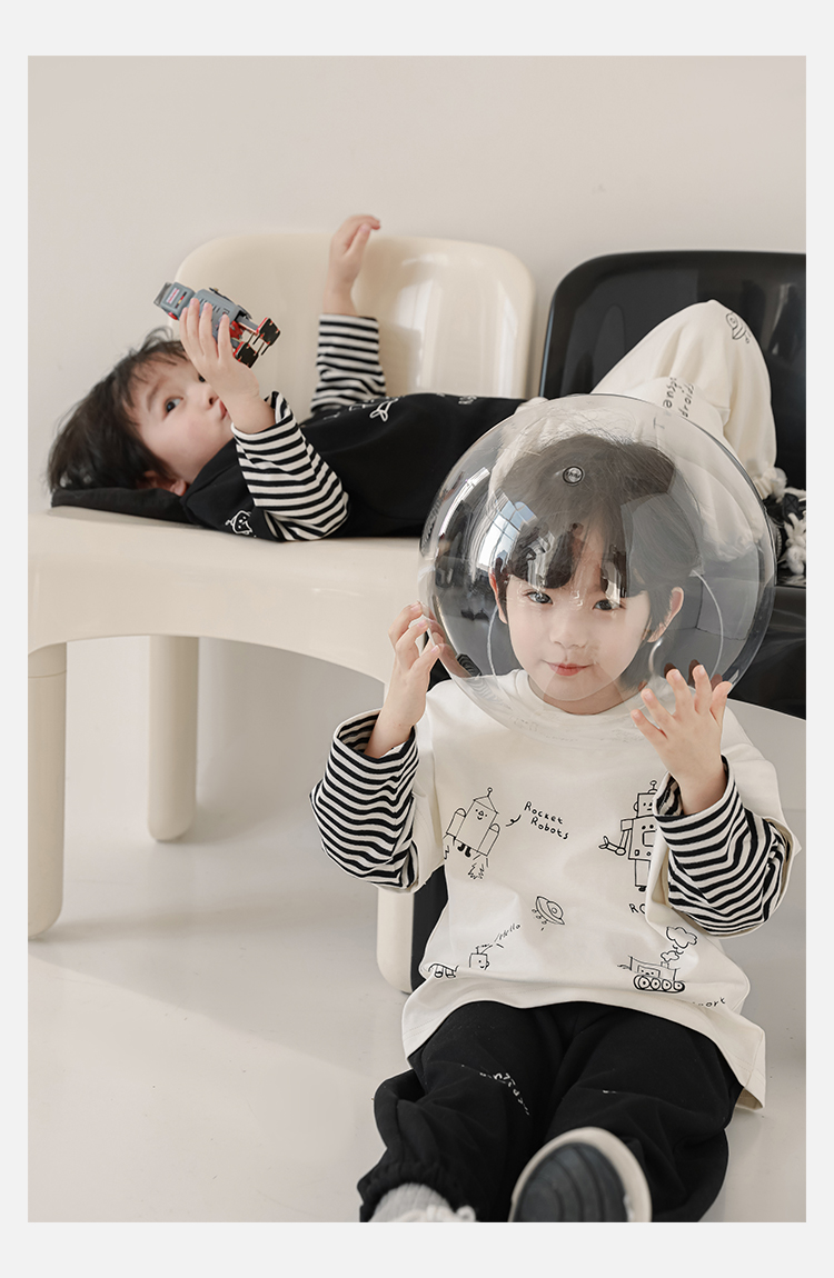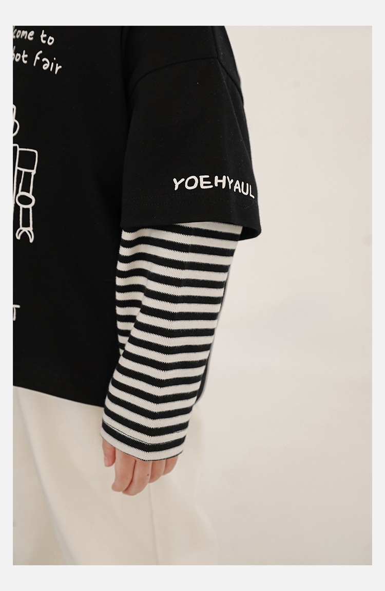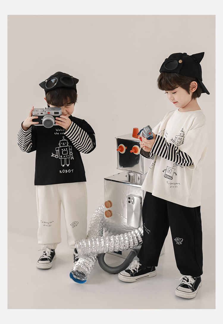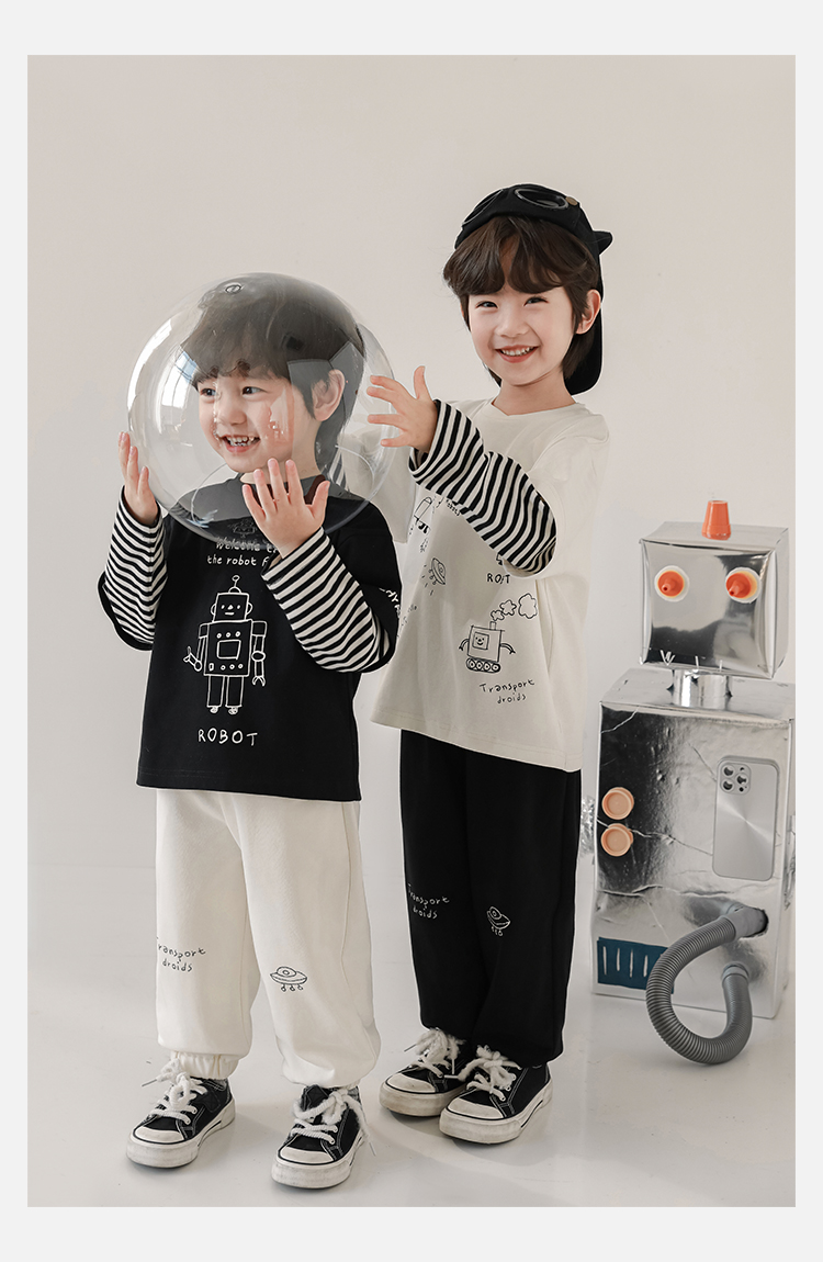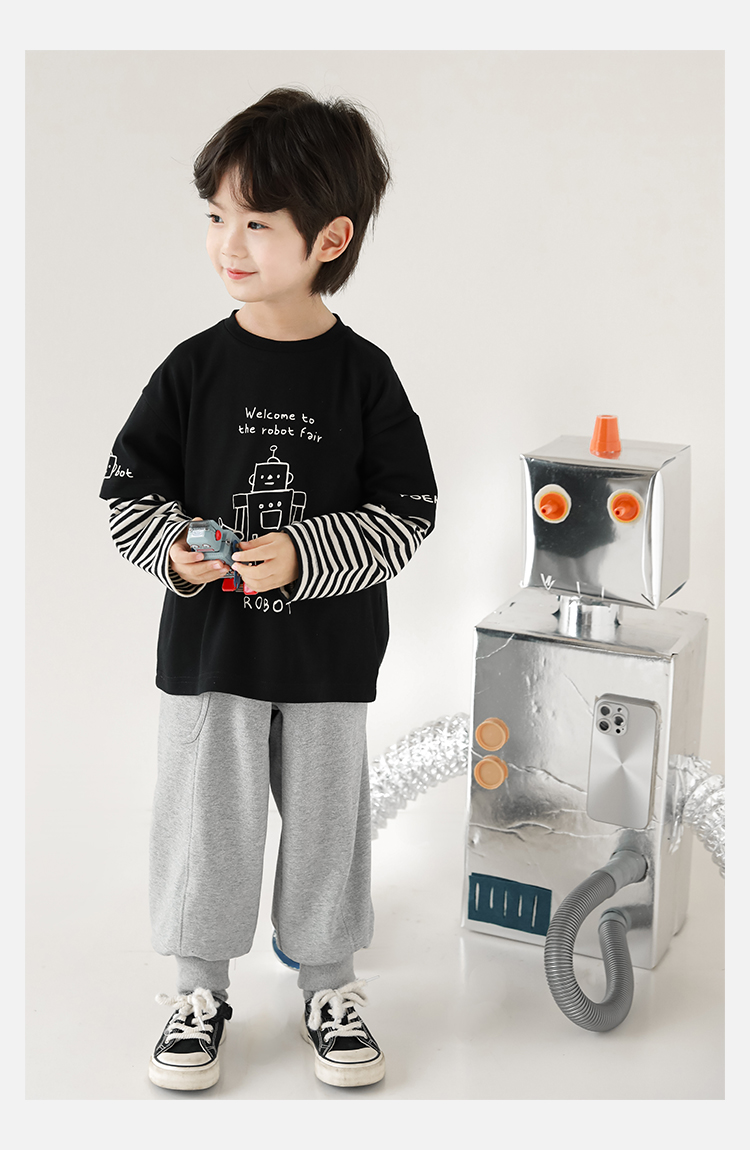 Wurib 소년 로봇 인쇄 대비 줄무늬 무료 어깨 가짜 두 티셔츠 가을 캐주얼 탑