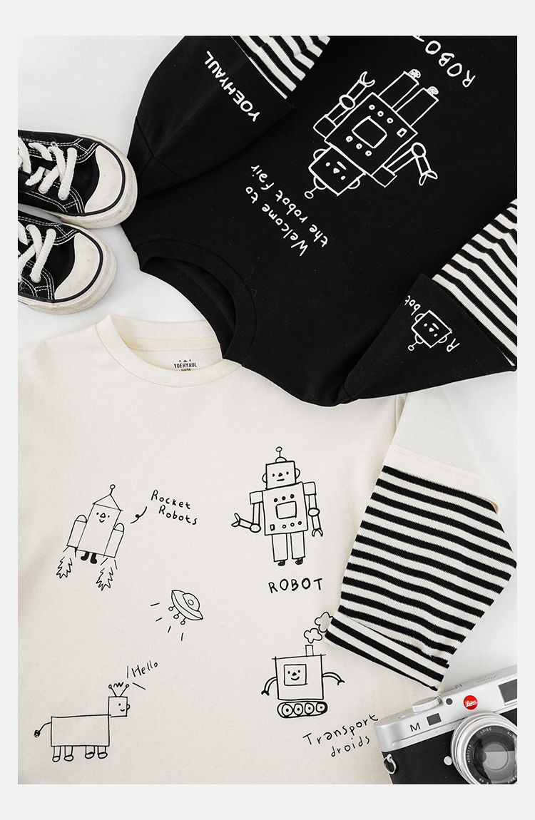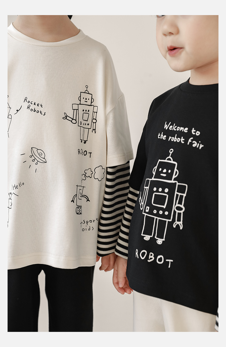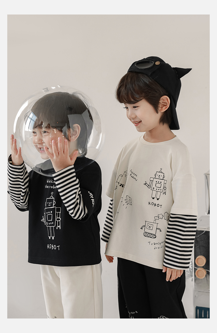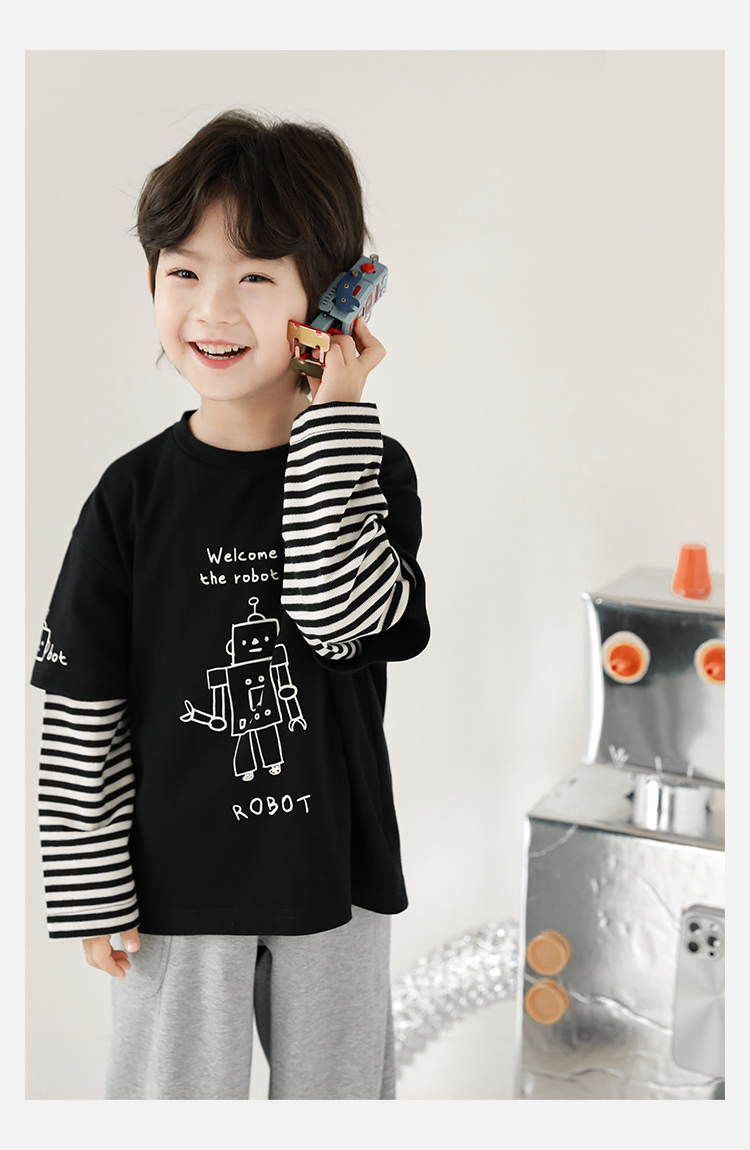 Wurib 소년 로봇 인쇄 대비 줄무늬 무료 어깨 가짜 두 티셔츠 가을 캐주얼 탑스토어 가기