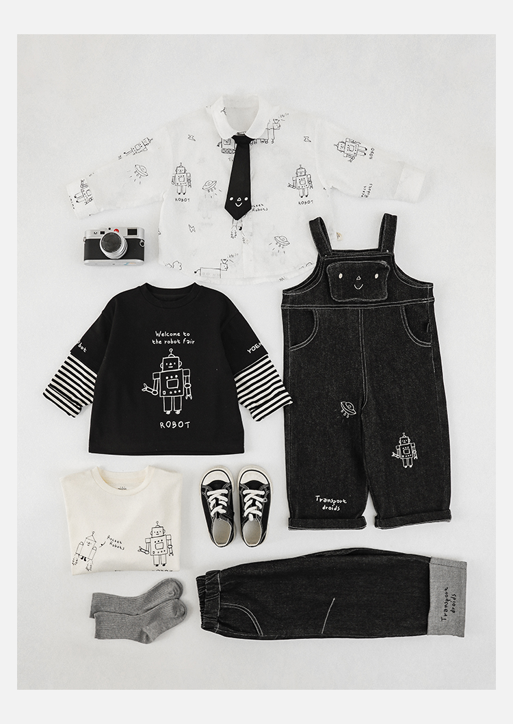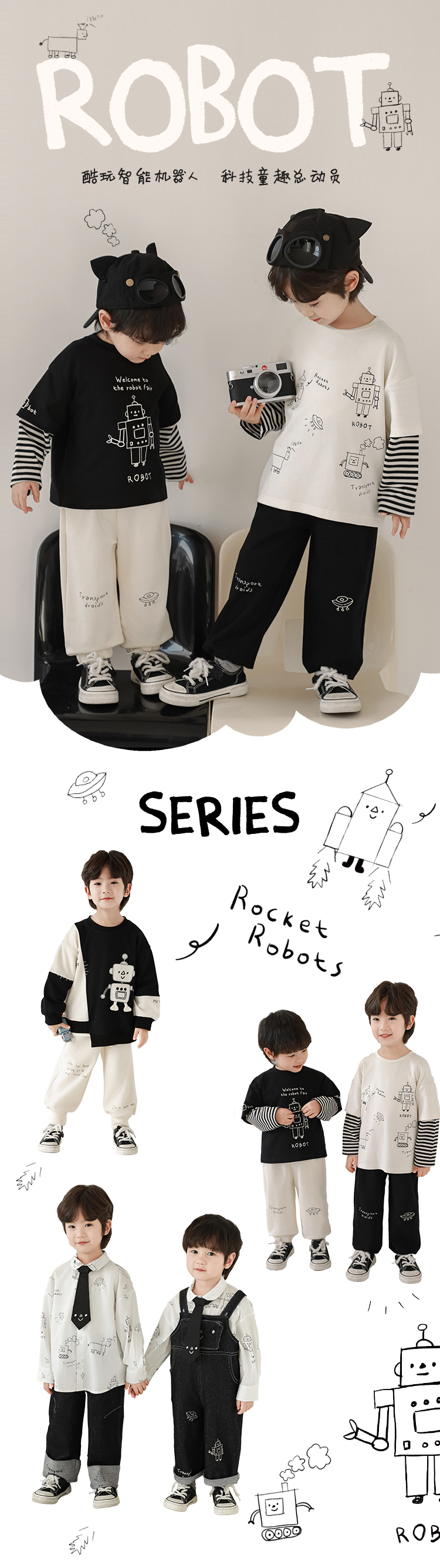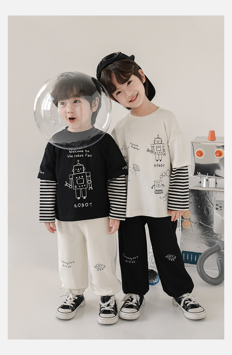 Wurib 소년 로봇 인쇄 대비 줄무늬 무료 어깨 가짜 두 티셔츠 가을 캐주얼 탑스토어 가기