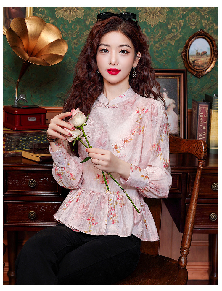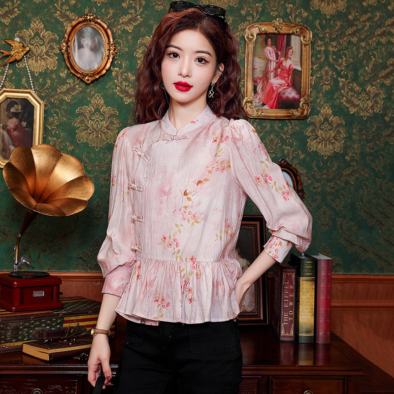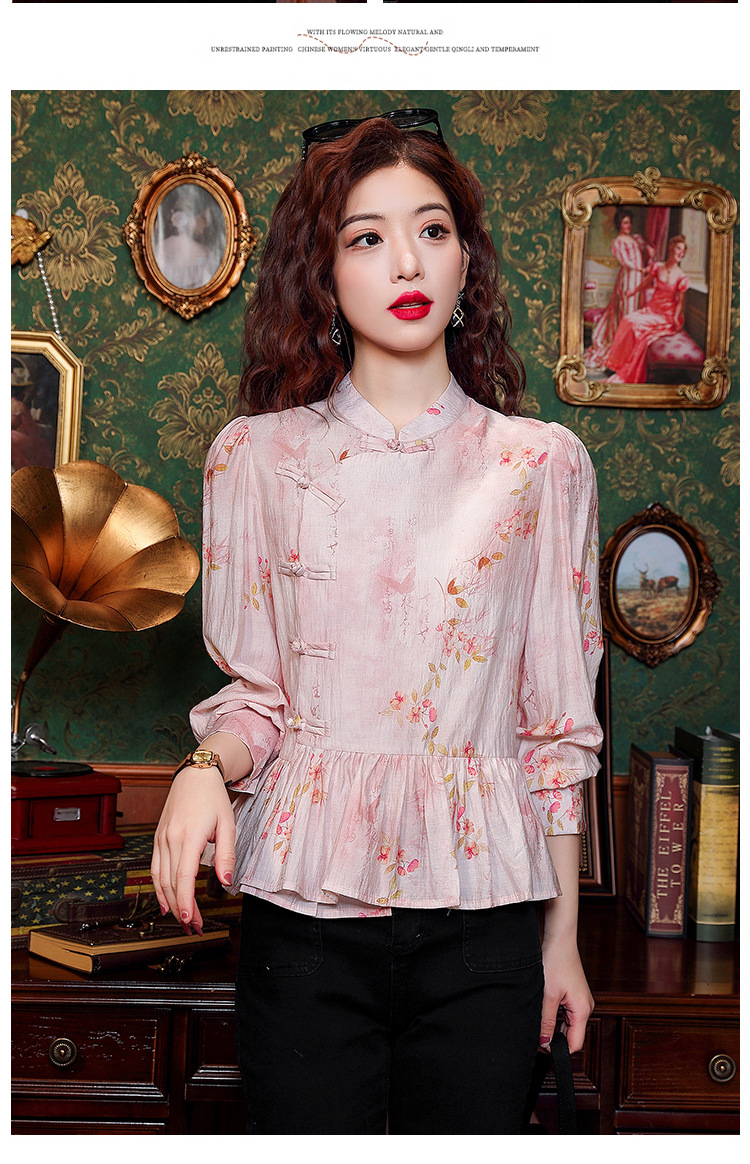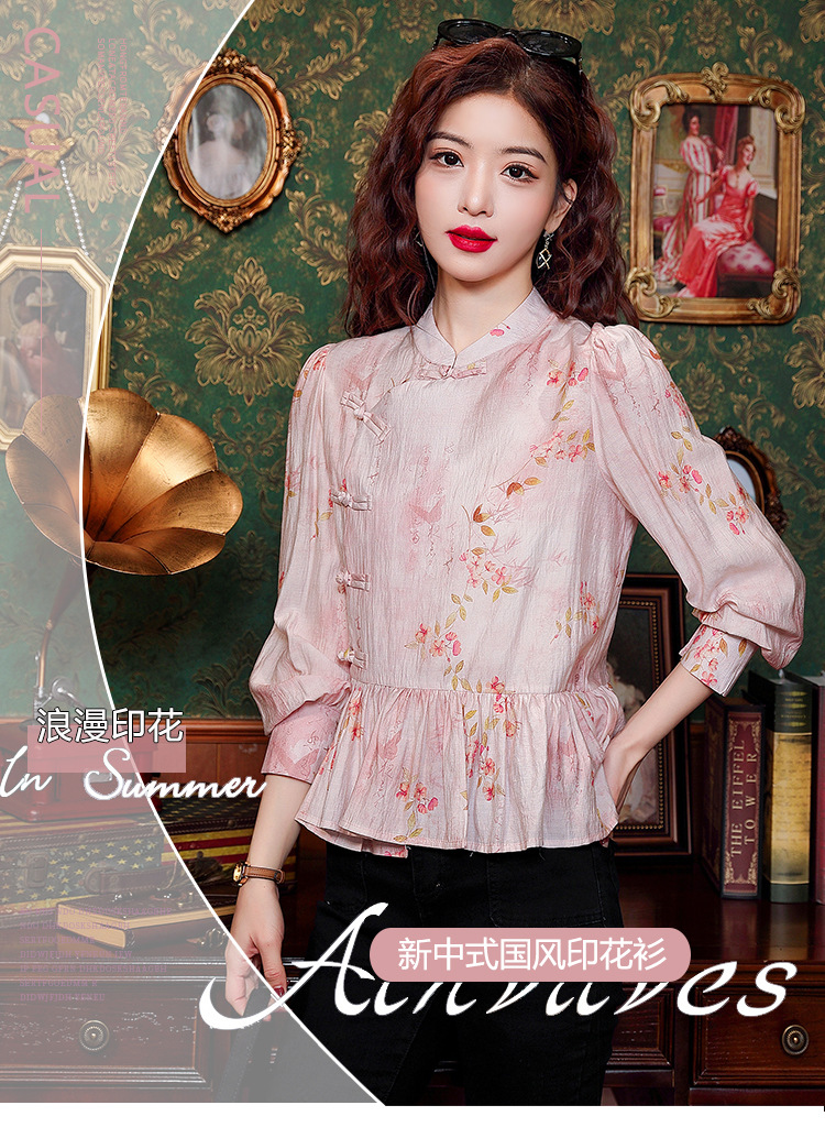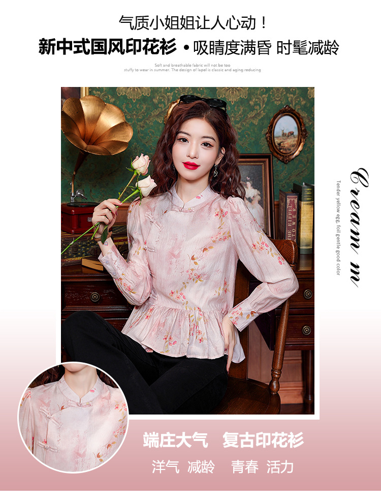 새로운 중국 스타일 국가 스타일 꽃 쉬폰 셔츠 여성 여름 2024 새로운 달콤한 작은 셔츠 시대 감소 우아한 치마 탑