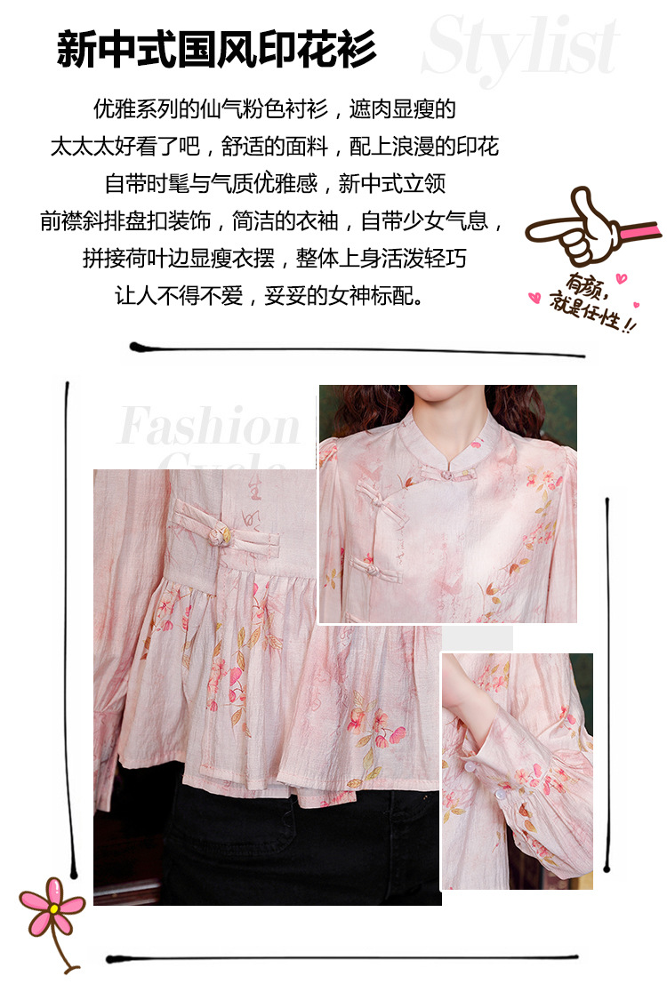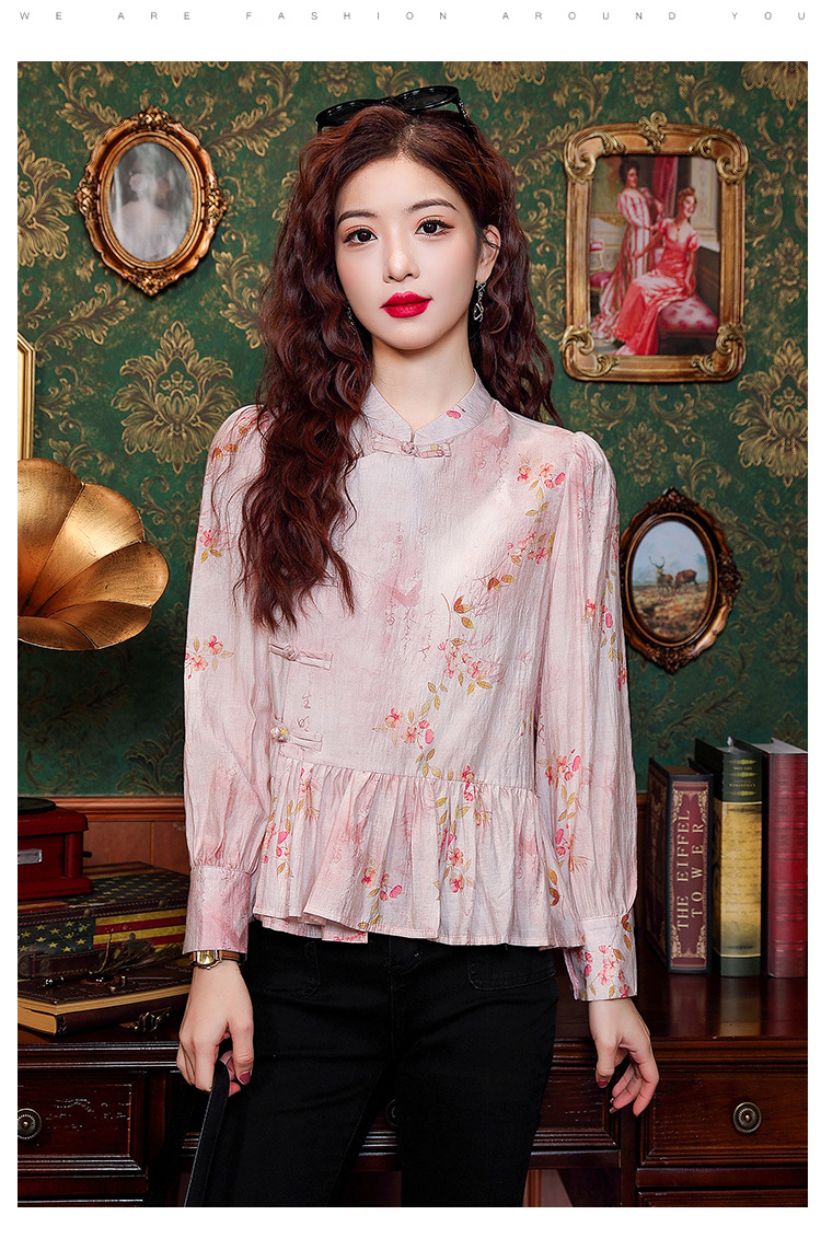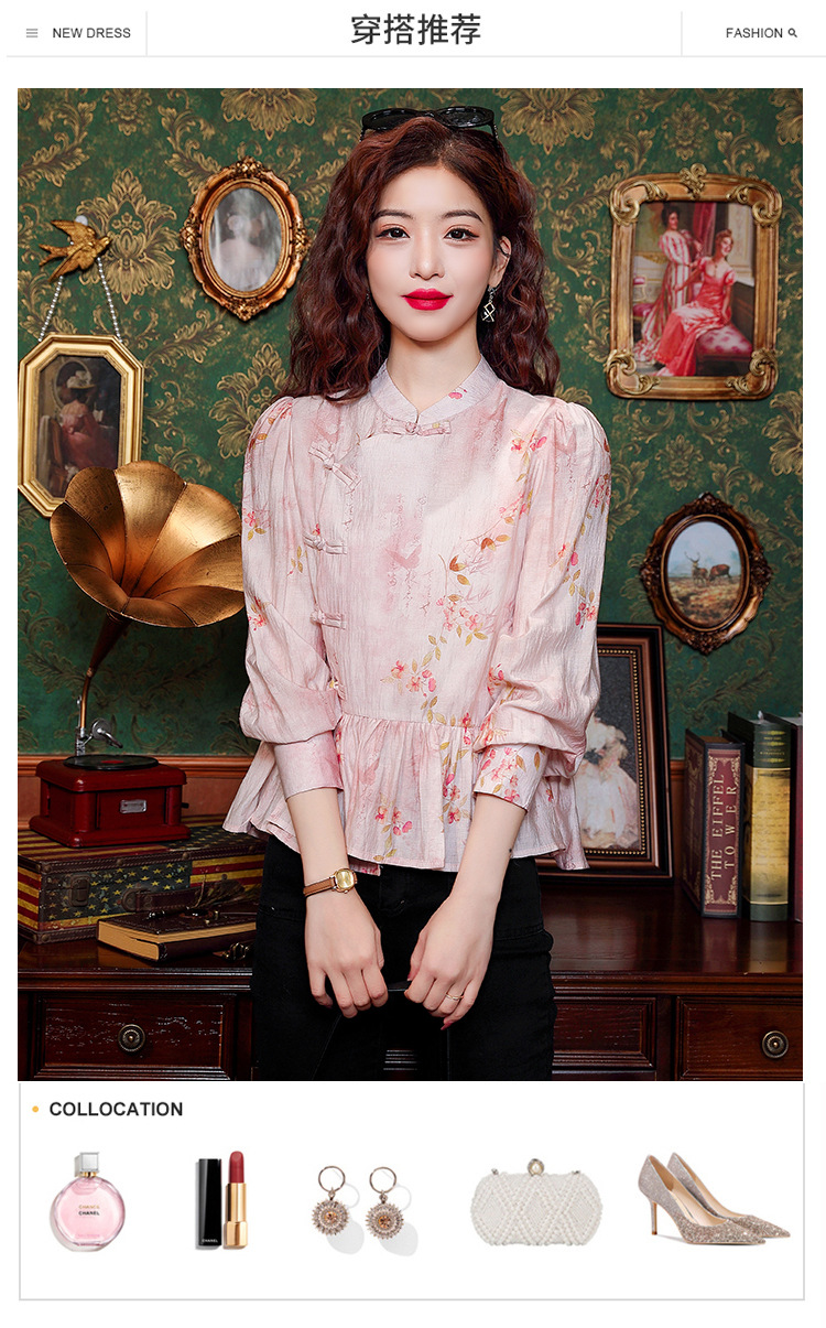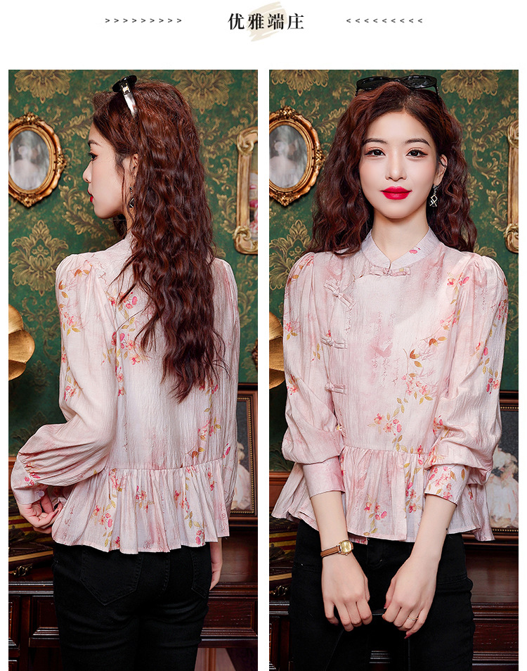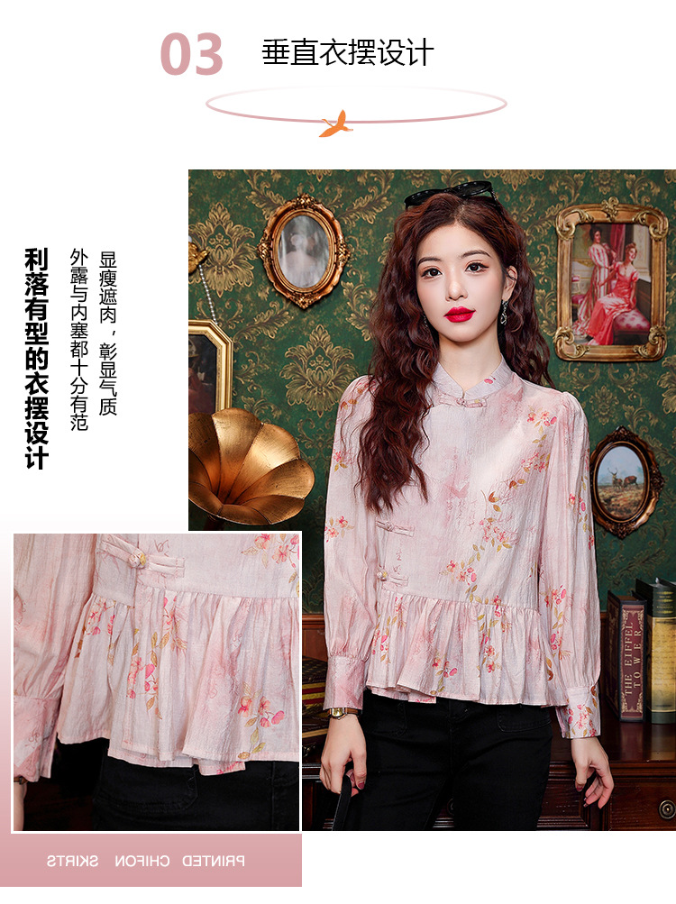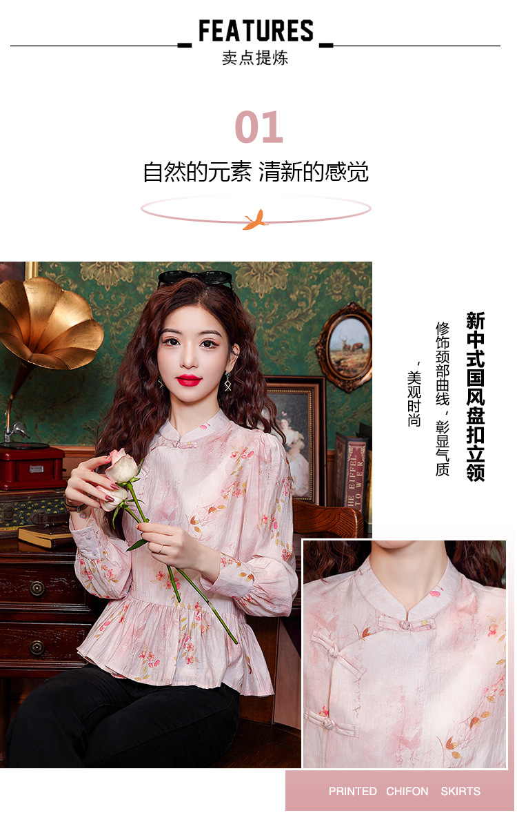 새로운 중국 스타일 국가 스타일 꽃 쉬폰 셔츠 여성 여름 2024 새로운 달콤한 작은 셔츠 시대 감소 우아한 치마 탑스토어 가기