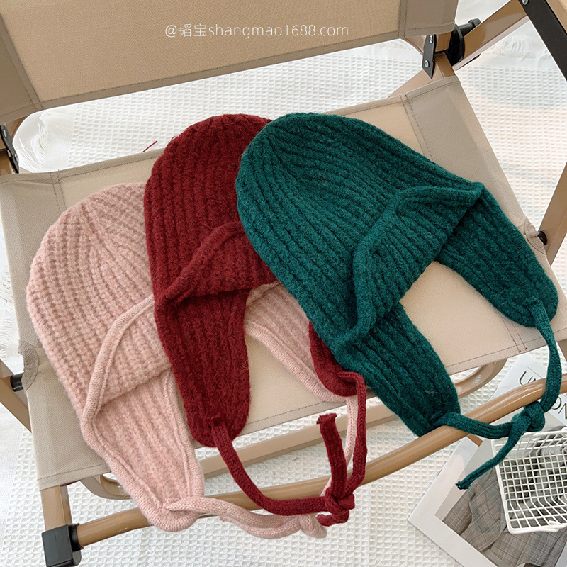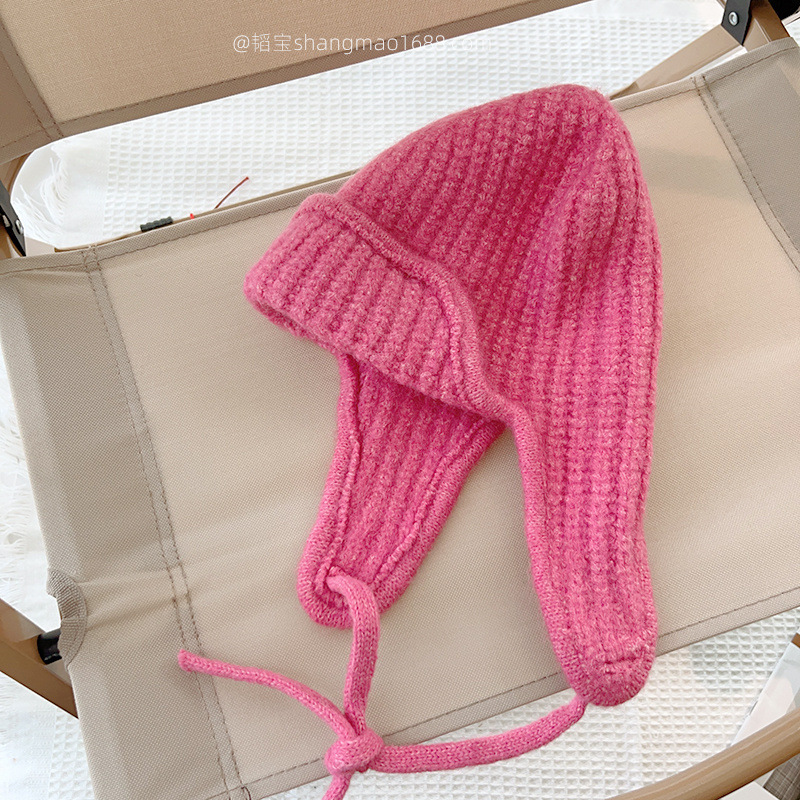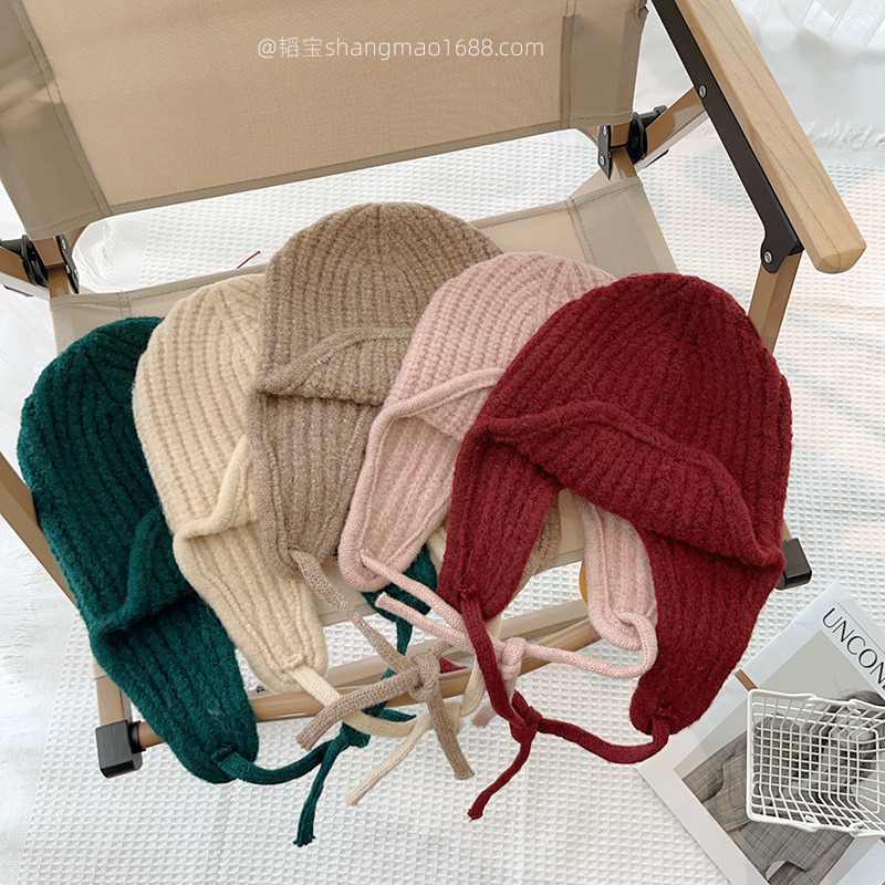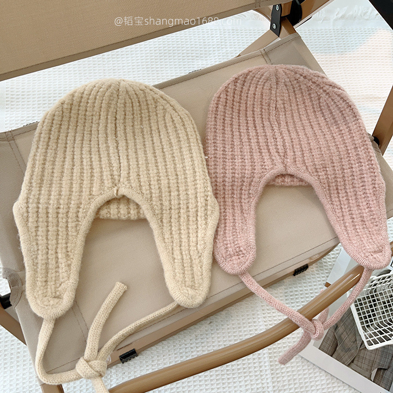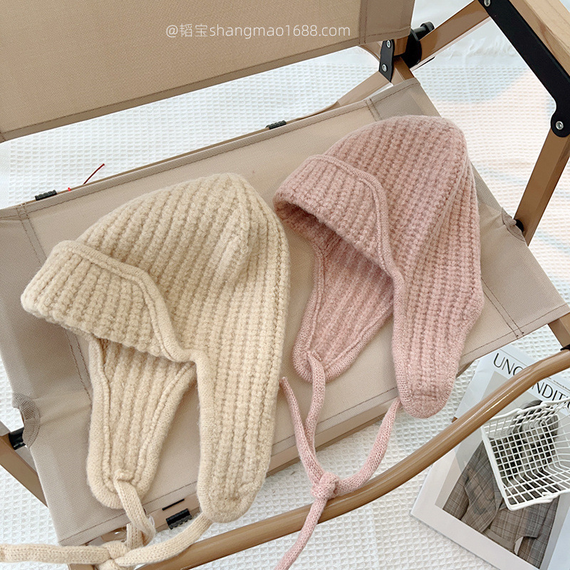 한국 어린이 니트 모자 귀 보호 모자 가을과 겨울 단색 레이스 따뜻한 모자 아기 겨울 착용 울 모자