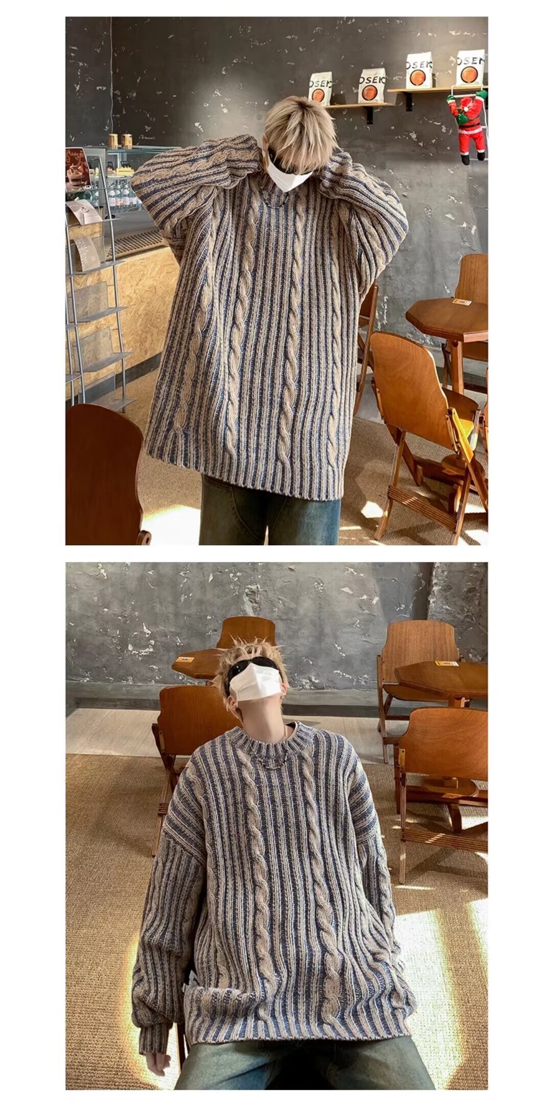느슨한 더블 페이스 데님 컬러 크루 넥 스웨터 남성 레트로 트위스트 스트라이프 콘트라스트 컬러 캐주얼 스웨터 커플스토어 가기