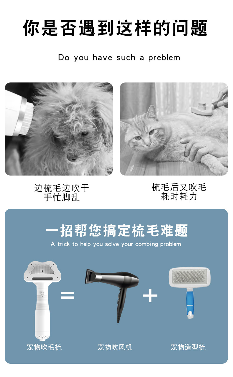 2 대 1 애완 동물 헤어 드라이어 고양이 뜨거운 공기 청소 통합 블로우 건조 빗 개 오픈 매듭 원 키 머리 제거 애완 동물 빗