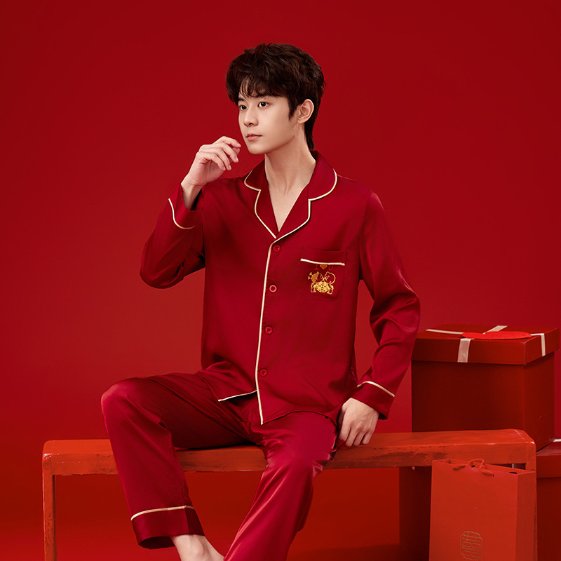 커플 잠옷 결혼식 신혼 아이스 실크 봄과 가을 생활 년 붉은 남자와 여자의 결혼식 높은 수준의 홈 의류 세트스토어 가기