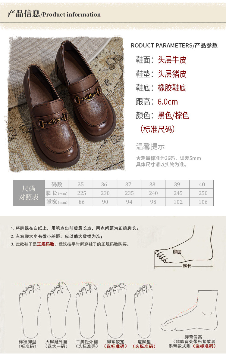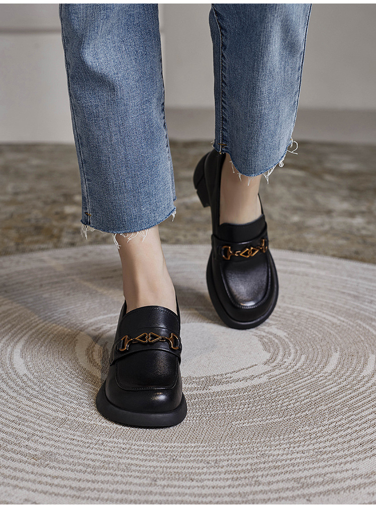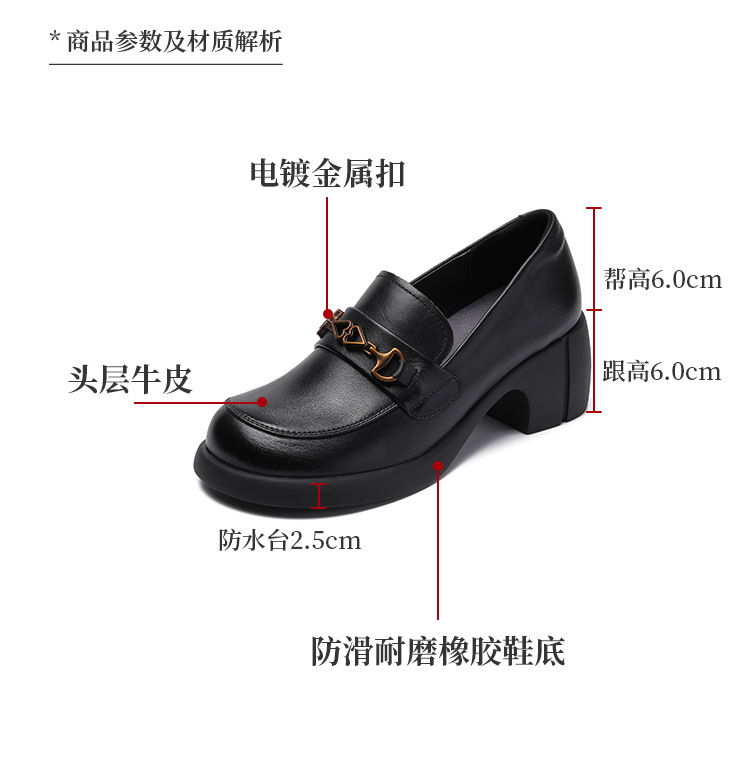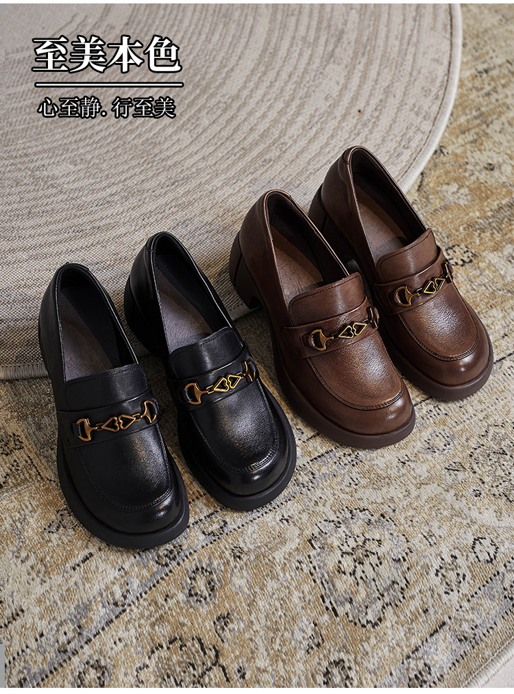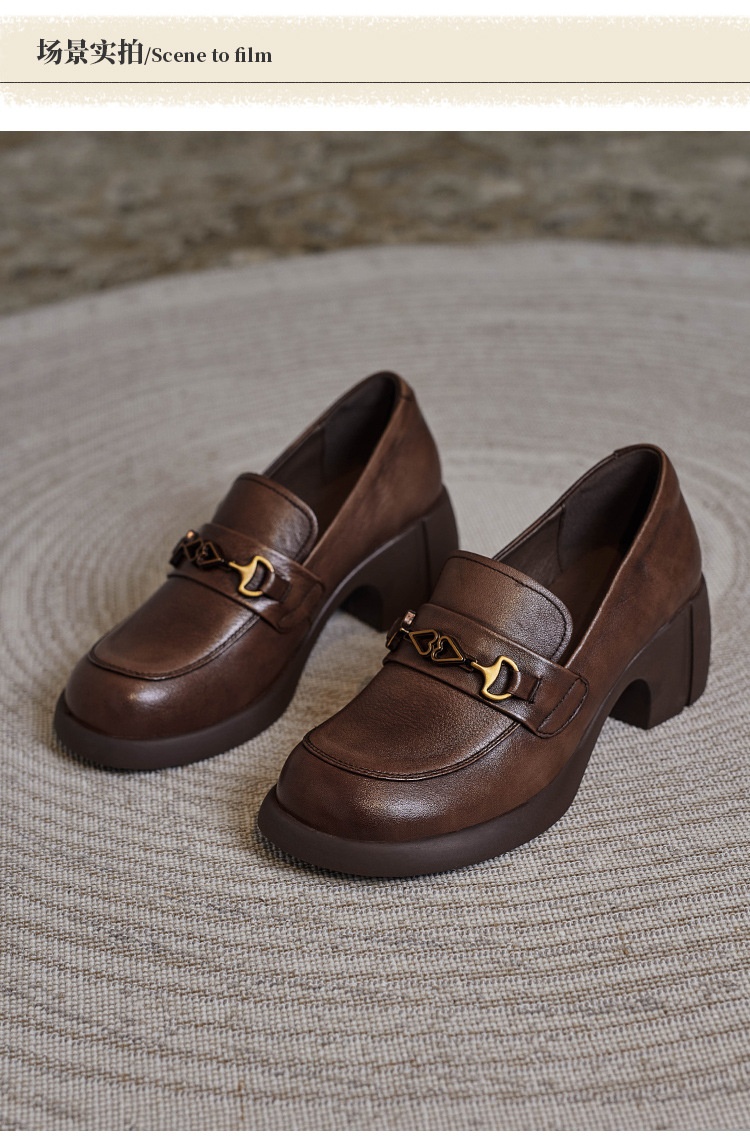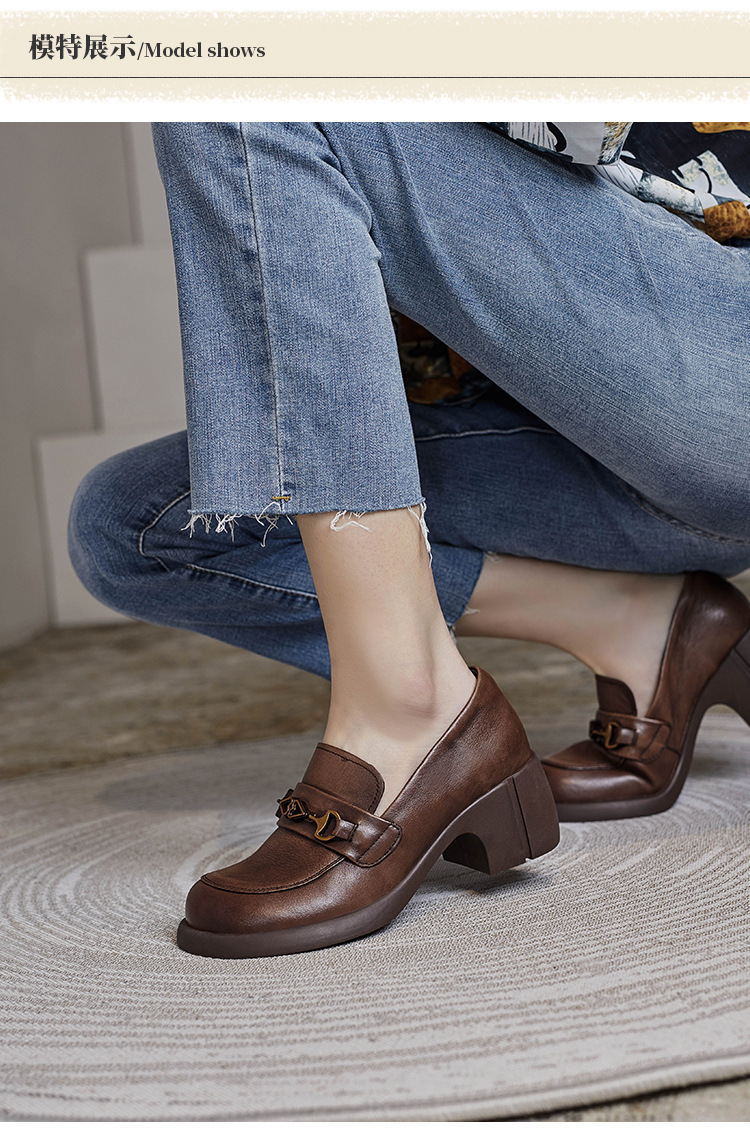 정품 가죽 로퍼 2024 새로운 봄과 가을 슬립 온 청키 힐 미드 힐 싱글 레이어 신발 빈티지 여성용 캐주얼 작은 가죽 신발스토어 가기