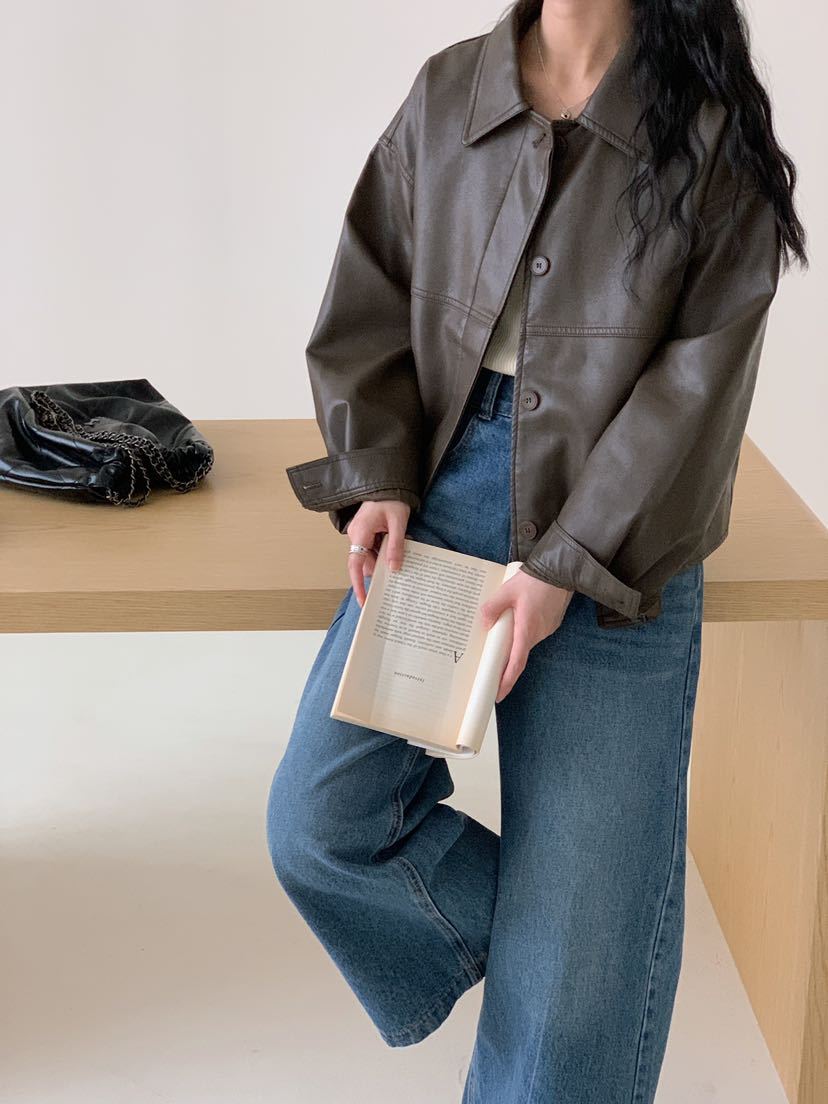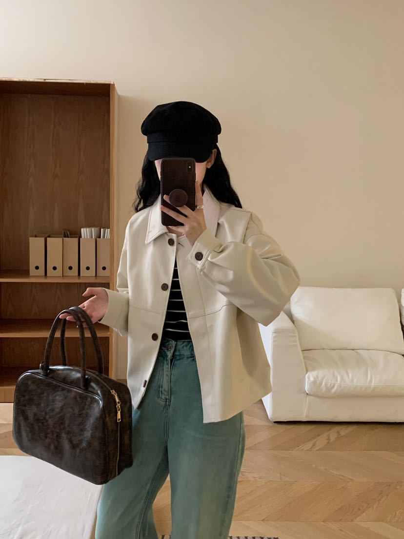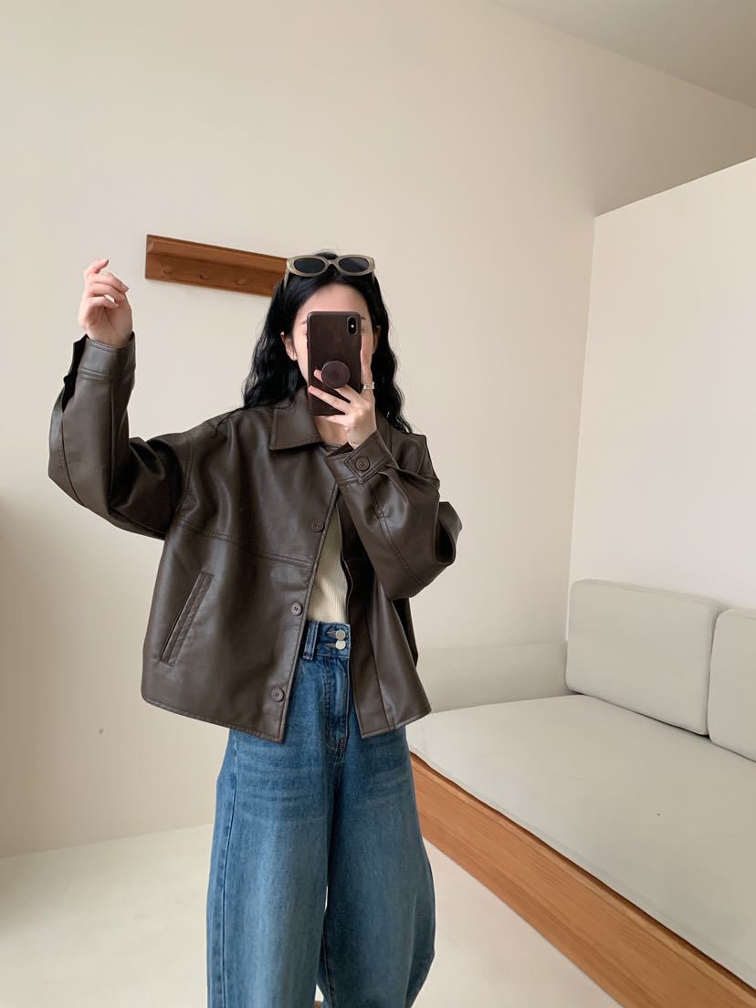 2024 한국 스타일 우아한 슬림 핏 짧은 가죽 코트 여성 가을 올 매치 퓨어 옷깃 캐주얼 자켓스토어 가기