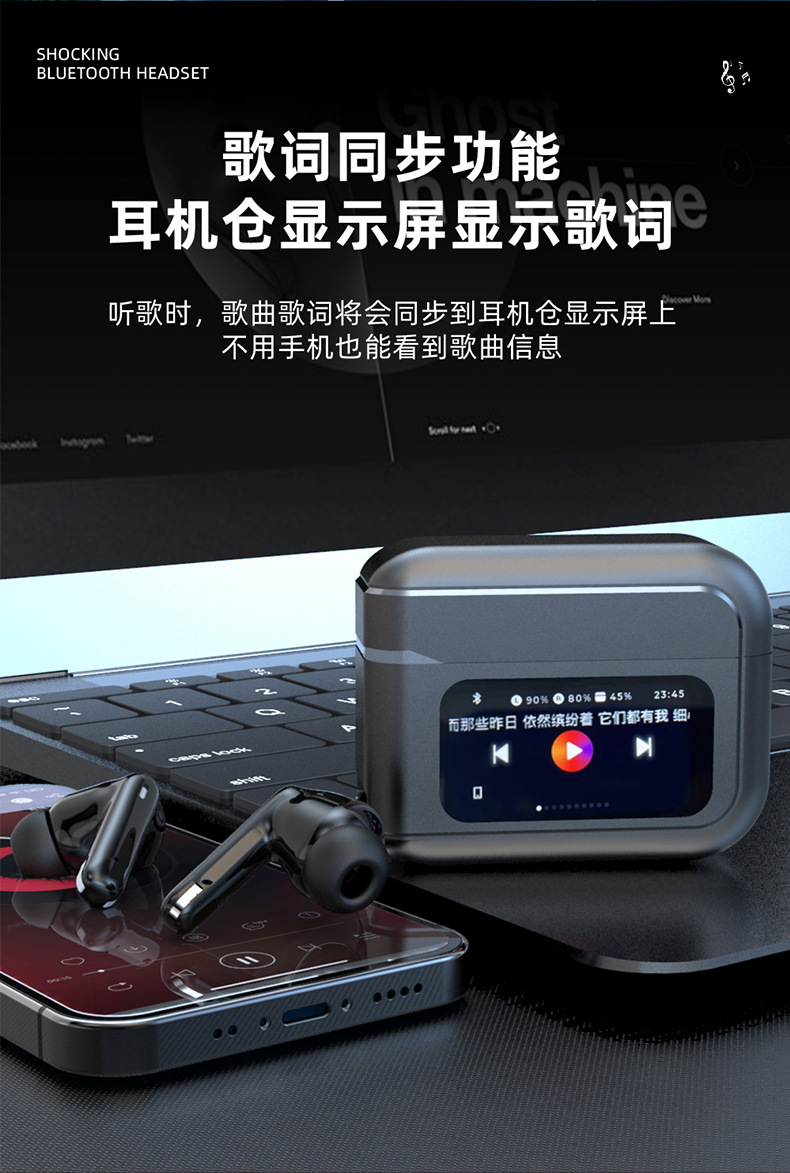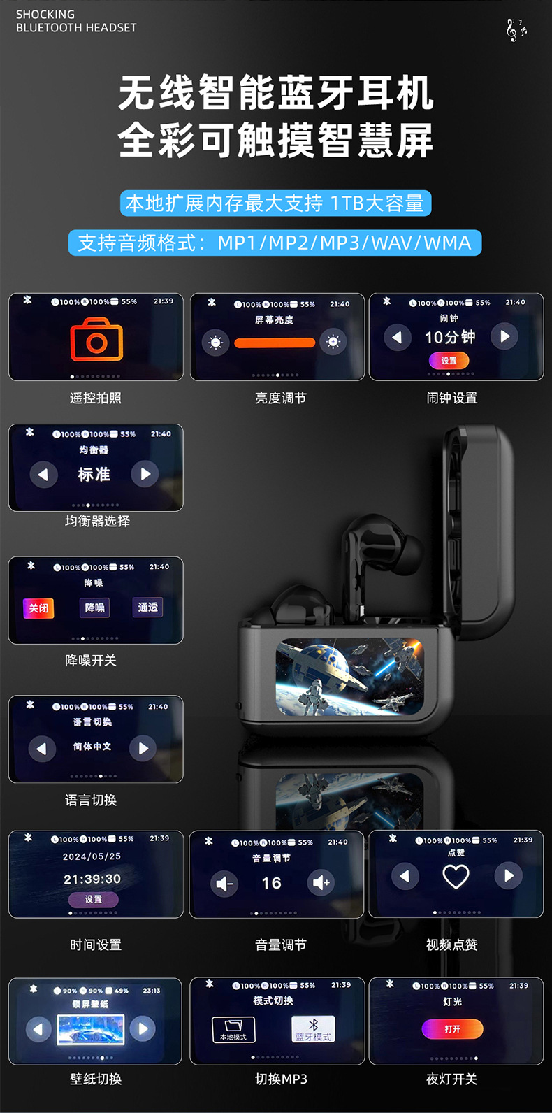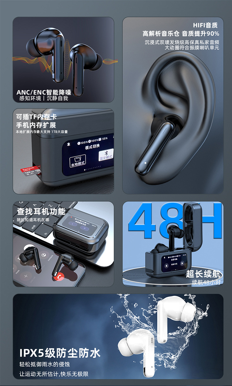 T20 풀 컬러 스마트 스크린 블루투스 헤드셋 64G 로컬 메모리 ANC 소음 감소 국경 아마존 무선 헤드셋