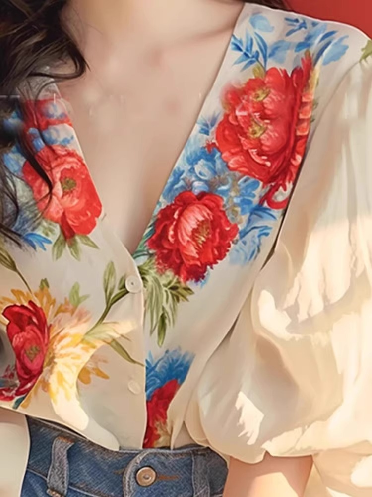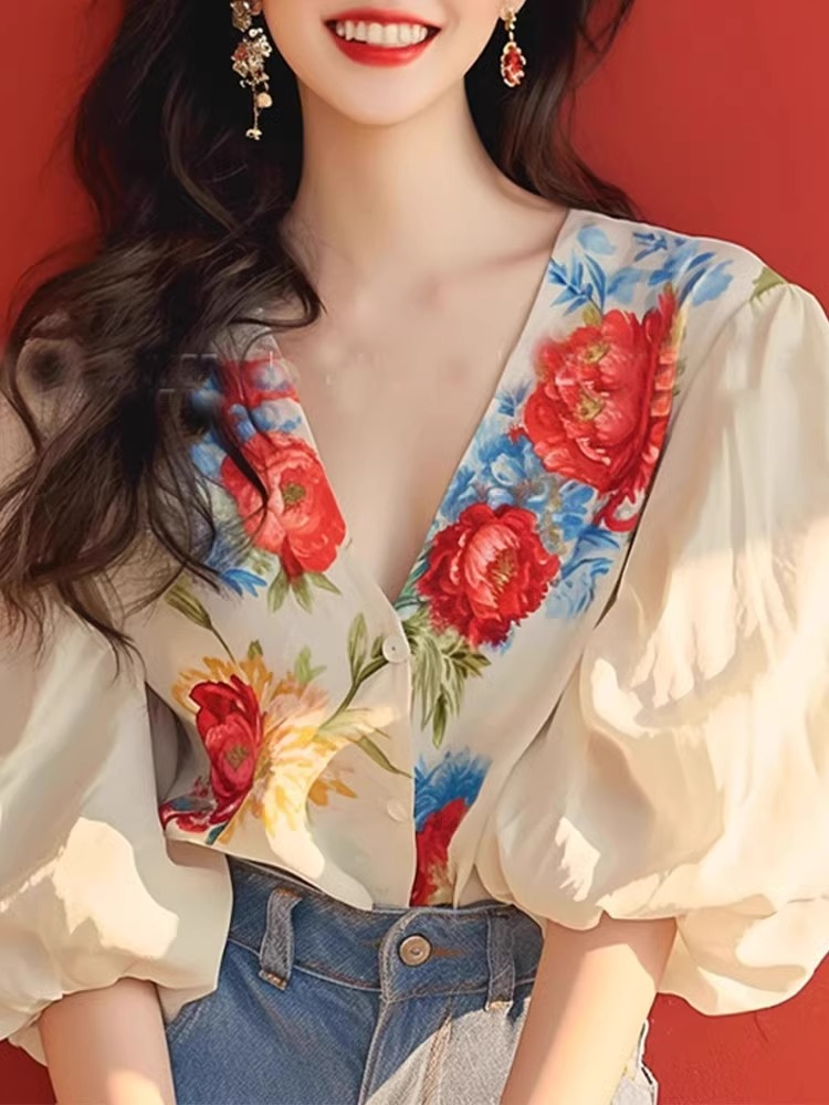 올해 인기있는 독특한 아름다운 작은 셔츠 꽃 느슨한 버블 소매 여성 2024 여름 새 셔츠