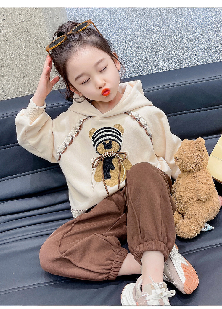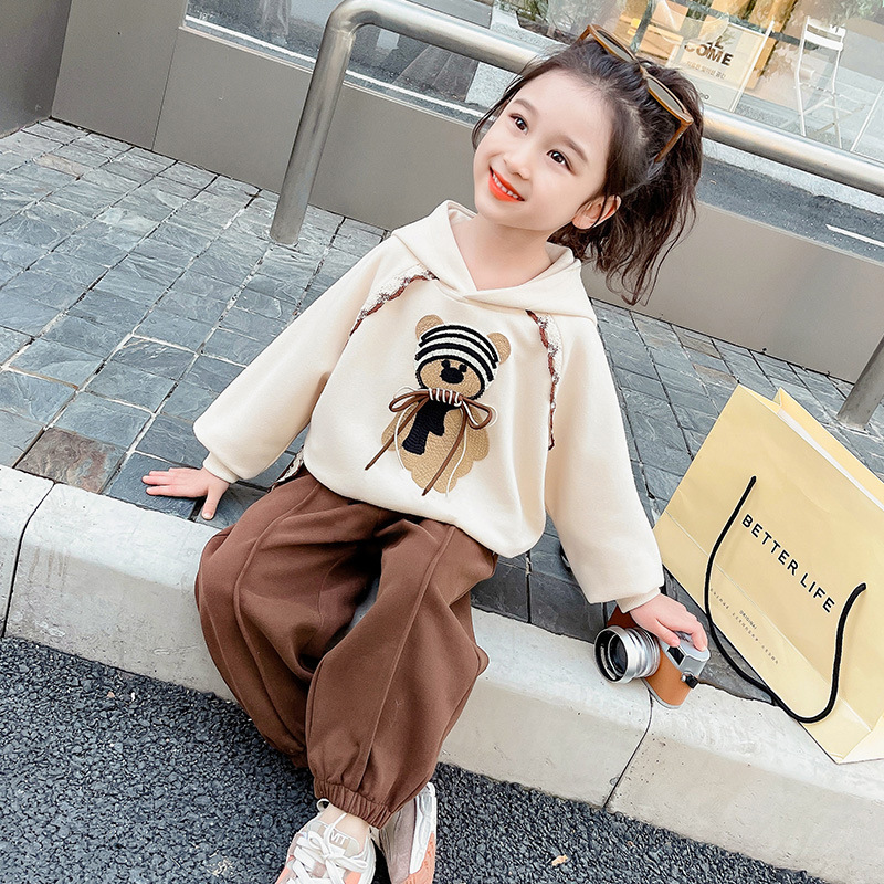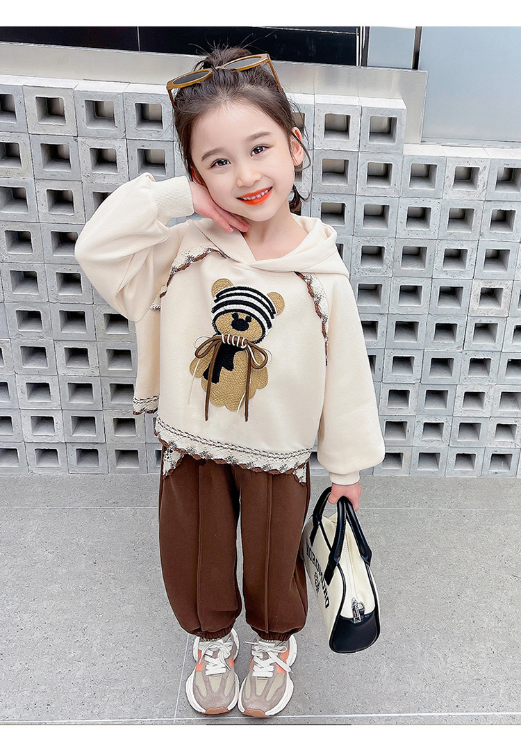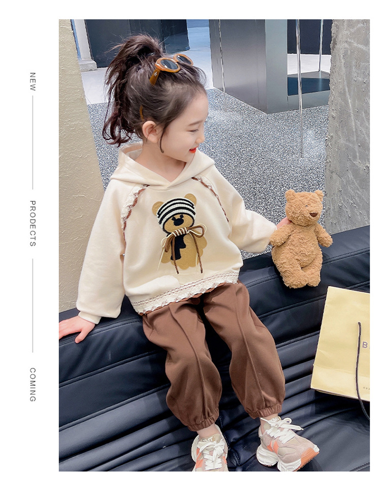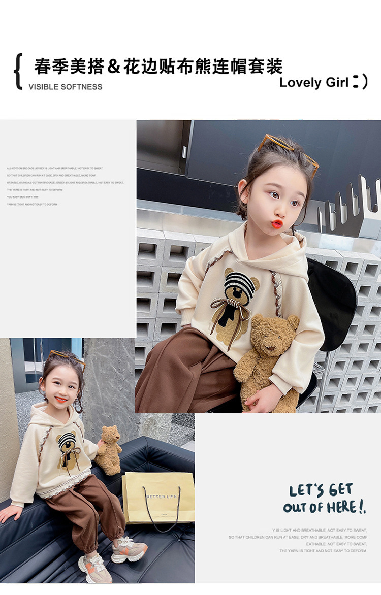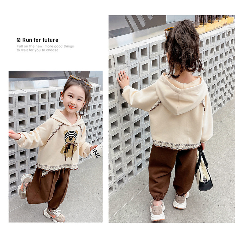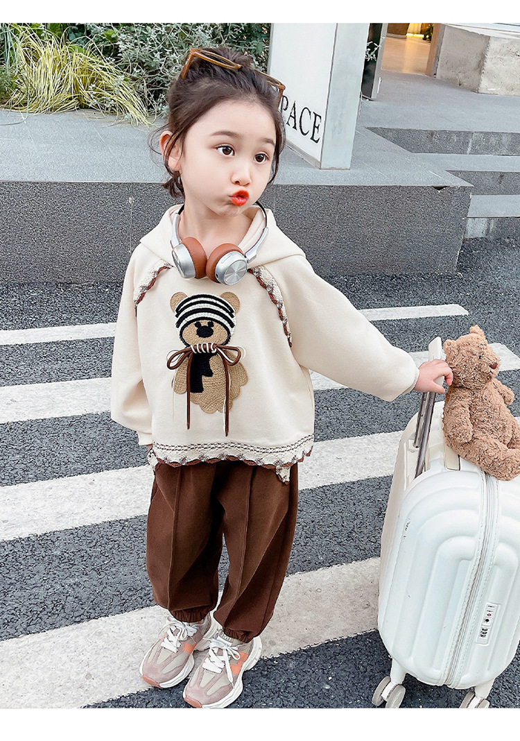 소녀의 봄과 가을 의류 레이스 핏 베어 후드 세트 어린이 스타일리제 봄 땀 어린이 한국 투피스 세트