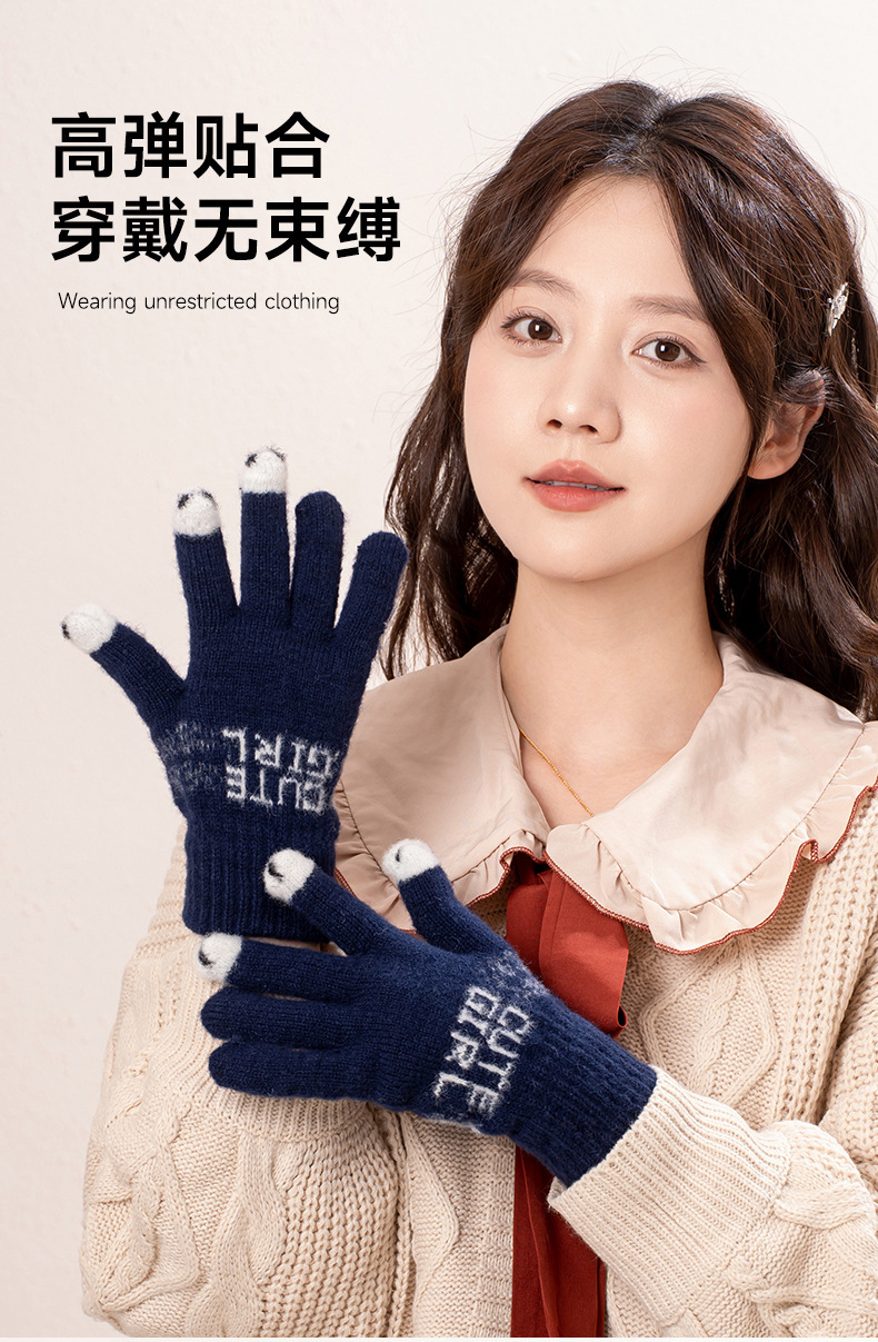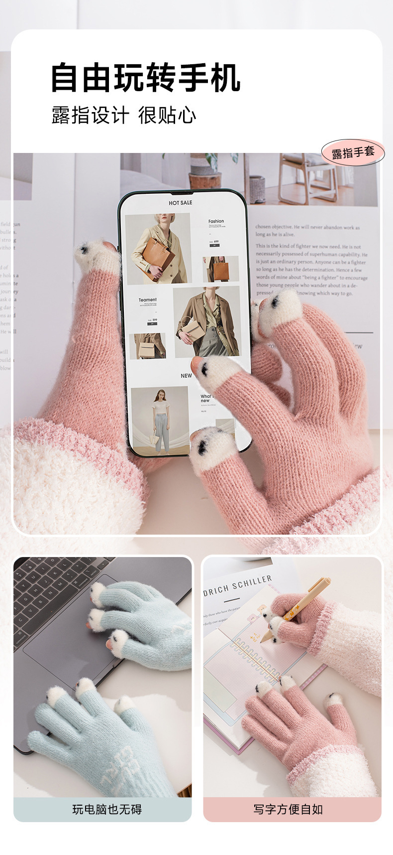 가을 겨울 여성용 니트 장갑, 따뜻하고 방한 기능이 있는 벨벳 장갑, 학생용 세 손가락 노출형 글쓰기 및 터치스크린 디자인