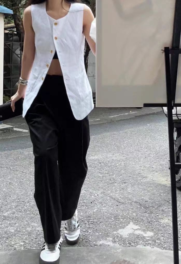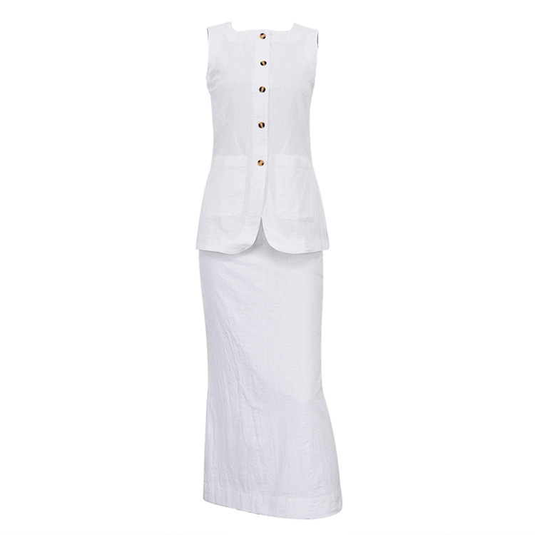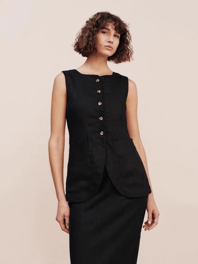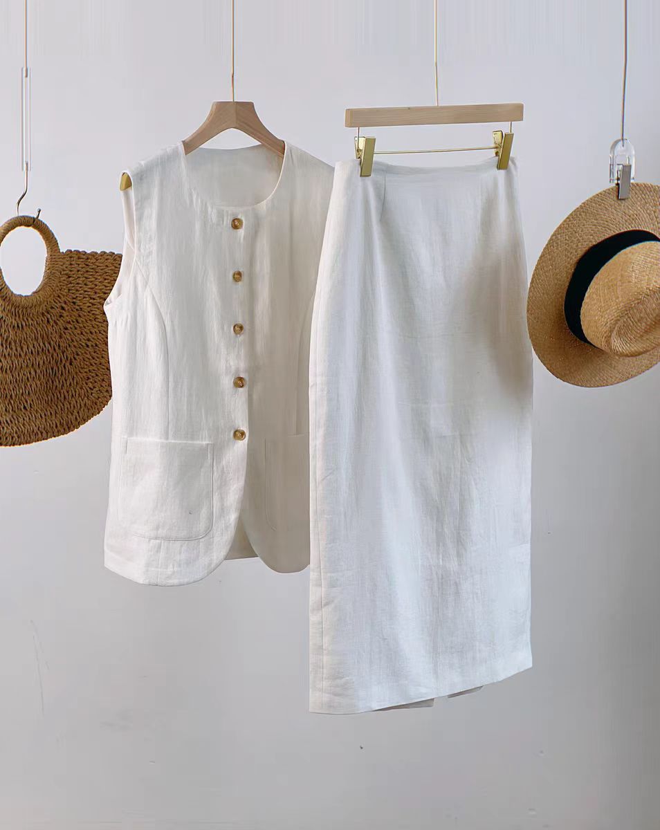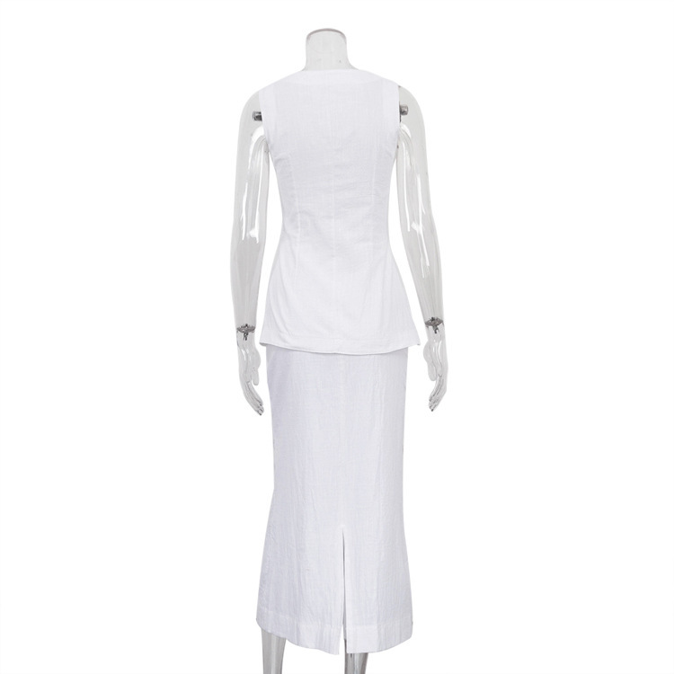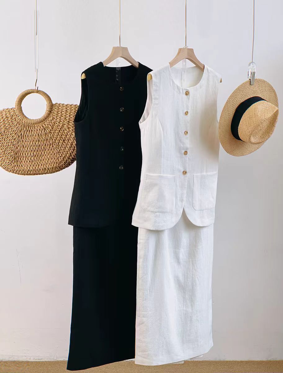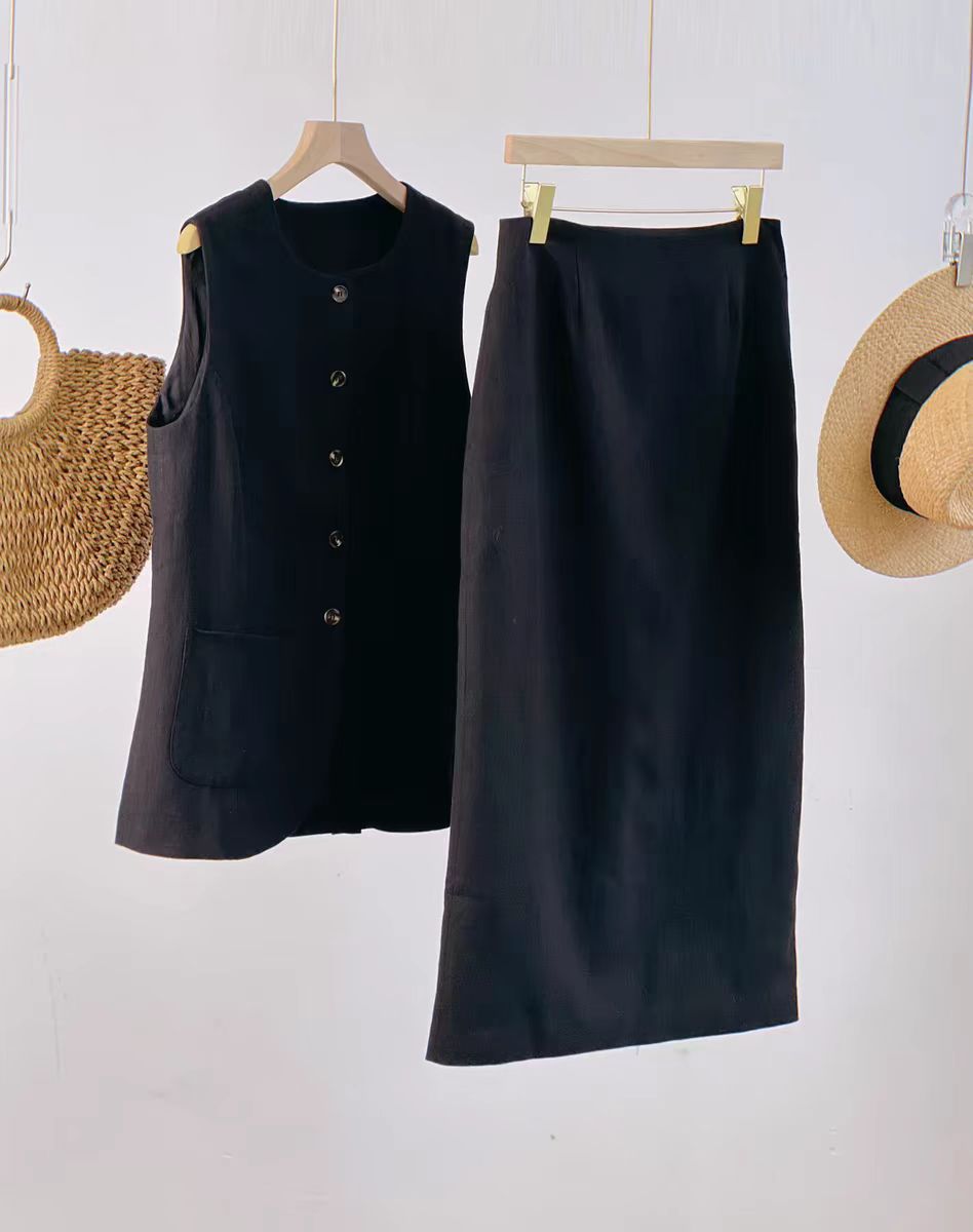 2025년 유럽 및 미국 신상 여성 의류, 블랙&화이트 스퀘어넥 민소매 조끼와 하이웨이스트 스커트로 구성된 고급스러운 세트