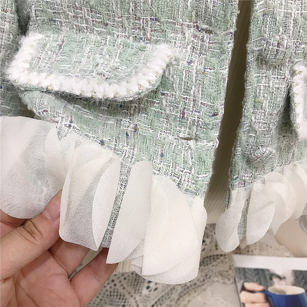 봄과 가을 스타일 샤넬 격자 무늬 녹색 레이스 라운드 넥 싱글 가슴 코트 소녀베이스 셔츠 케이크 스커트 대외 무역스토어 가기