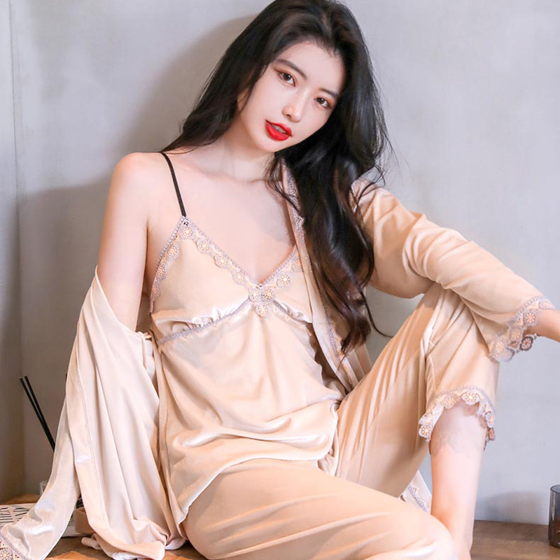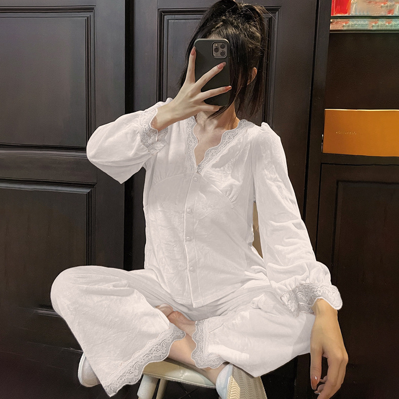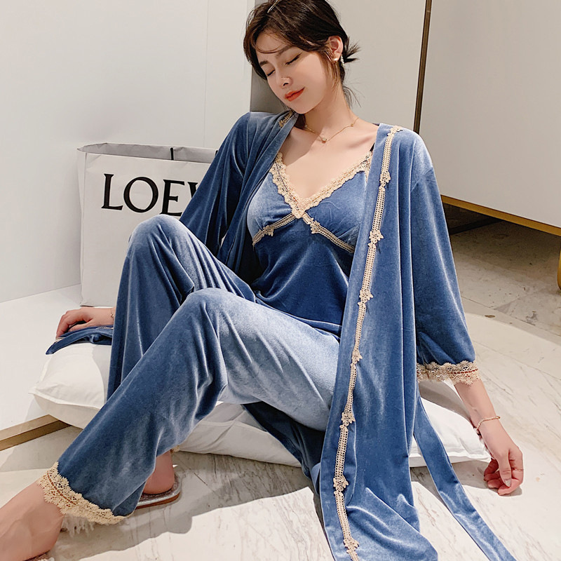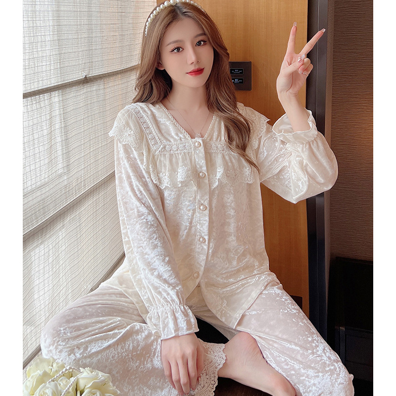 프랑스 복고풍 궁전 스타일 골드 벨벳 잠옷 여성의 가을과 겨울 긴팔 세트 새 집 옷 세트 도매스토어 가기