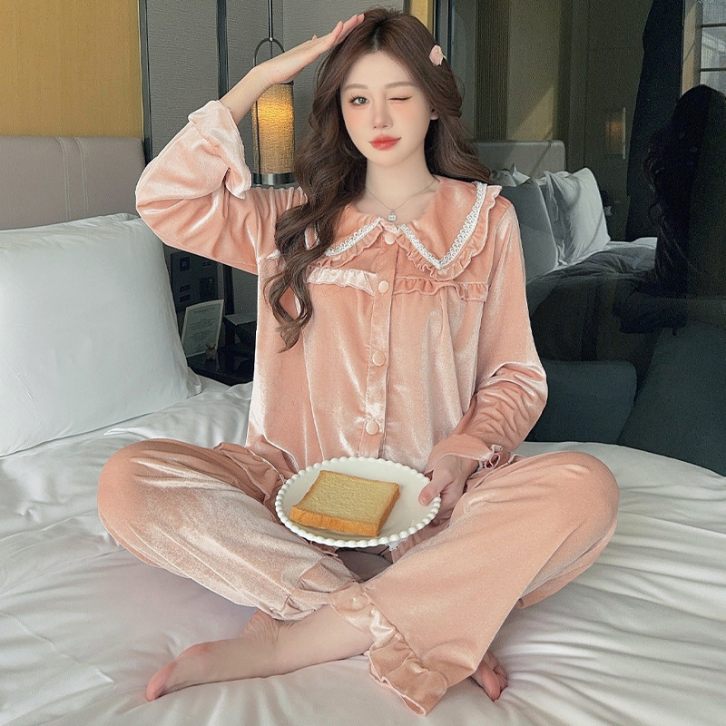 프랑스 복고풍 궁전 스타일 골드 벨벳 잠옷 여성의 가을과 겨울 긴팔 세트 새 집 옷 세트 도매