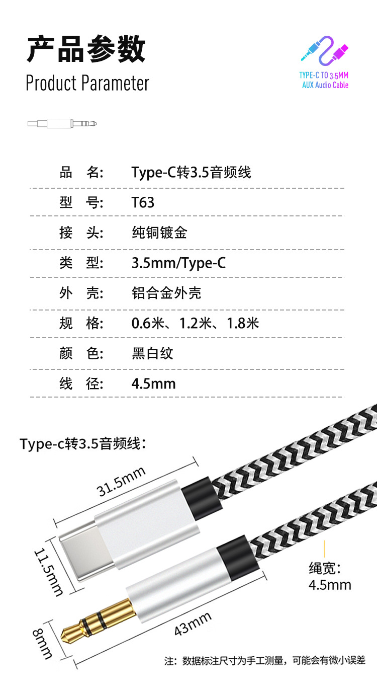 Typec ~ 3.5 디지털 오디오 케이블 AUX Apple Huawei 오디오 편조 케이블에 적합 자동차 스피커 어댑터 케이블
