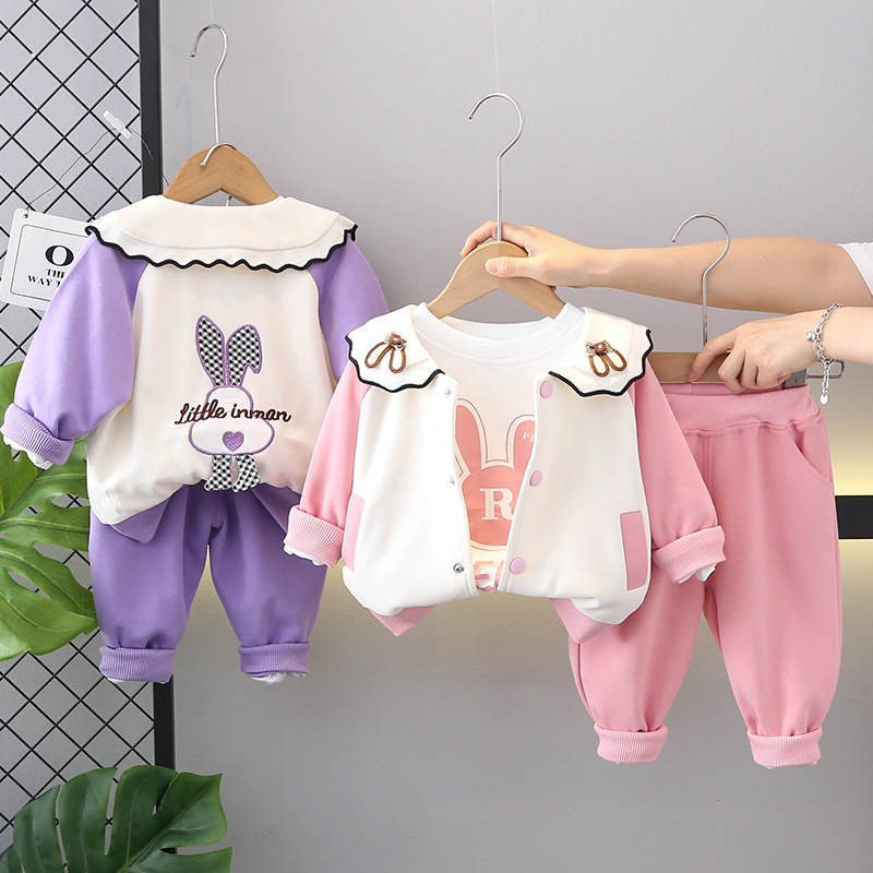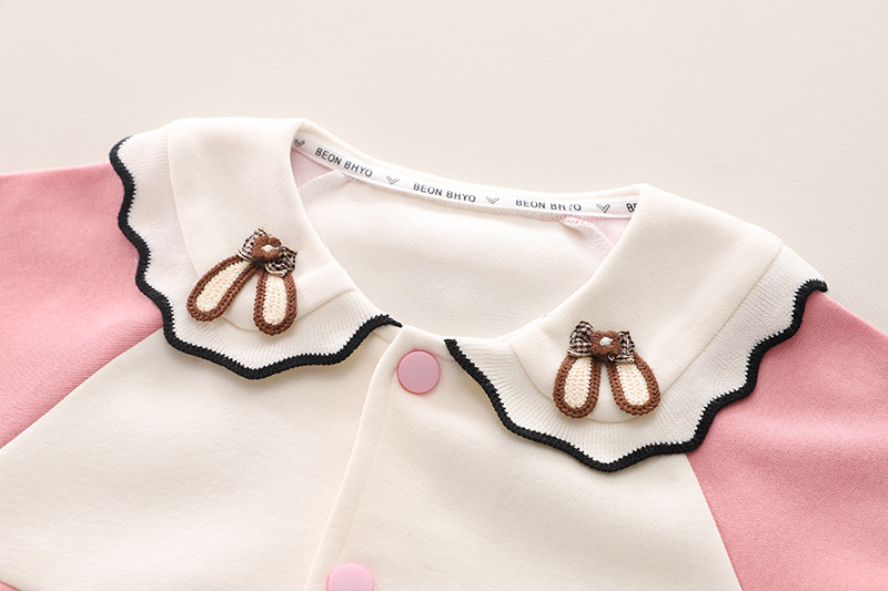 여자 0-4 세 토끼 야구 세트 3 조각 레이스 옷깃 주머니 귀여운 만화 세트스토어 가기