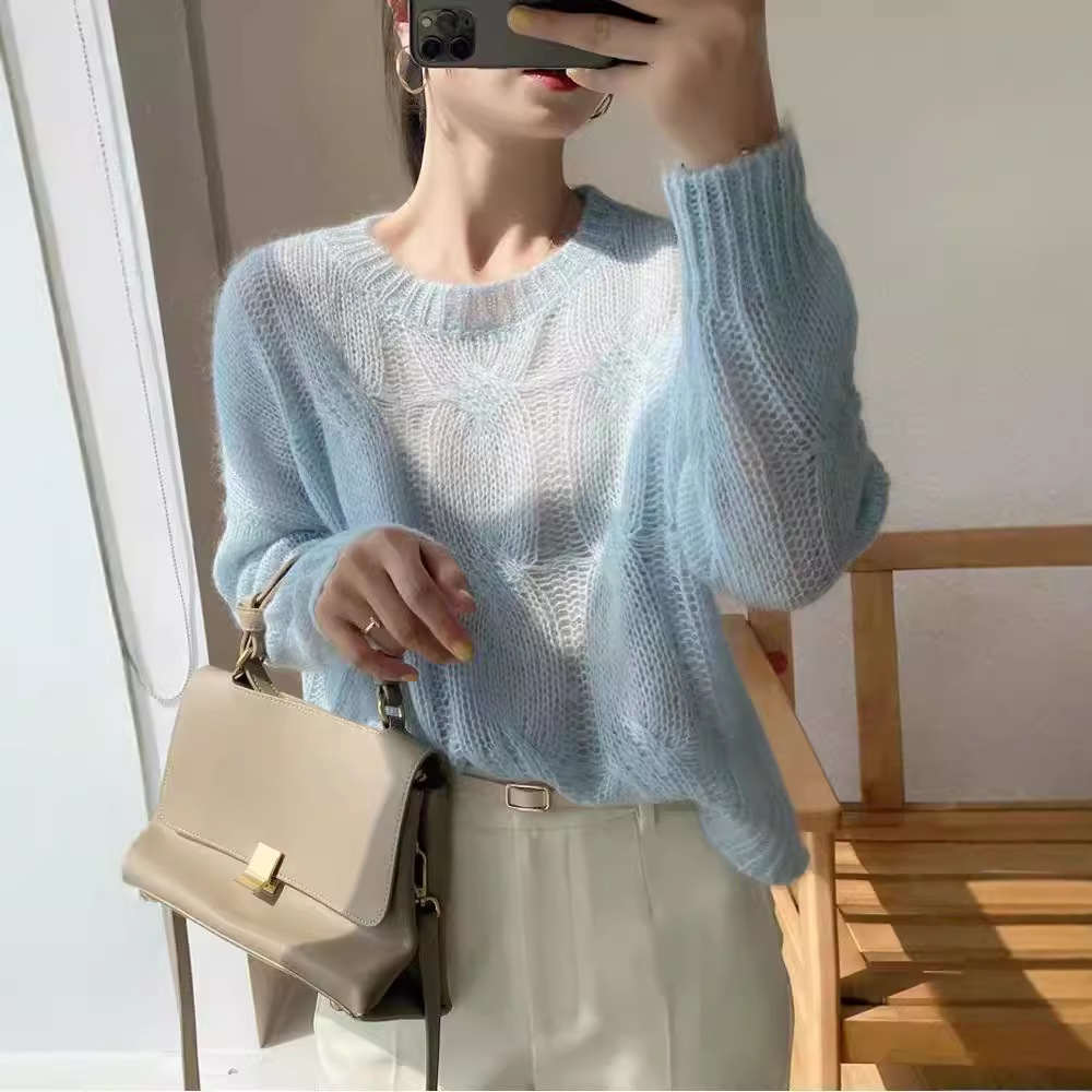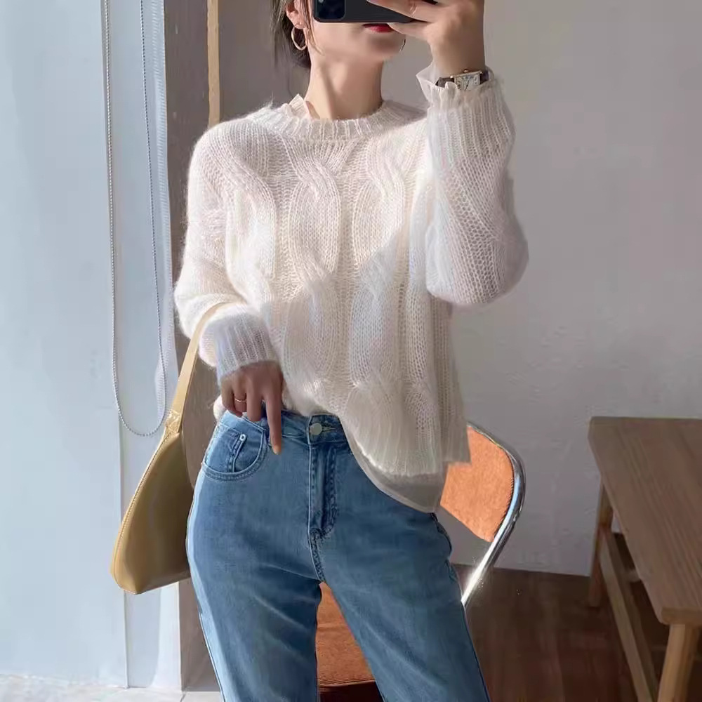 2024 년 새로운 가을 인테리어 게으른 스타일 중공 라운드 넥 트위스트 스웨터 느슨한 올 매치 긴 소매 니트 탑